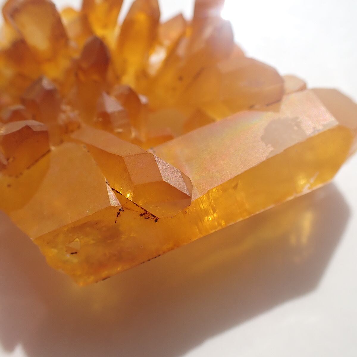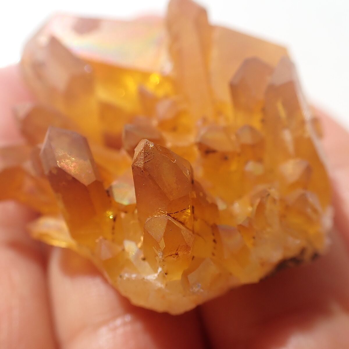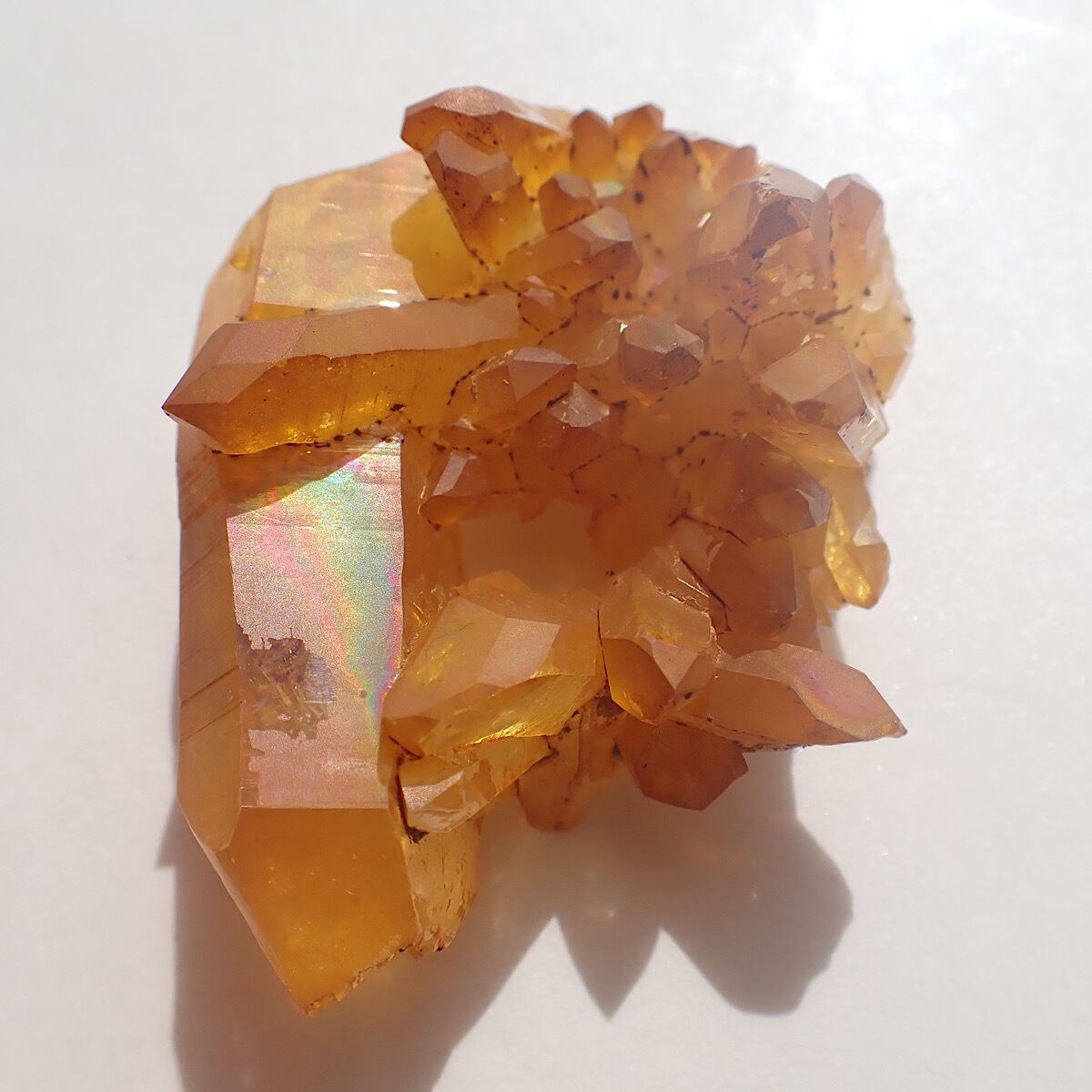 アメリカ・アーカンソーのゴールデンヒーラーのミニクラスターです。オーラフレイムと呼ばれる虹色の光彩が見られるゴールデンヒーラーはソラリスと呼ばれています。こちらのゴールデンヒーラーも虹が出ていてとても魅力的です。真ん中にある隙間がアートのようでもあります。