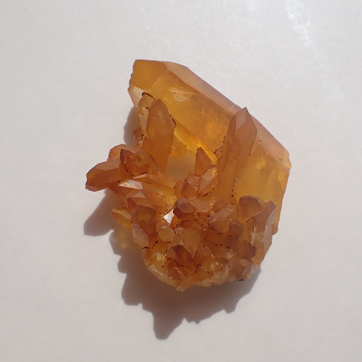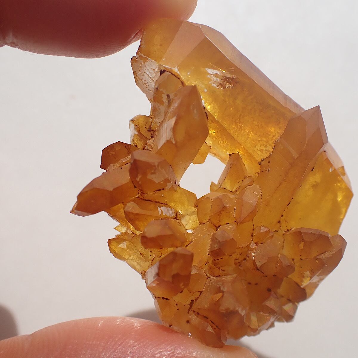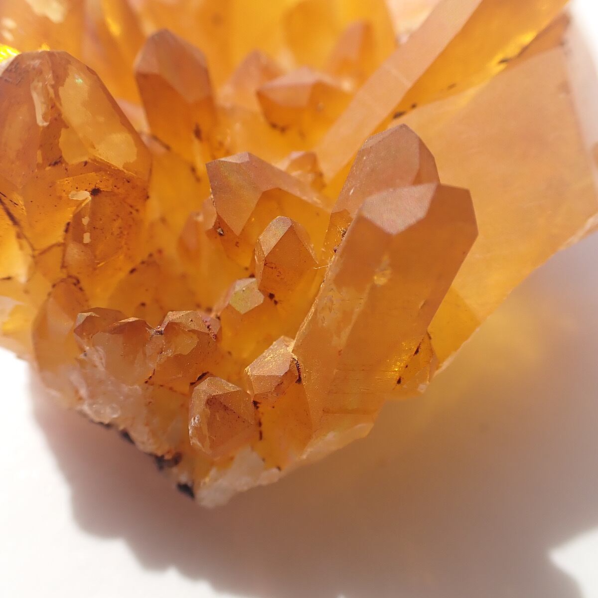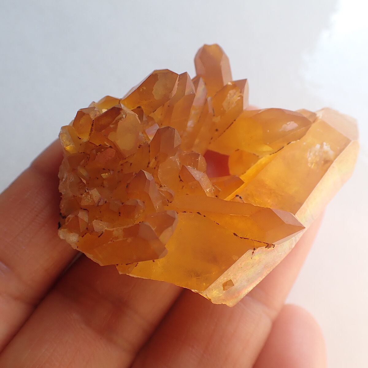 アメリカ・アーカンソーのゴールデンヒーラーのミニクラスターです。オーラフレイムと呼ばれる虹色の光彩が見られるゴールデンヒーラーはソラリスと呼ばれています。こちらのゴールデンヒーラーも虹が出ていてとても魅力的です。真ん中にある隙間がアートのようでもあります。