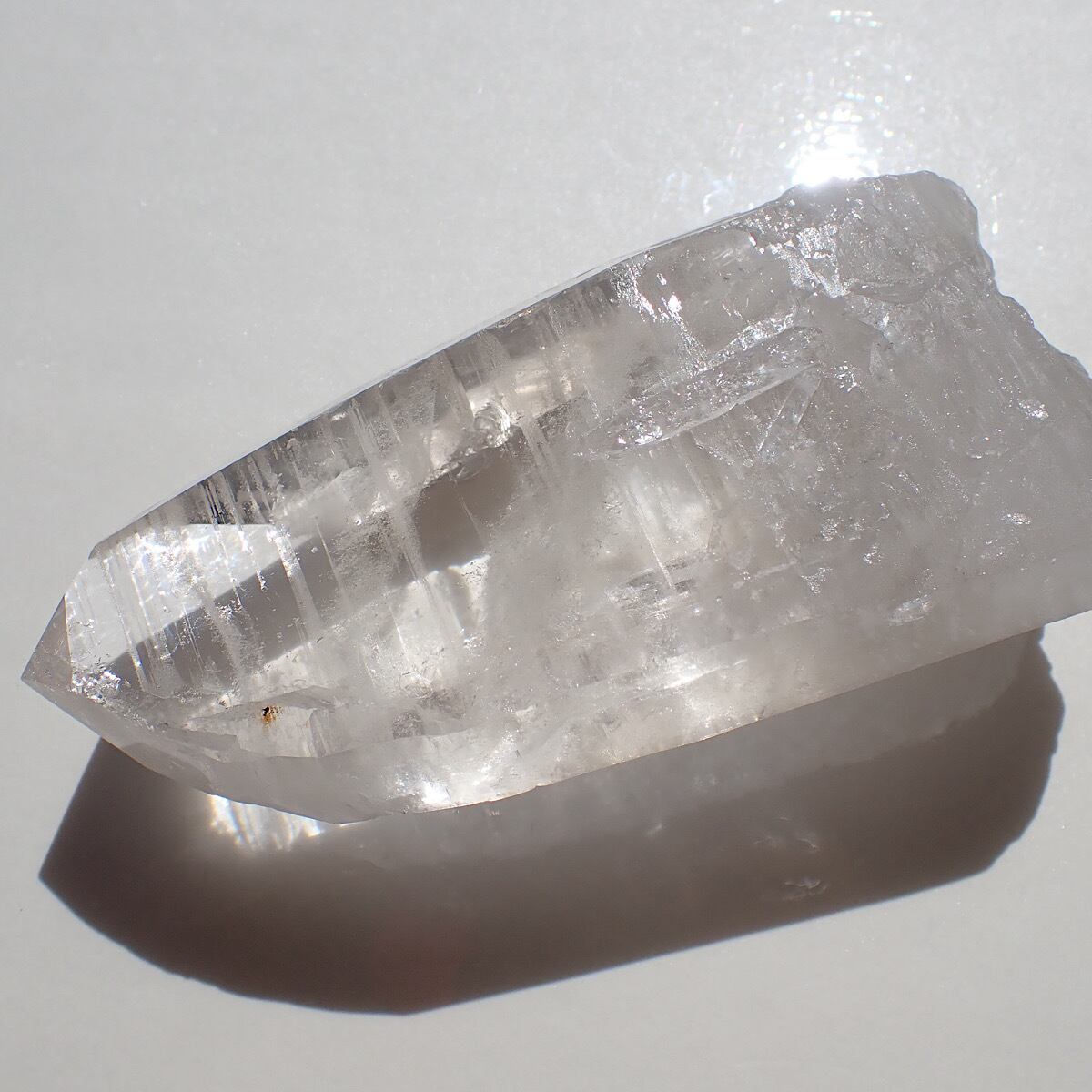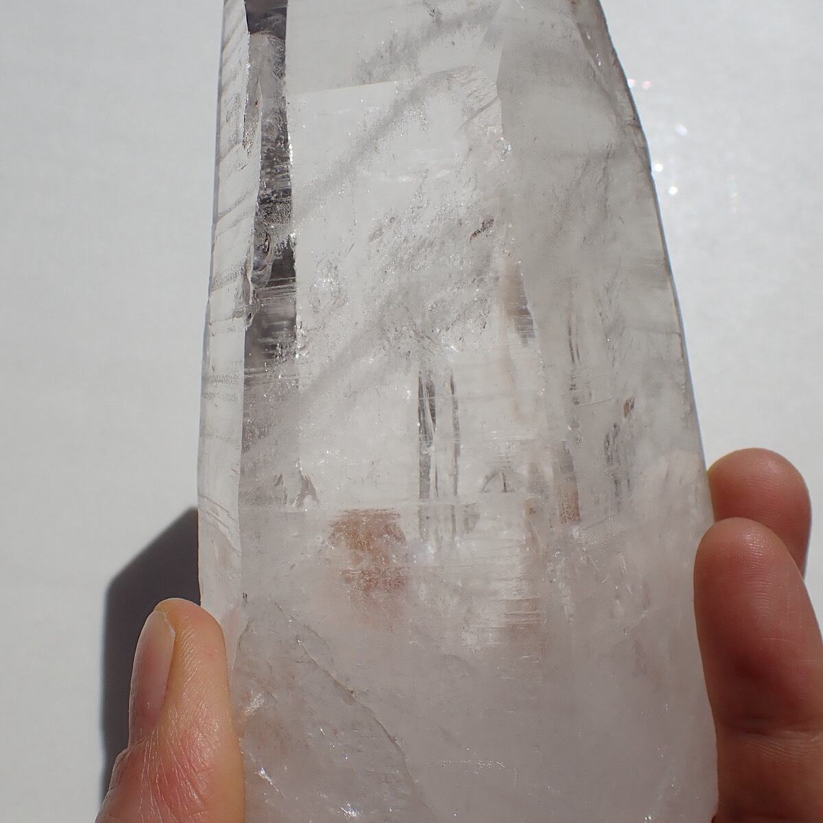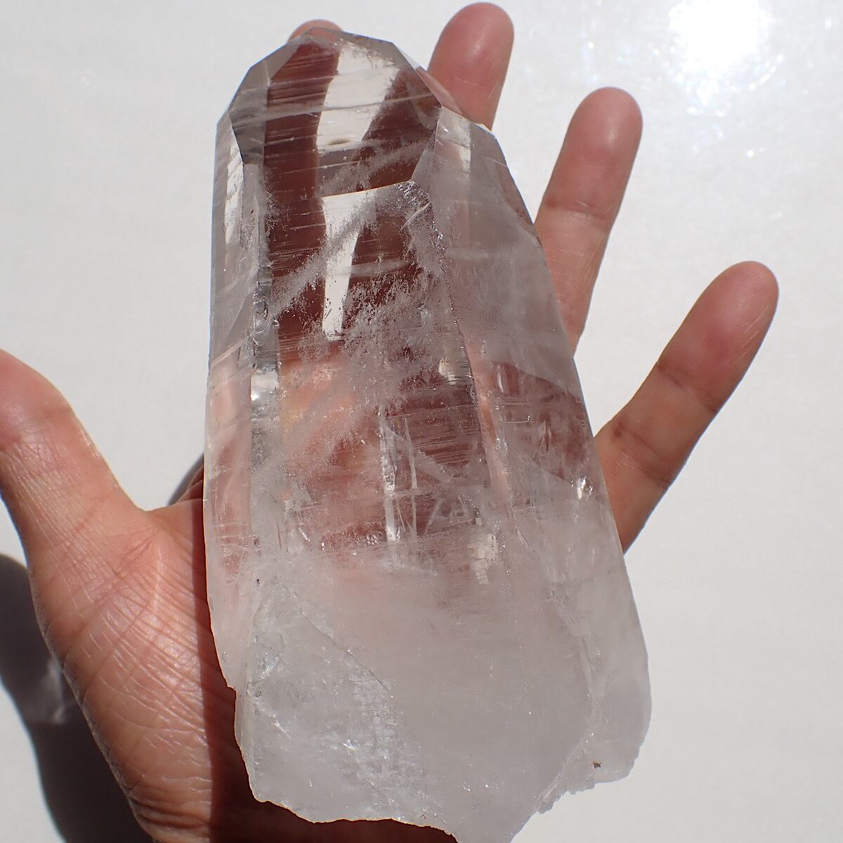 ブラジル・バイーア州の大きなレムリアンシードクリスタルです。完全な原石ではなくリッジを残しつつ部分的に研磨されているタイプのクリスタルだと思います。ブラジルでも産地によってエネルギーが少しずつ違うように感じるレムリアンシードですが、バイーア産からは精霊たちの音楽といいますかメロディが聞こえてくるような感覚があります。このクリスタルから私が感じるエネルギーは「放出」です。体のつま先から頭頂に上下を向けるのではなく、例えばハート(心臓)なら、石の底部をハートに当てて前に放出するような感じで使うと良いと思います。またこの石自体が本当に美しい光を放っているように思います。それはどこか金字塔のように水晶が祀られていた場所のようであり、尊い光のようで、レムリアのエネルギーも感じる事ができるのではないでしょうか。置いているだけであらゆるものを癒してくれる石なのかもしれません☆必要な方に届きますように。
