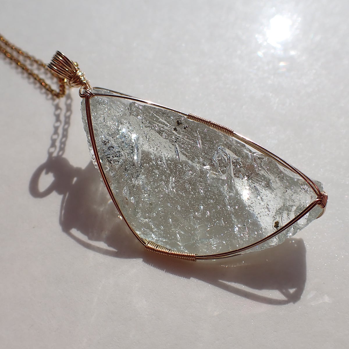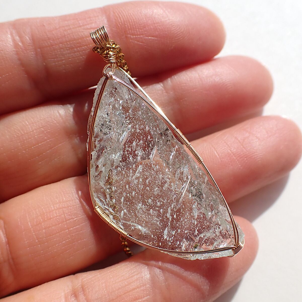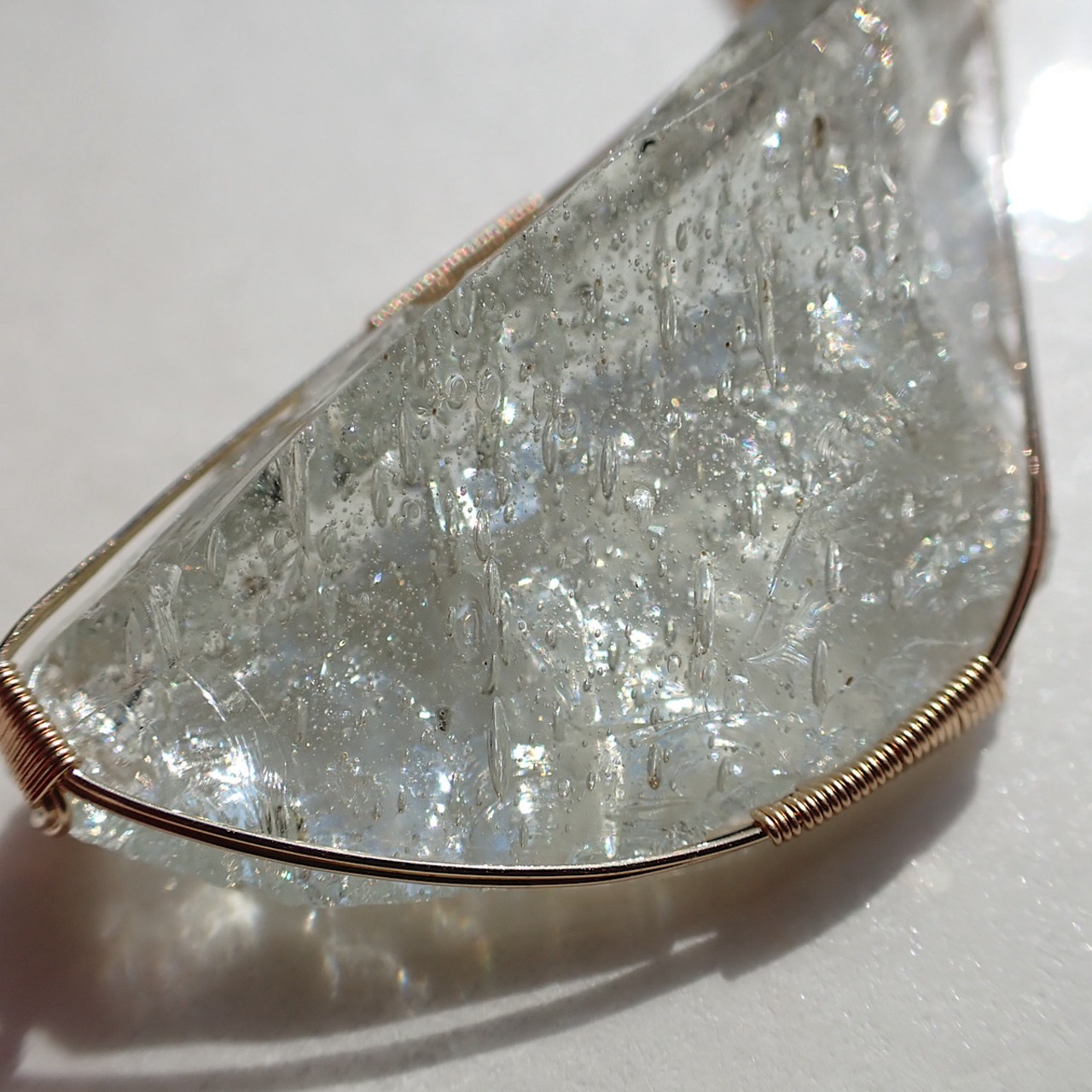 シエラネバダ産のエルダーシーフォームの女神巻きジュエリーです。気泡があるアンダラクリスタルは多いですがシーフォームはそれが沢山入っています。こちらのシーフォームは流れ星のように走る気泡が魅力的で、面白く、そして綺麗です。こちらのアンダラからのメッセージは「地球と宇宙、同じ場所」というものです。地球と宇宙、どちらかに自分が存在する場所があるのではなく同じという。土台、常識を覆す。当たり前と思っている事が当たり前ではない、ということを伝えてくれています。必要な方に届きますように☆