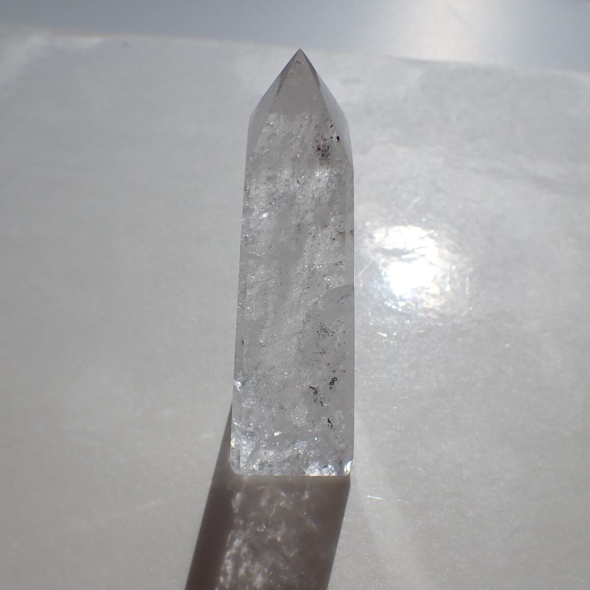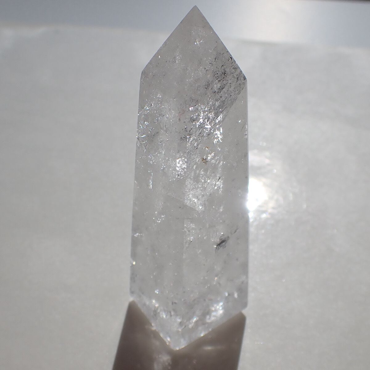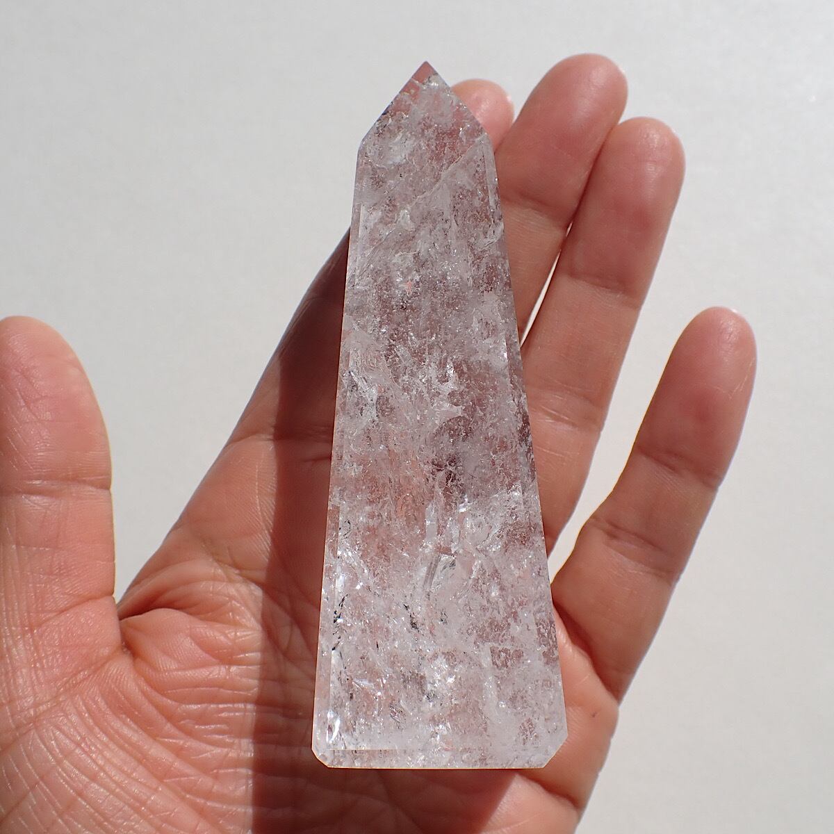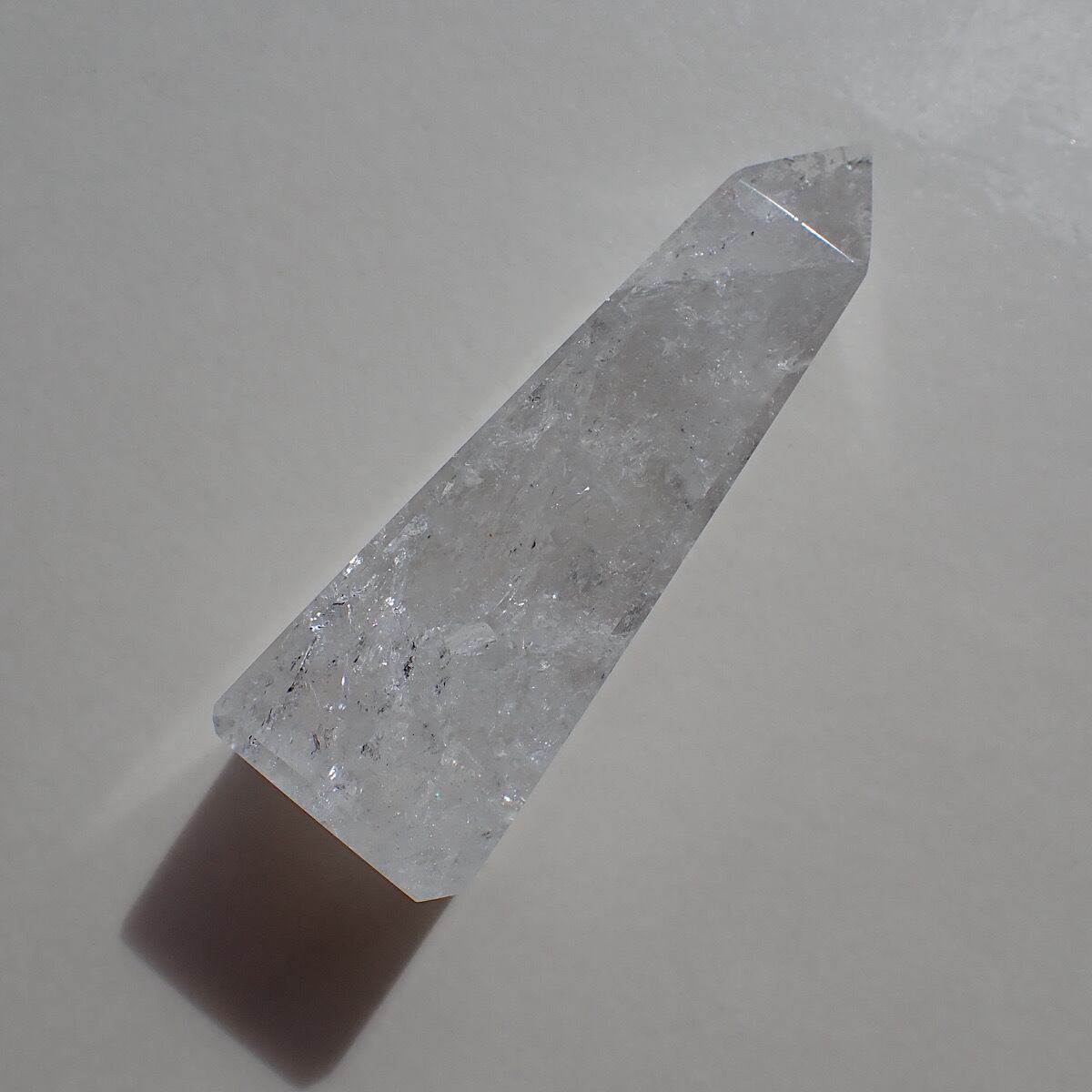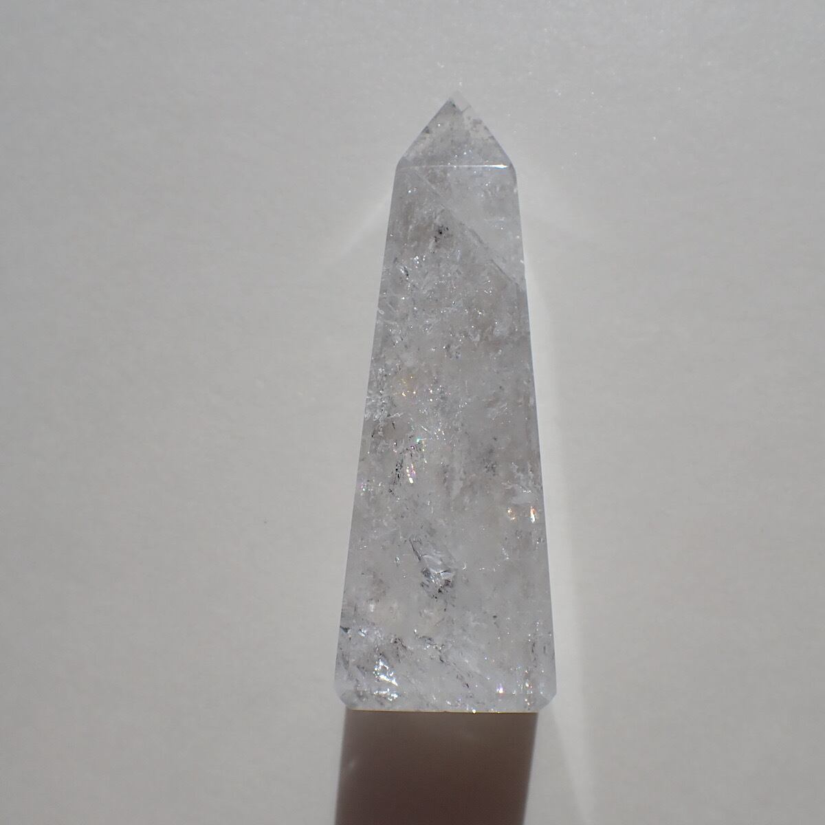 レムリアンシードクリスタルを研磨したオベリスクです。オベリスクとは古代エジプト時代より広場や神殿などに建てられた記念碑の一種で底は四角形、先端に向かって少しずつ細くなり先端はピラミッド形状の四角錐になっています。太陽神のシンボルとして光を反射して輝くように作られていたそうです。目を閉じてエネルギーを感じようとすると、四角錐ですが周りにサークルができているような、それが火、太陽のように感じました。万能の石、クリスタルでしかもレムリアン、かなりおすすめです☆