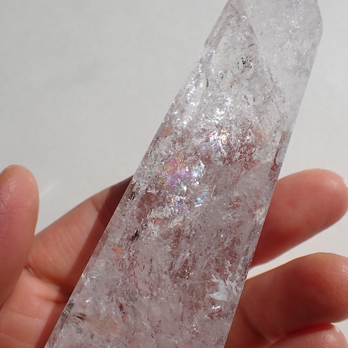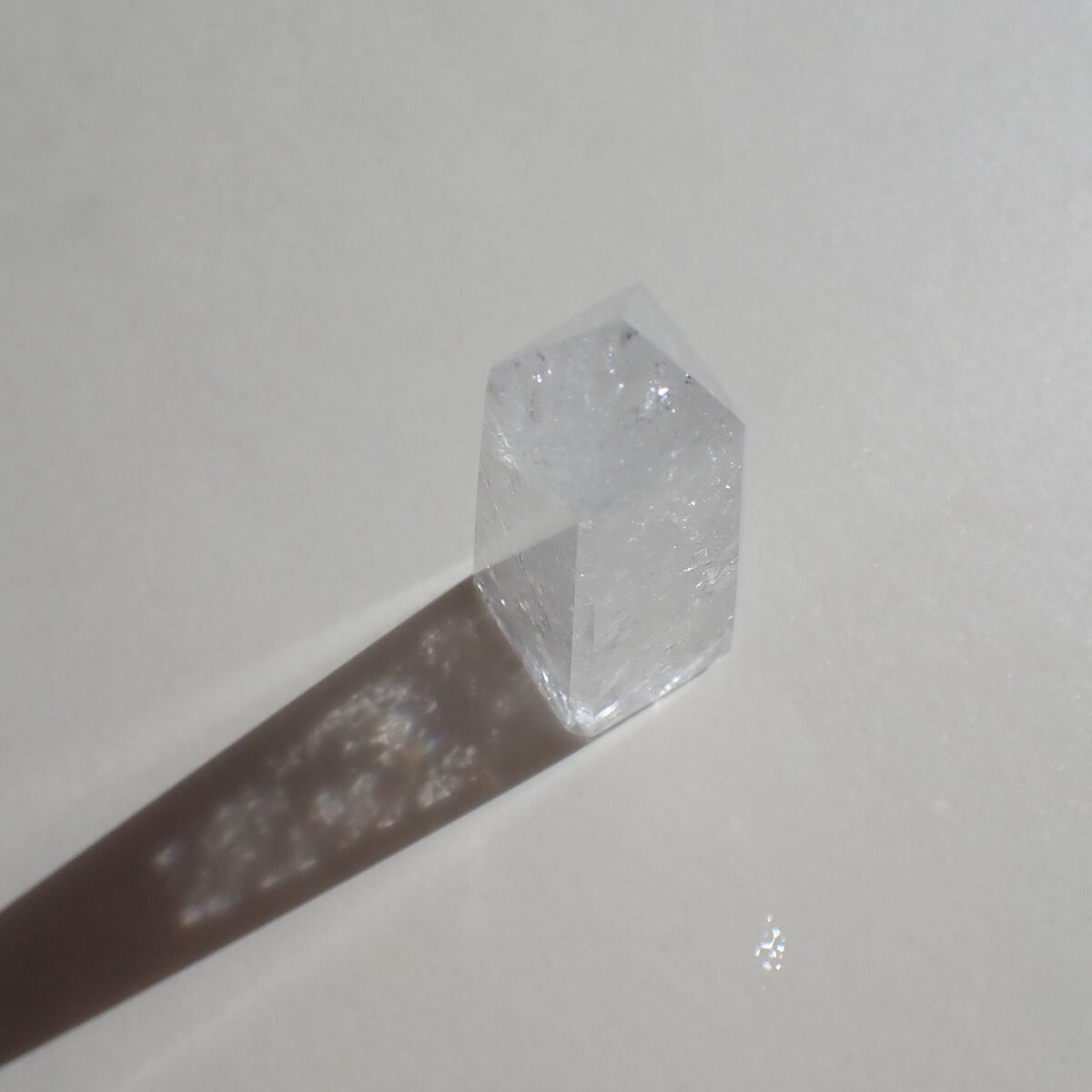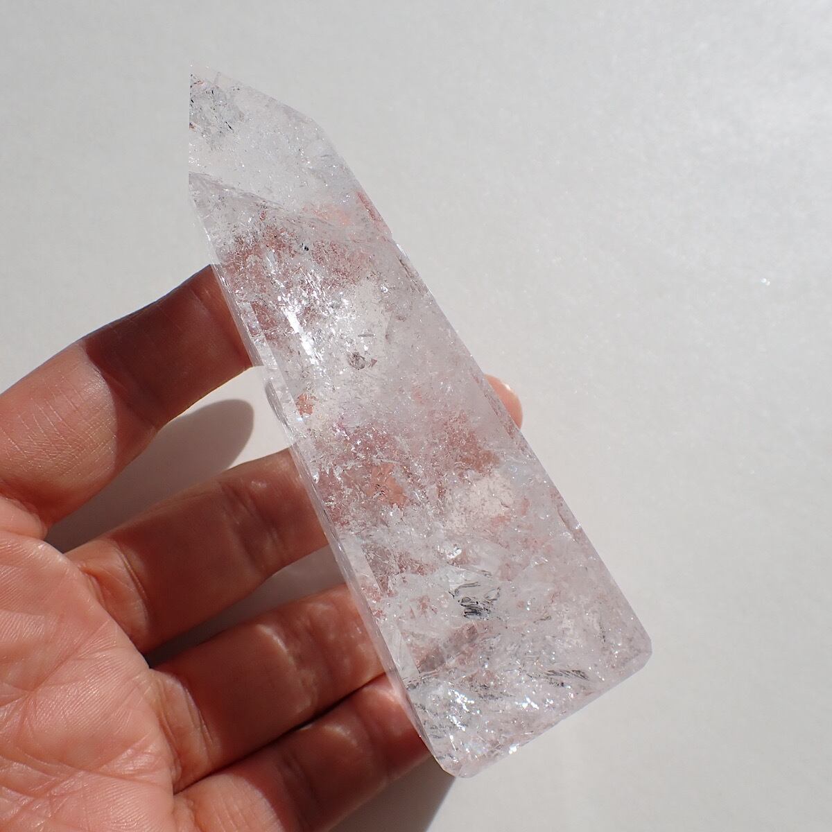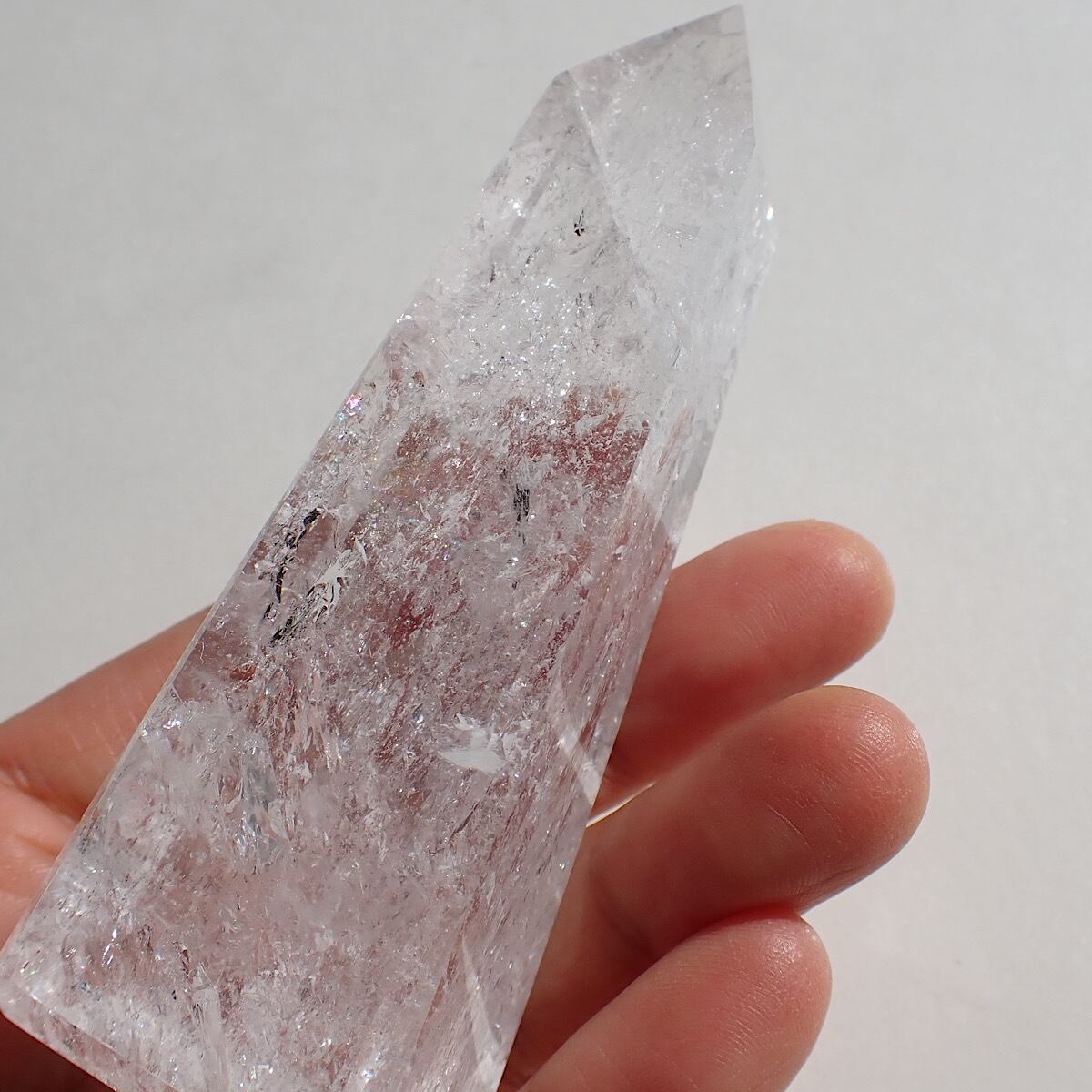 レムリアンシードクリスタルを研磨したオベリスクです。オベリスクとは古代エジプト時代より広場や神殿などに建てられた記念碑の一種で底は四角形、先端に向かって少しずつ細くなり先端はピラミッド形状の四角錐になっています。太陽神のシンボルとして光を反射して輝くように作られていたそうです。目を閉じてエネルギーを感じようとすると、四角錐ですが周りにサークルができているような、それが火、太陽のように感じました。万能の石、クリスタルでしかもレムリアン、かなりおすすめです☆