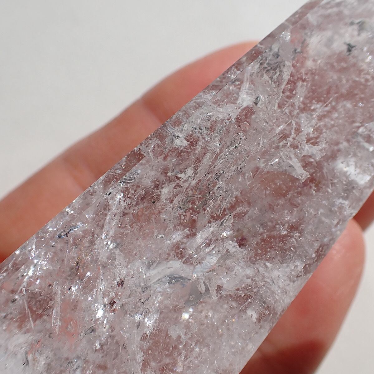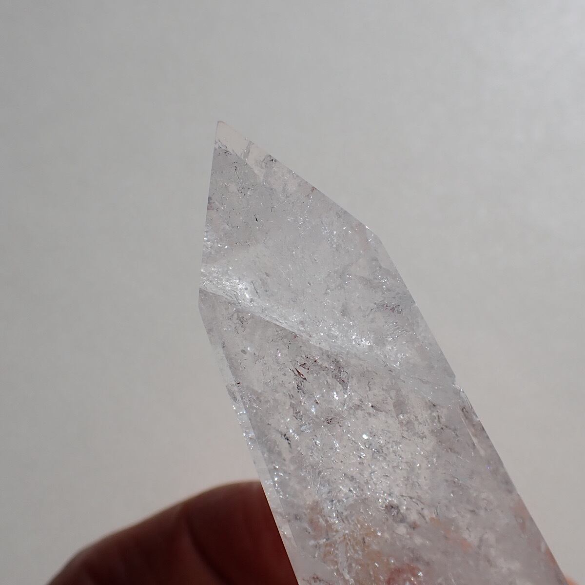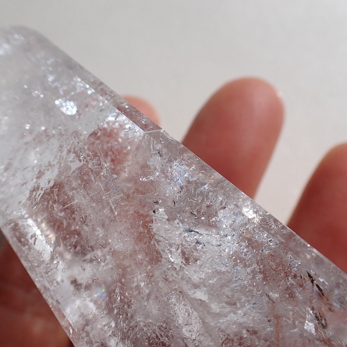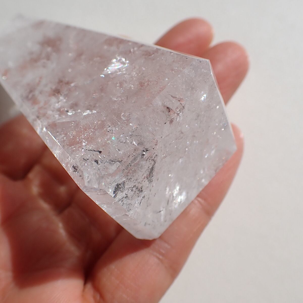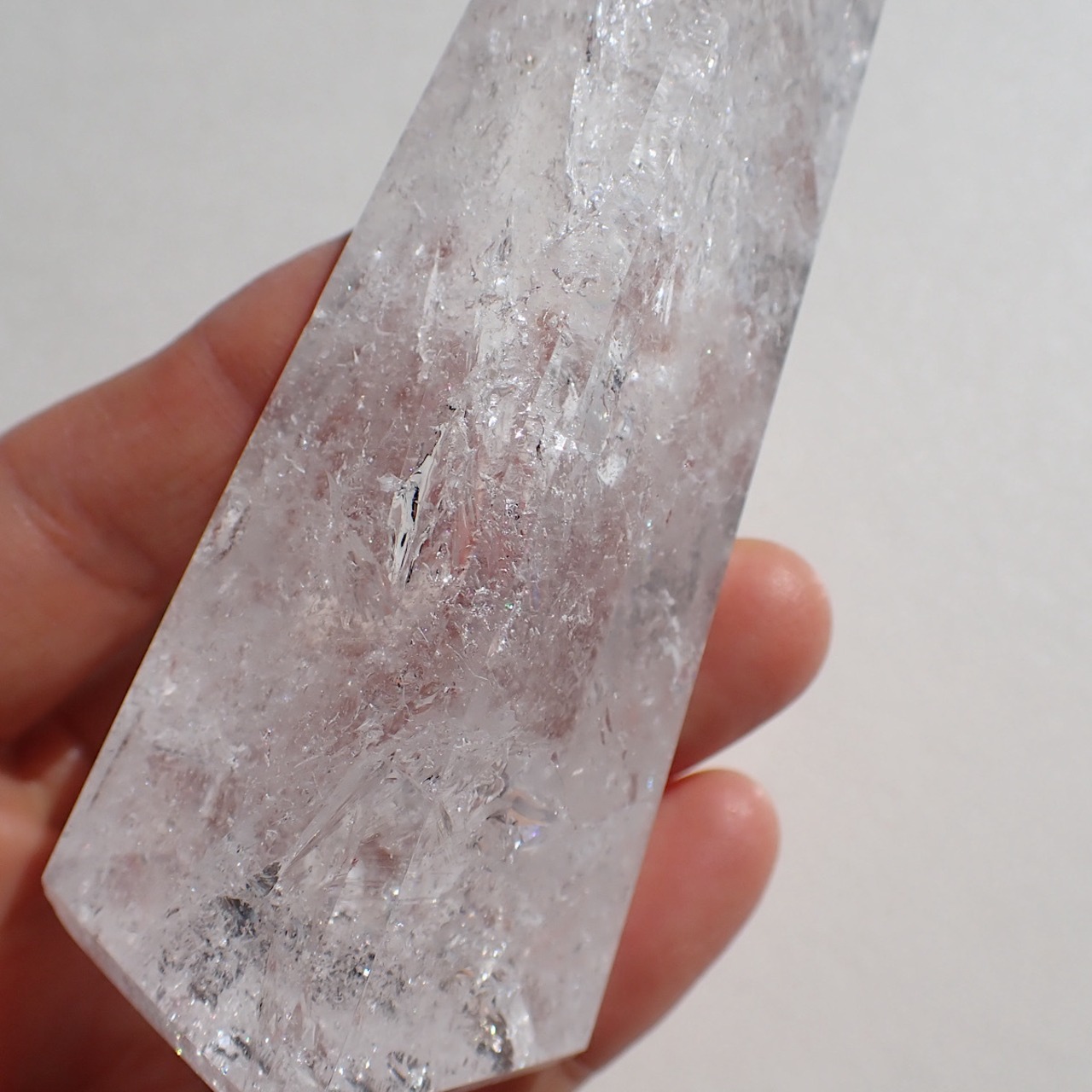 レムリアンシードクリスタルを研磨したオベリスクです。オベリスクとは古代エジプト時代より広場や神殿などに建てられた記念碑の一種で底は四角形、先端に向かって少しずつ細くなり先端はピラミッド形状の四角錐になっています。太陽神のシンボルとして光を反射して輝くように作られていたそうです。目を閉じてエネルギーを感じようとすると、四角錐ですが周りにサークルができているような、それが火、太陽のように感じました。万能の石、クリスタルでしかもレムリアン、かなりおすすめです☆