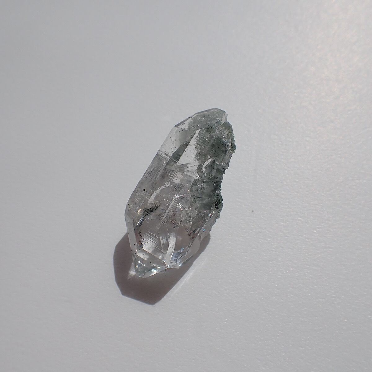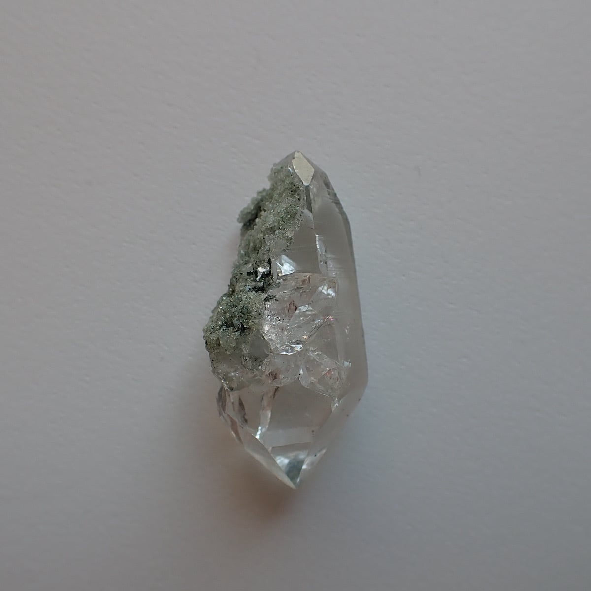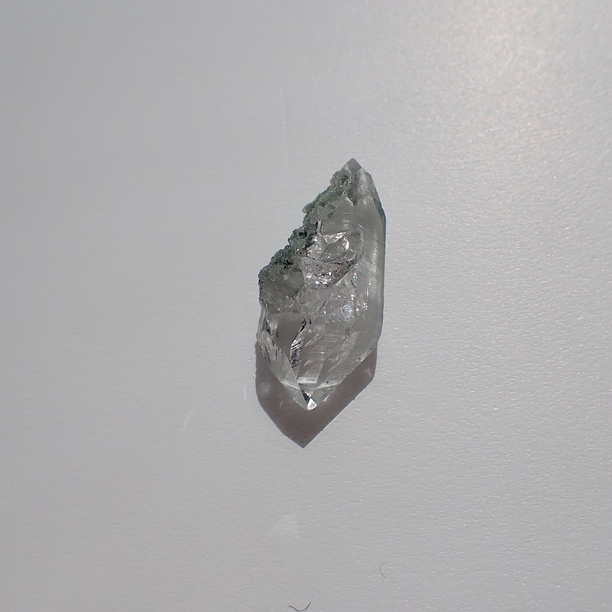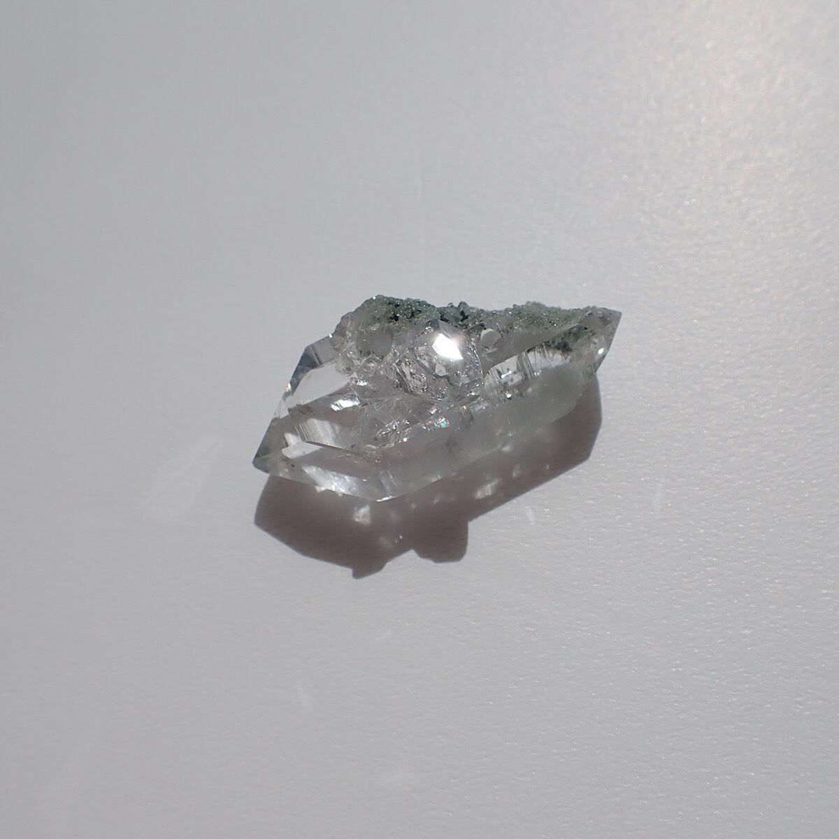 マニハール水晶原石です。緑の付着物がついていて少しわかりにくいですが上下ともにポイントがあるダブルターミネイティッドの水晶です。小さな水晶がくっついています。剥離痕もあります。サイズはかわいいですが力強い水晶です☆