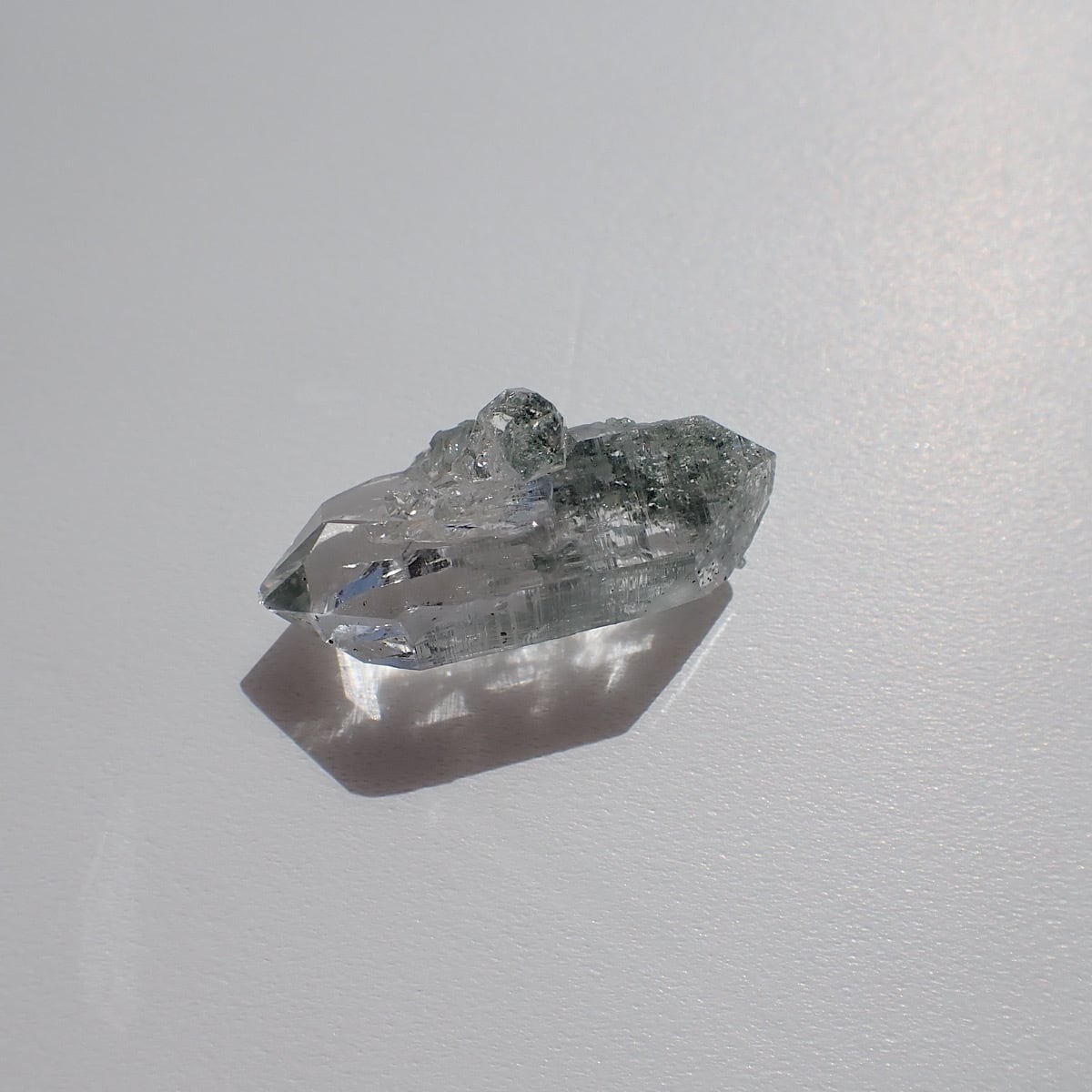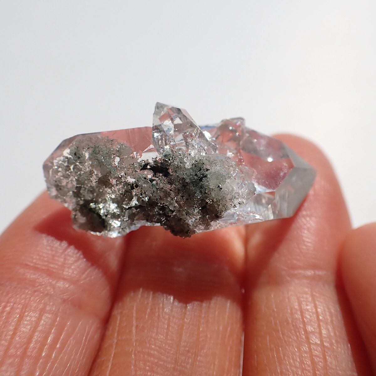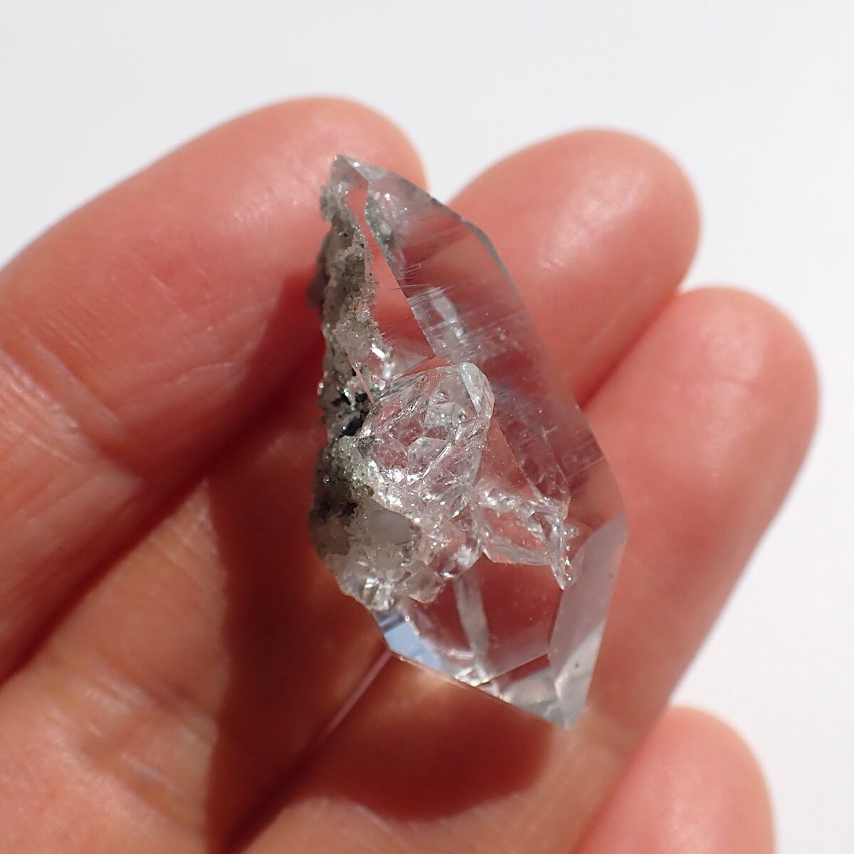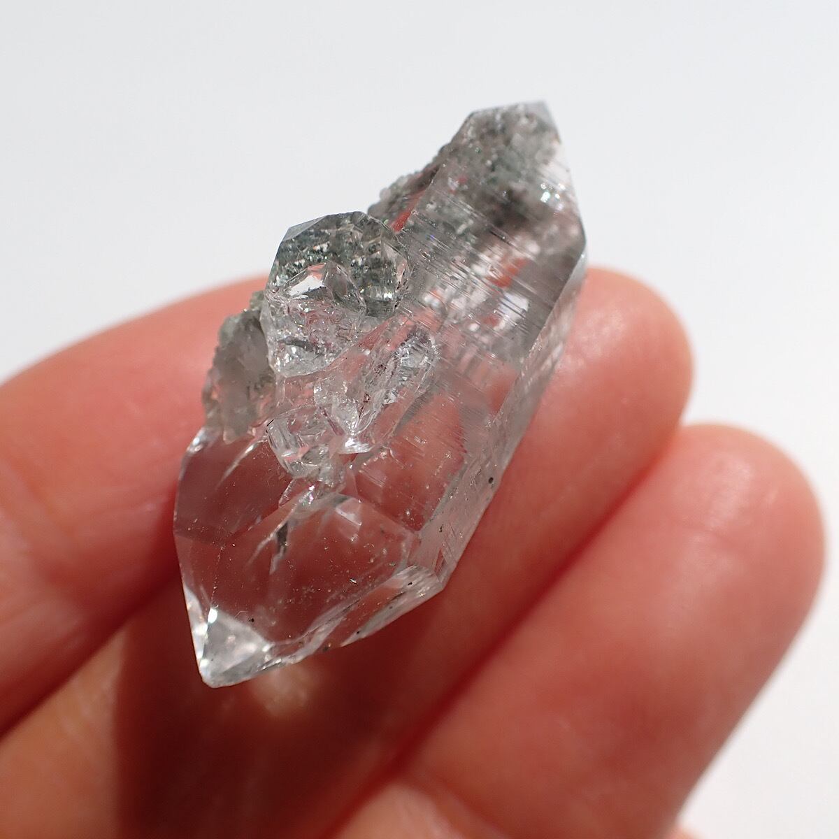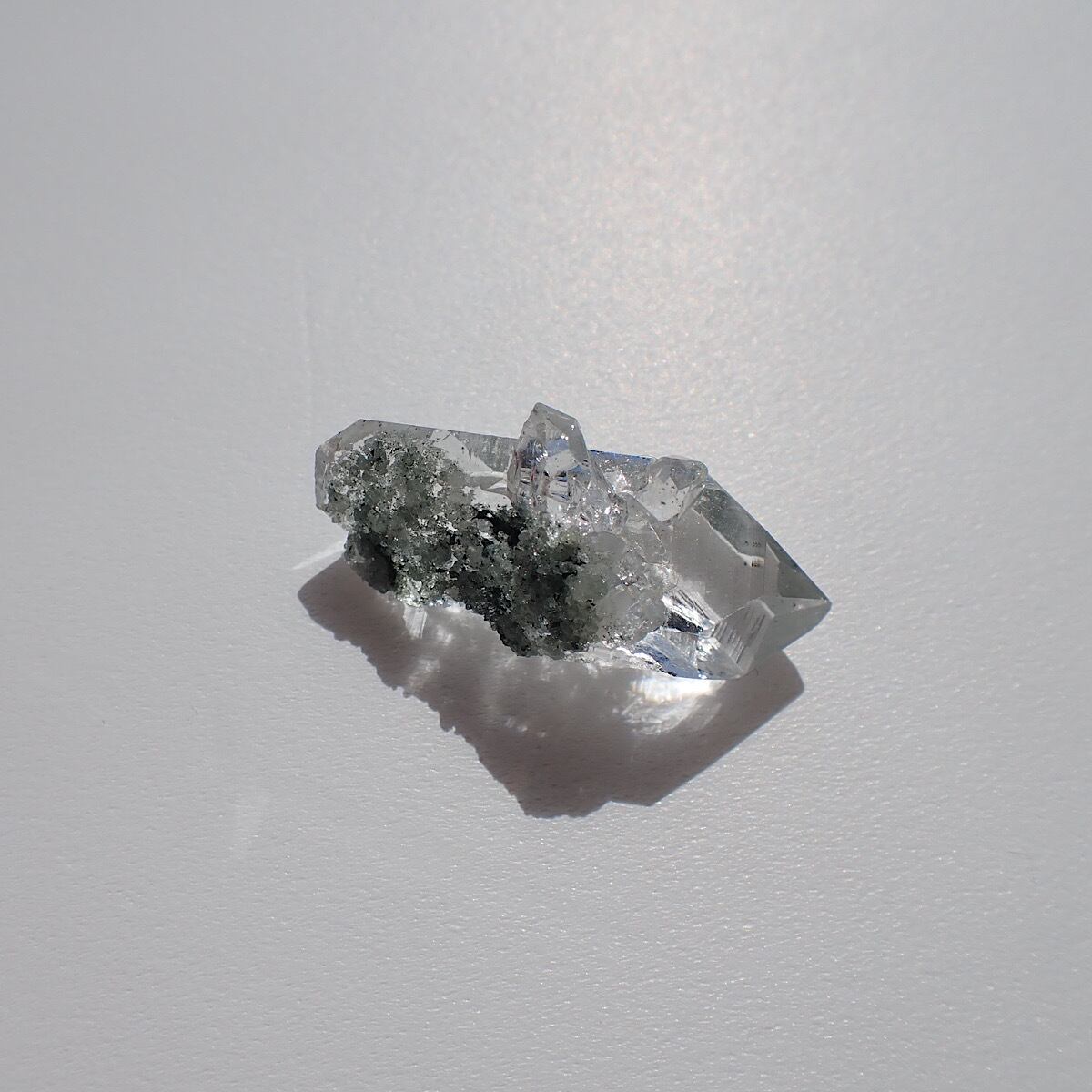 マニハール水晶原石です。緑の付着物がついていて少しわかりにくいですが上下ともにポイントがあるダブルターミネイティッドの水晶です。小さな水晶がくっついています。剥離痕もあります。サイズはかわいいですが力強い水晶です☆