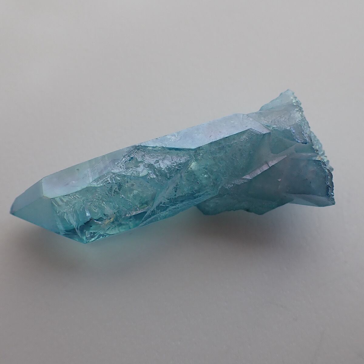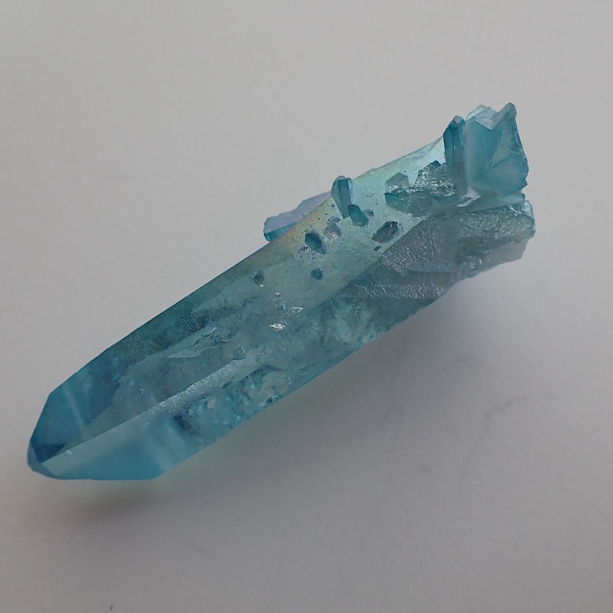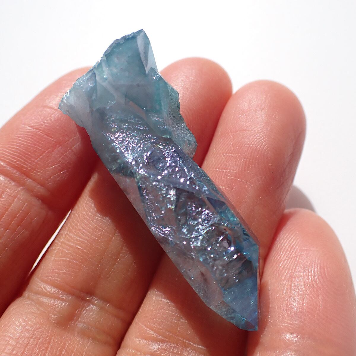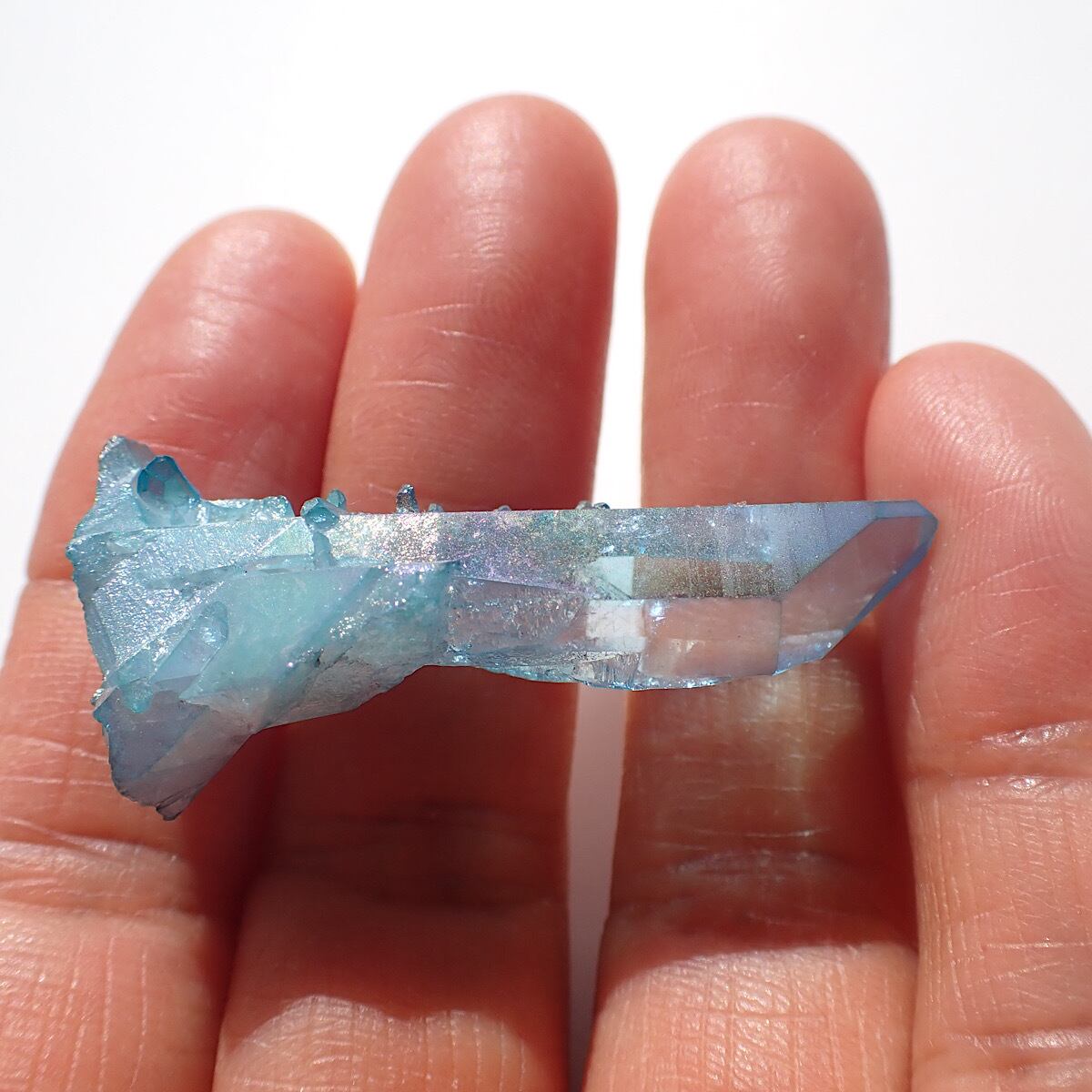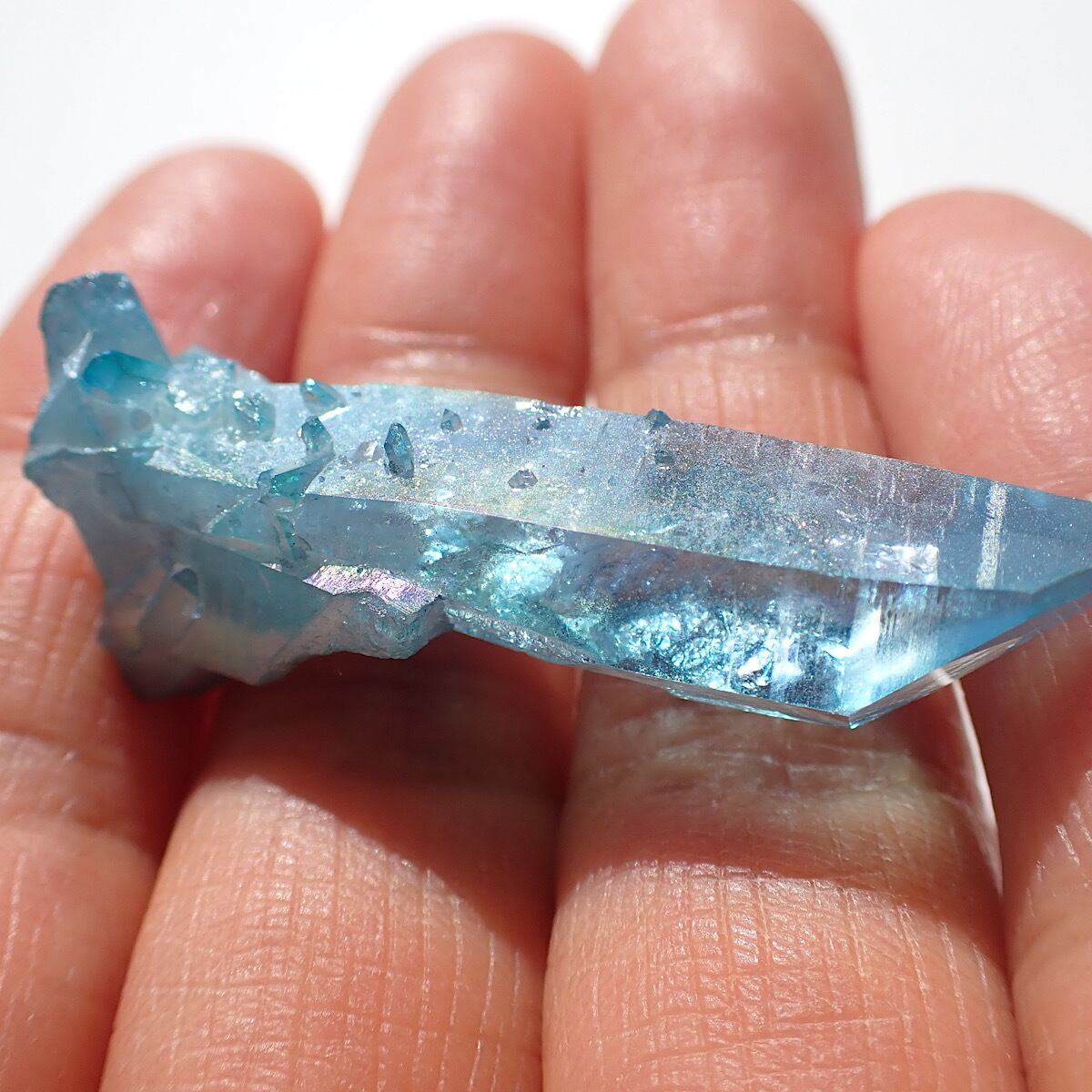 アメリカ、アーカンソー産のアクアオーラです。上部にでっぱりがあるポイント水晶です。