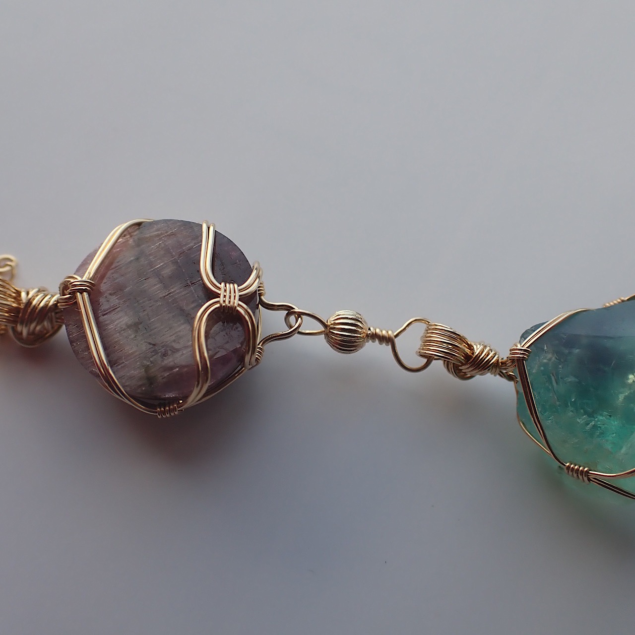 濃い紫色で動かすと少しキャッツアイの出るミックスカラートルマリンとイングランドロジャリー産フローライトをツインのペンダントトップにしました。小さいけれど個々で巻いても主役級の二つの石です。この組み合わせの色合いがとても綺麗だったのでツインにしました(*^^*)