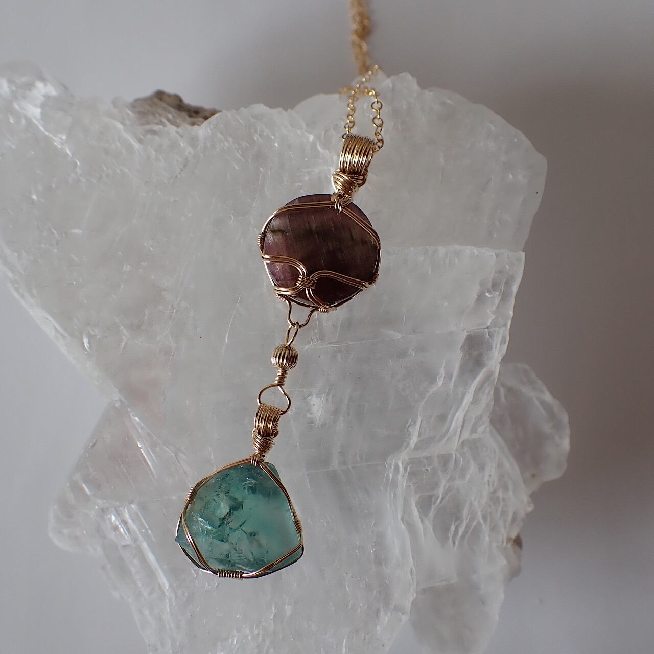 女神巻き®︎小さなミックスカラートルマリンとフローライトのツインペンダントトップ