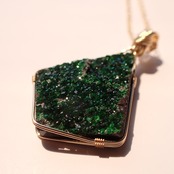 ウバロバイトガーネットの女神巻きペンダントトップです。最初この石を見た時は、「なんて高貴で目に優しい緑色」と思いました(笑)異彩を放つこの石はとても稀少だそうです。小さな結晶がキラキラと光を放ち美しい見た目にも癒されますが、持ち主に必要なエネルギーを与えたり促したりという意味でも浄化力、ヒーリング効果が高いと感じます。とても優しく、とても宇宙的な魅力に溢れています♢