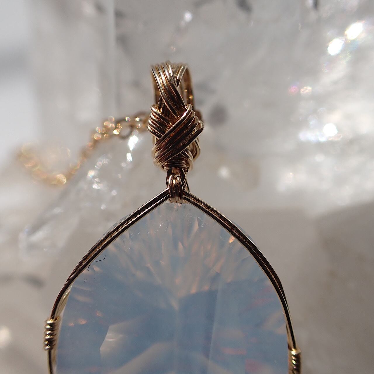 細かく繊細なファセットカットのミルキークォーツと大きめのアクアマリンのツインペンダントです。美しく輝く色がとても優しいミルキークォーツとアクアマリンの癒し効果は絶大で見つめていると天使が集まってきそうです(笑)