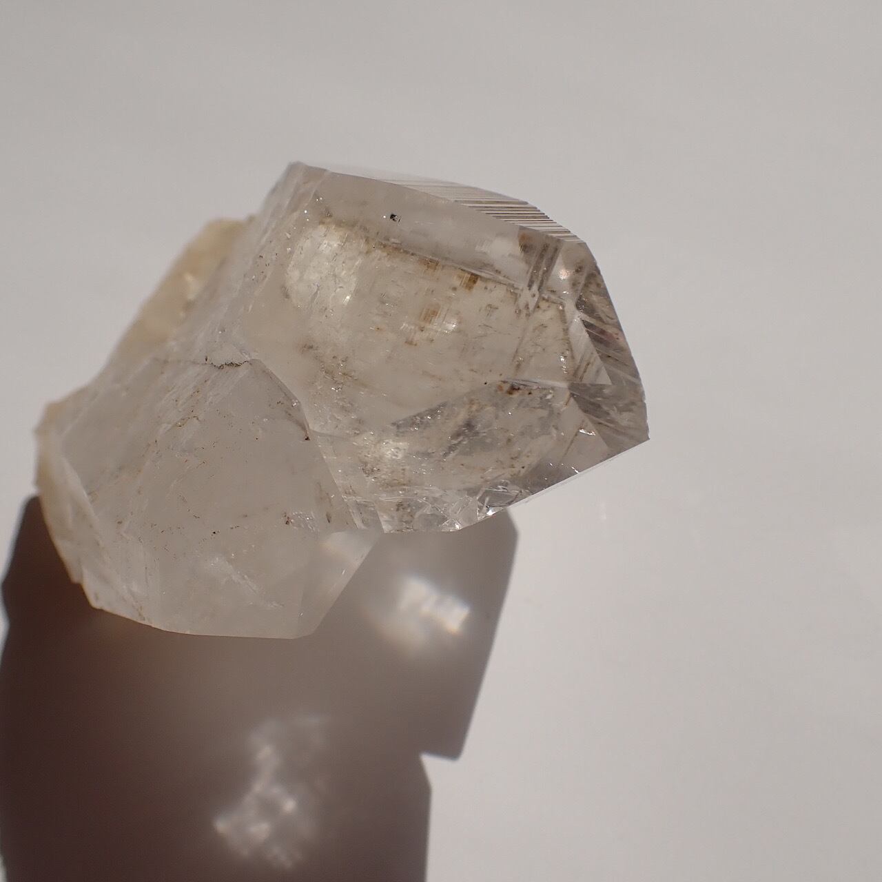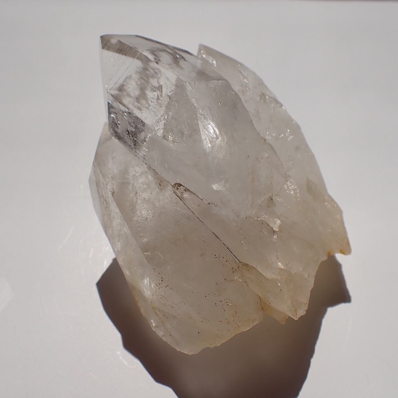 手のひらサイズのヒマラヤマニカラン水晶です。マニカラン水晶はピンクの色味を帯びたものが多いですが、こちらは透明で根本側が少し黄土色です。この部分はゴールデンヒーラーのような輝き方に近く、見れば見るほどヒマラヤの山々、大自然を近くに感じられるのではないでしょうか(*^^*)
