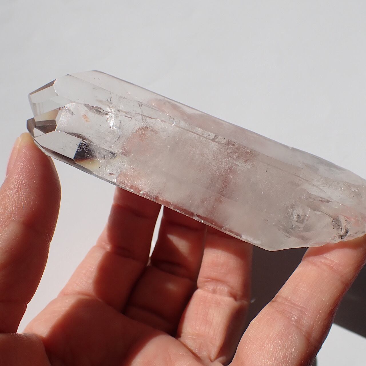 ブラジル・カブラル鉱山のレムリアンシードのツイン結晶です。白の上に置くと少しだけスモーキーのように茶色がかって見える気がします。