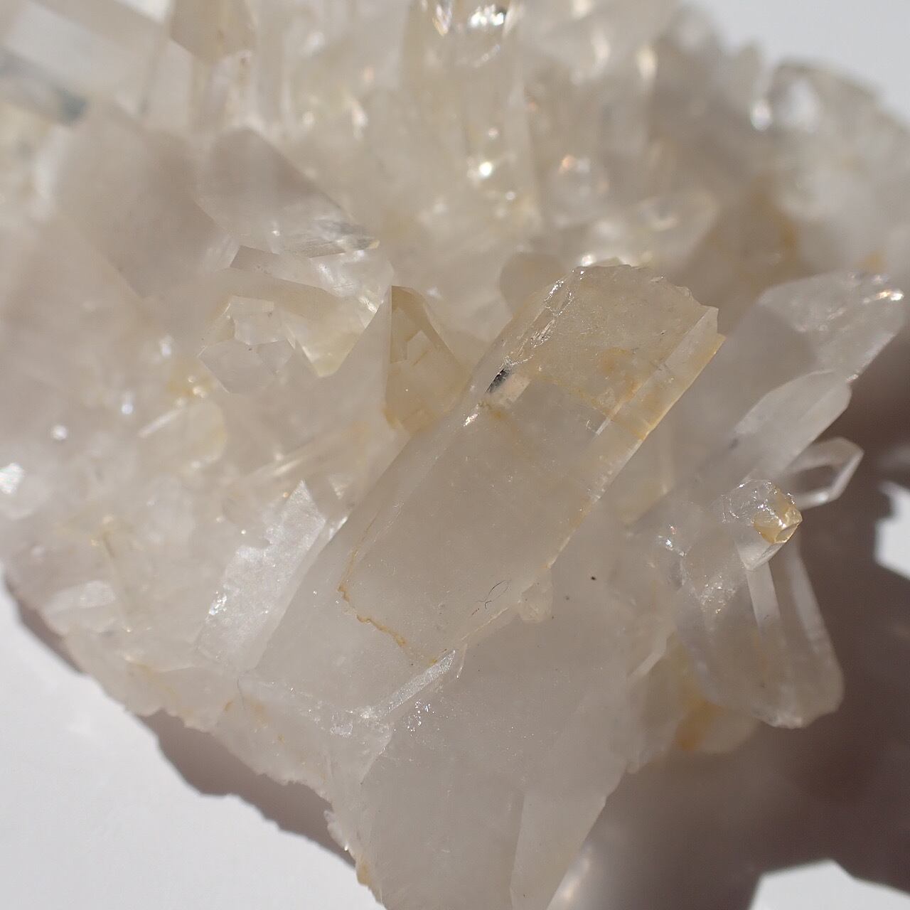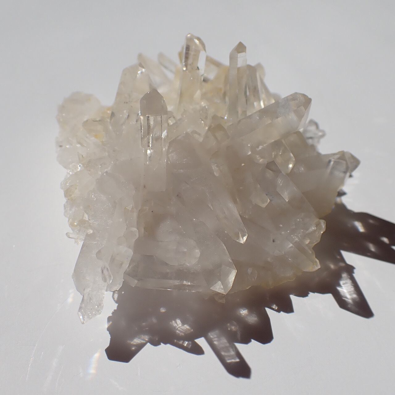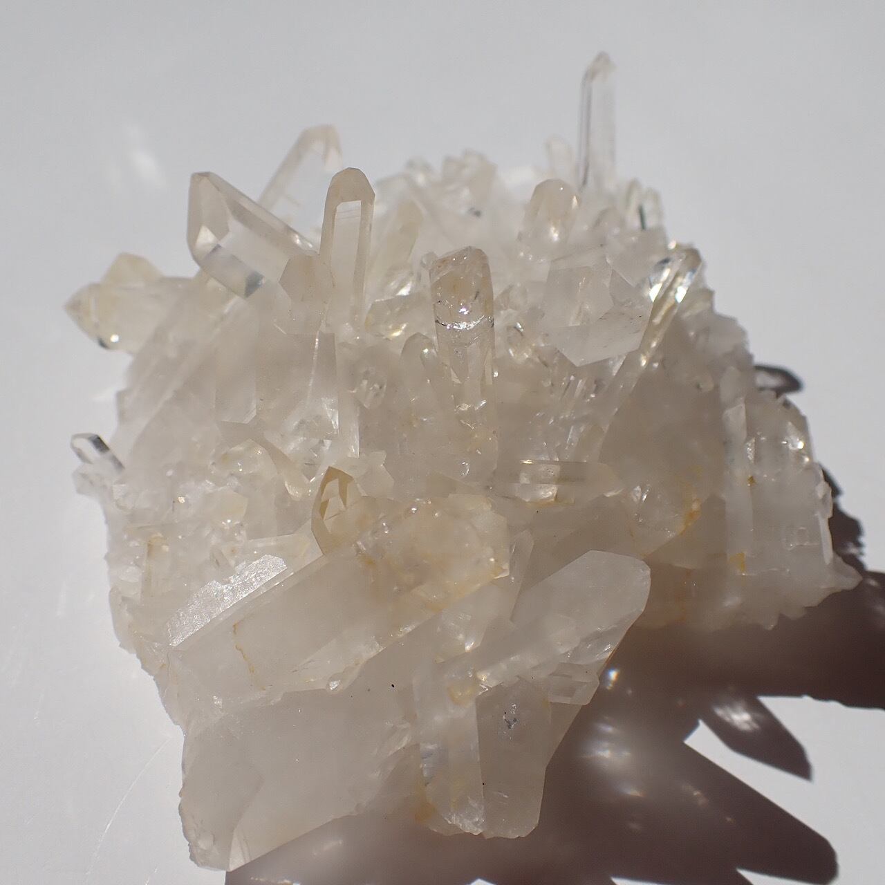 水晶クラスターの中でも不純物と内包物の少ない透明感とその形が美しいことで、世界一美しい水晶クラスターと言われているアーカンソー産水晶の小さめのクラスターです。母岩は殆ど付いておらず少し黄色を帯びています。とてもかわいいです☆