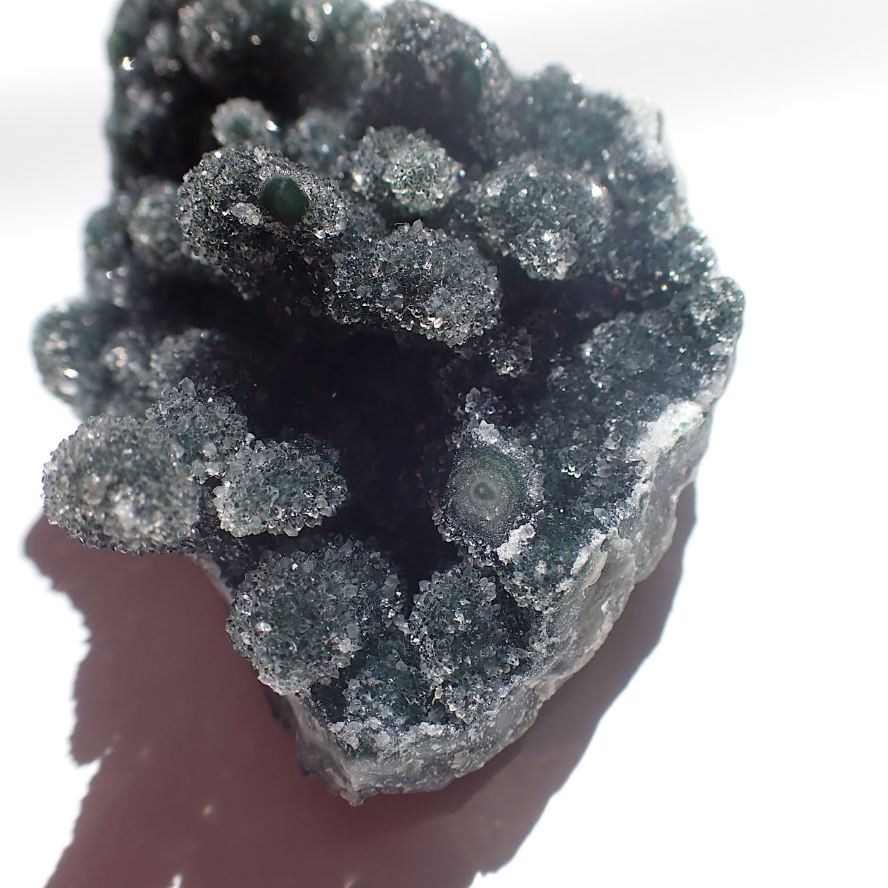 ウルグアイ産のドゥルージー結晶のアメジスト原石です。こちらは黒色(モスグリーンのようにも見えます)、小さなコブ結晶がたくさんです。
