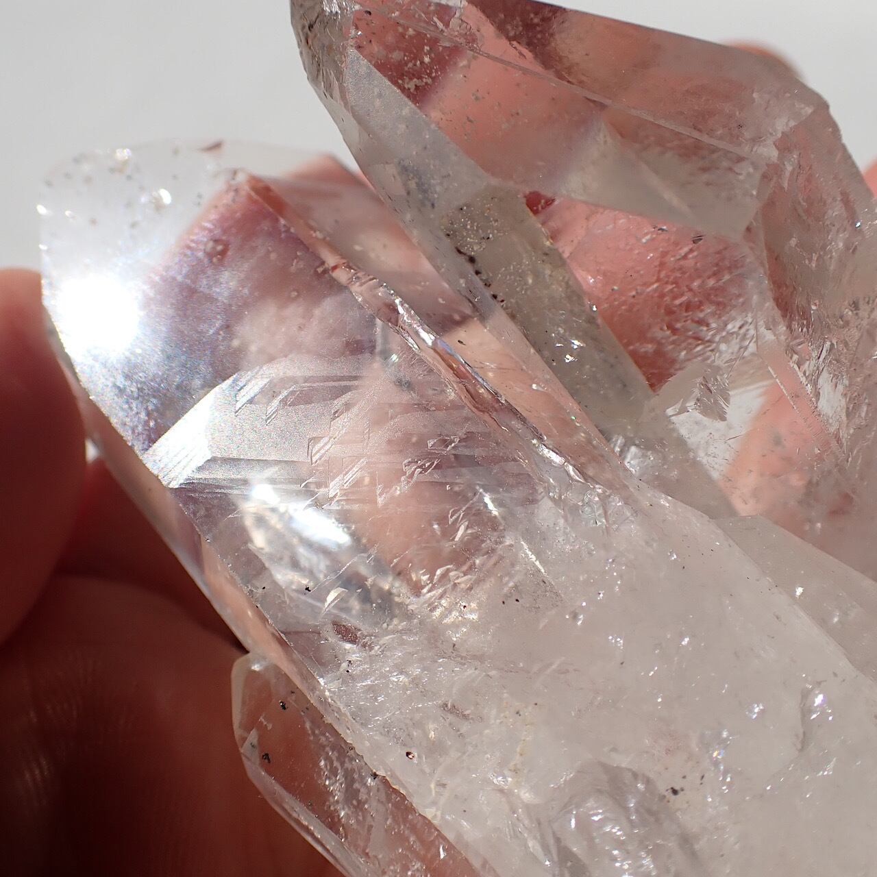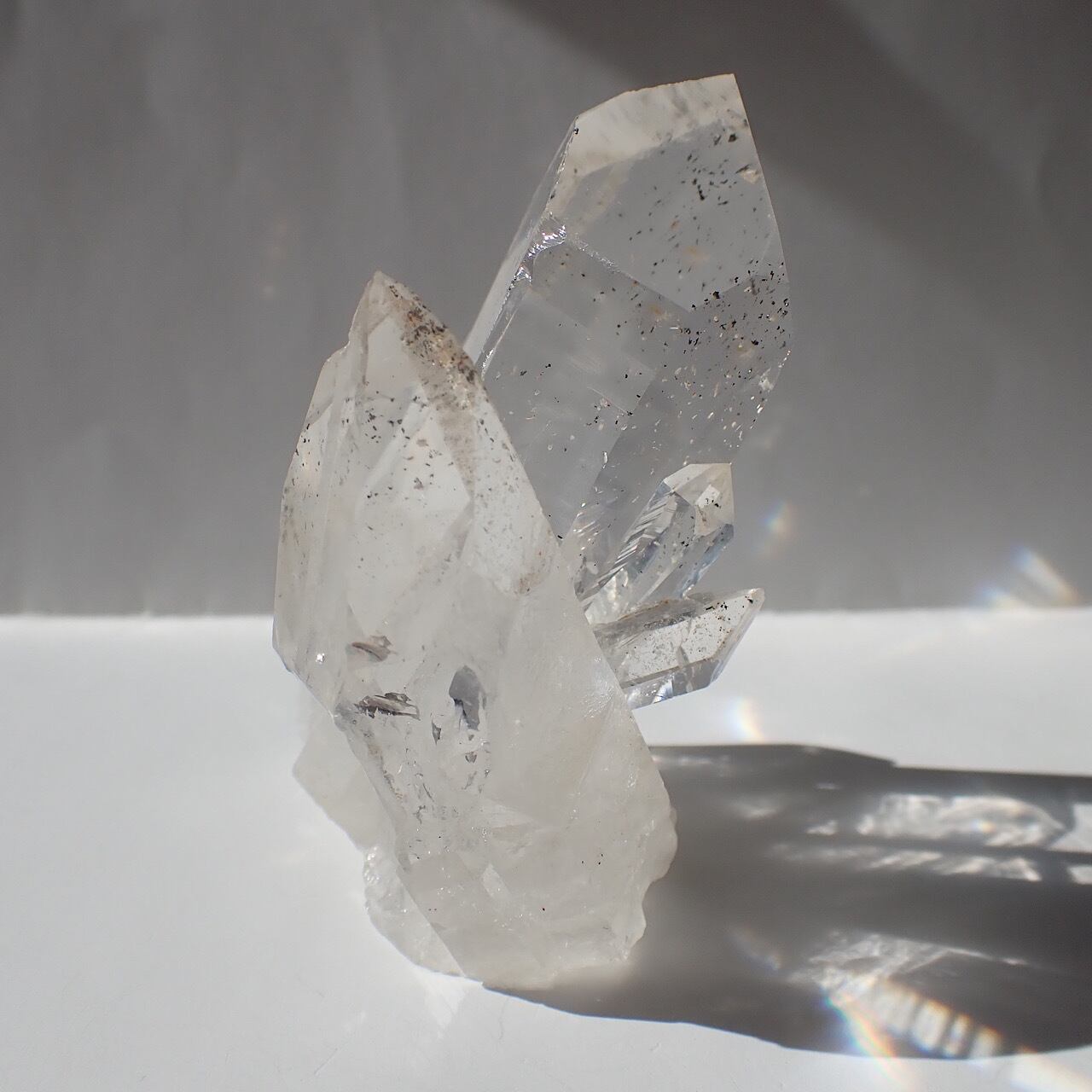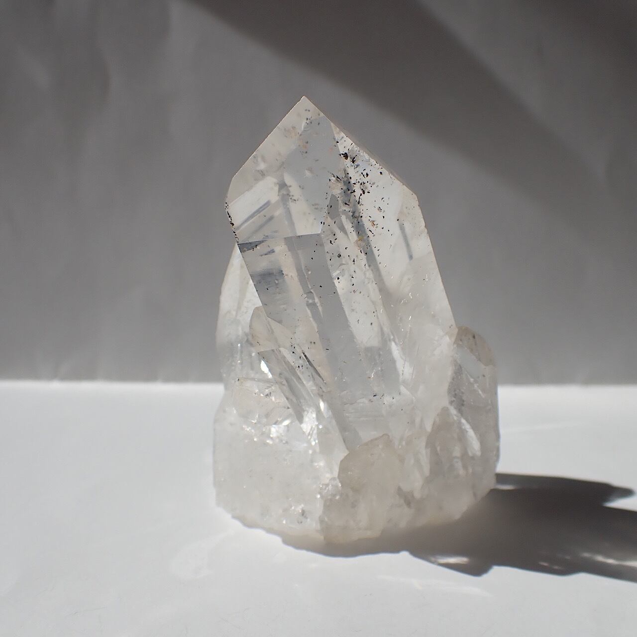 ブラジルのトマスゴンサガ水晶です。何か黒い鉱物が点々と入っていますが、透明の点々も含めて宇宙的です。宇宙の静けさがとても心地よいです。「光の画用紙」という言葉が浮かびます。たくさんの光を集めて、記憶を刻み、メロディを奏でるようなクリスタルです☆