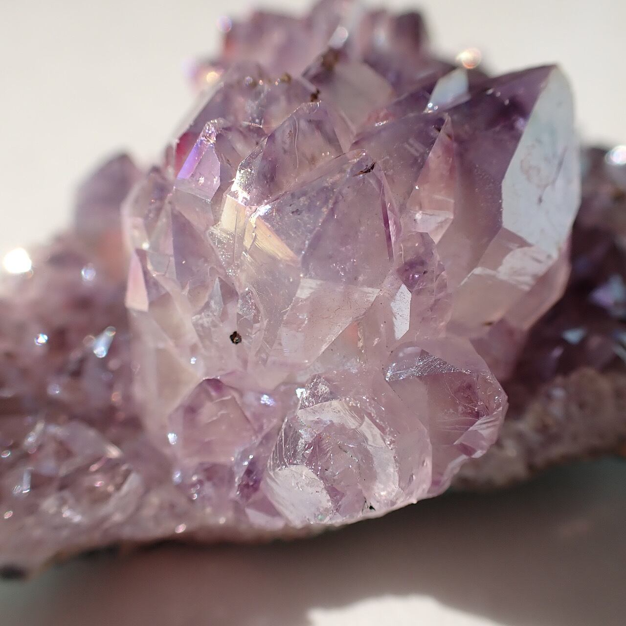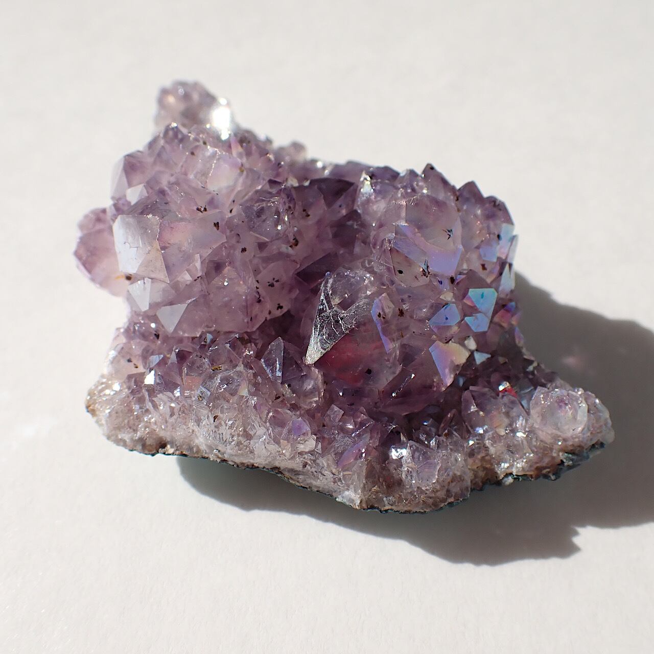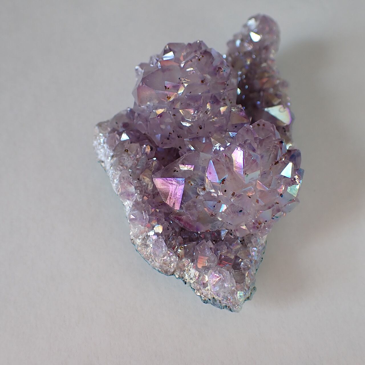ブラジル産のアメジストにオーラ加工が施されています。加熱した天然アメジストに高温でイオン化した金属を蒸着させるという錬金術的な加工は自然と科学の融合です。またとても強いバイブレーションを持っているとされています。見ていると気持ち明るくなるようなかわいさです。