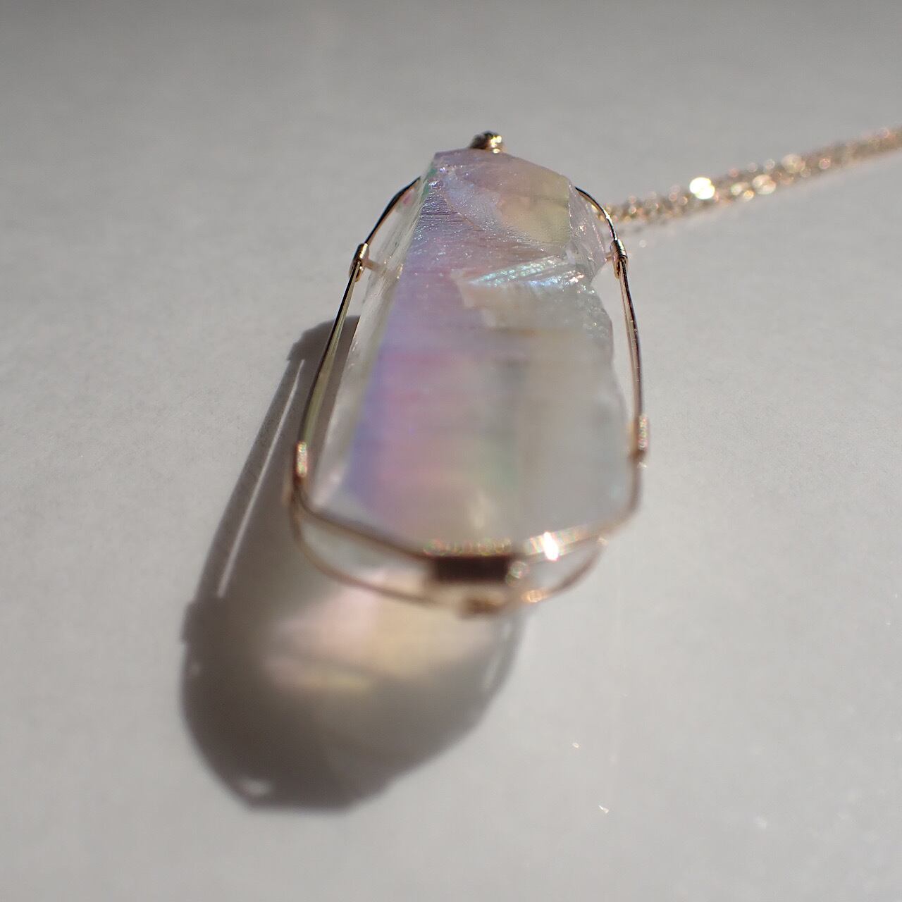 オーラがとても綺麗に出ているアーカンソー産のエンジェルオーラクリスタルです。胸に着けた時に現れるオーラ、光に釘付けになり気分を底上げしてくれます。見ている周りの人も幸せにするのだと思わせてくれるような美しさです。