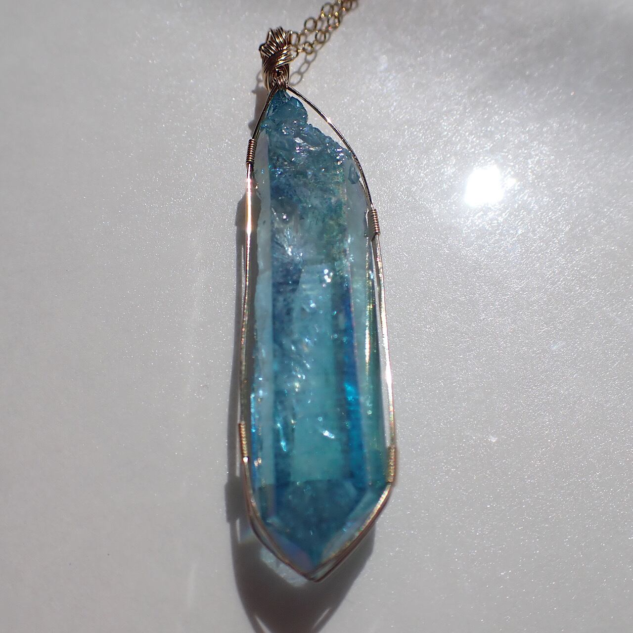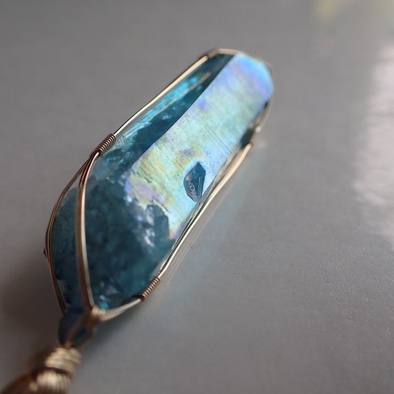 アーカンソーのクリスタルにオーラ加工が施されたアクアオーラです。世界がひつとになるように、人間の力を信じたいという気持ちで地球と人間の共同創造ともいえるアクアオーラを巻いていました。光と癒しとなり、必要な方に届きますように。