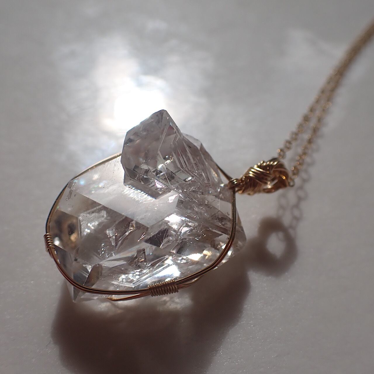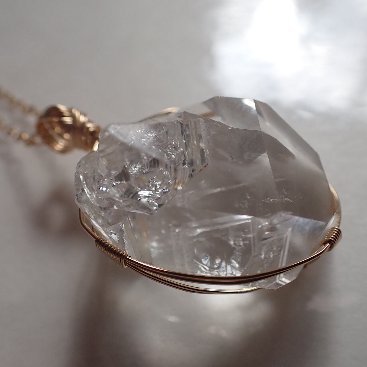 ニューヨーク ハーキマーダイアモンド(水晶)の女神巻きペンダントトップです。とても光が強く、綺麗です。丸く巻いているのでかわいらしさも出ているかと思います。