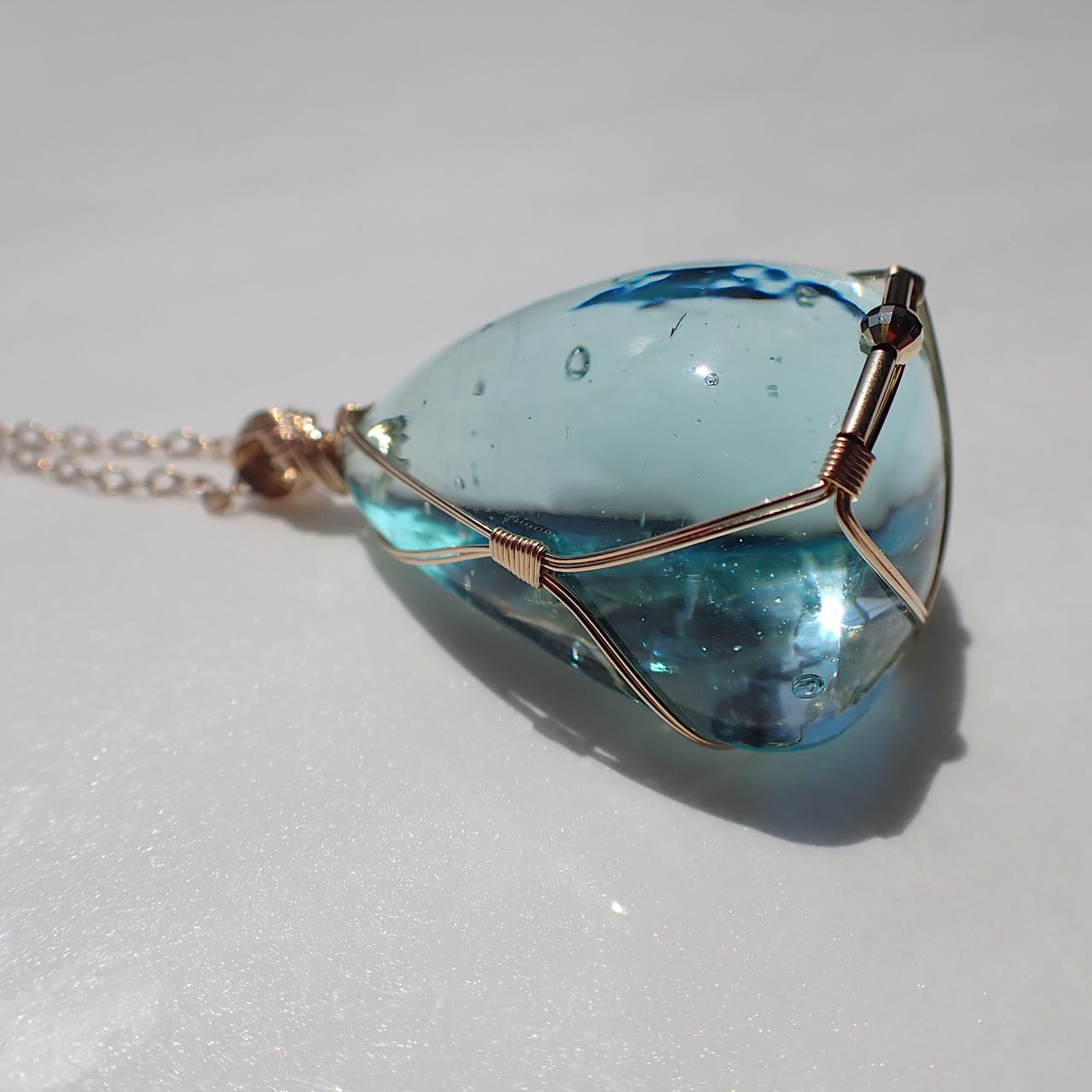インドネシアのアンダラクリスタルを研磨し、少しの装飾ビーズを使って女神巻きペンダントトップにしました。厚みを残して研磨したのは、水色などの寒色系のアンダラが光を取り込んだ時の美しさが個人的にとても好きだからです。気泡も残っているのでより水のような印象を受けます。ペンダントトップですが、置いているだけでもかわいいです☆
