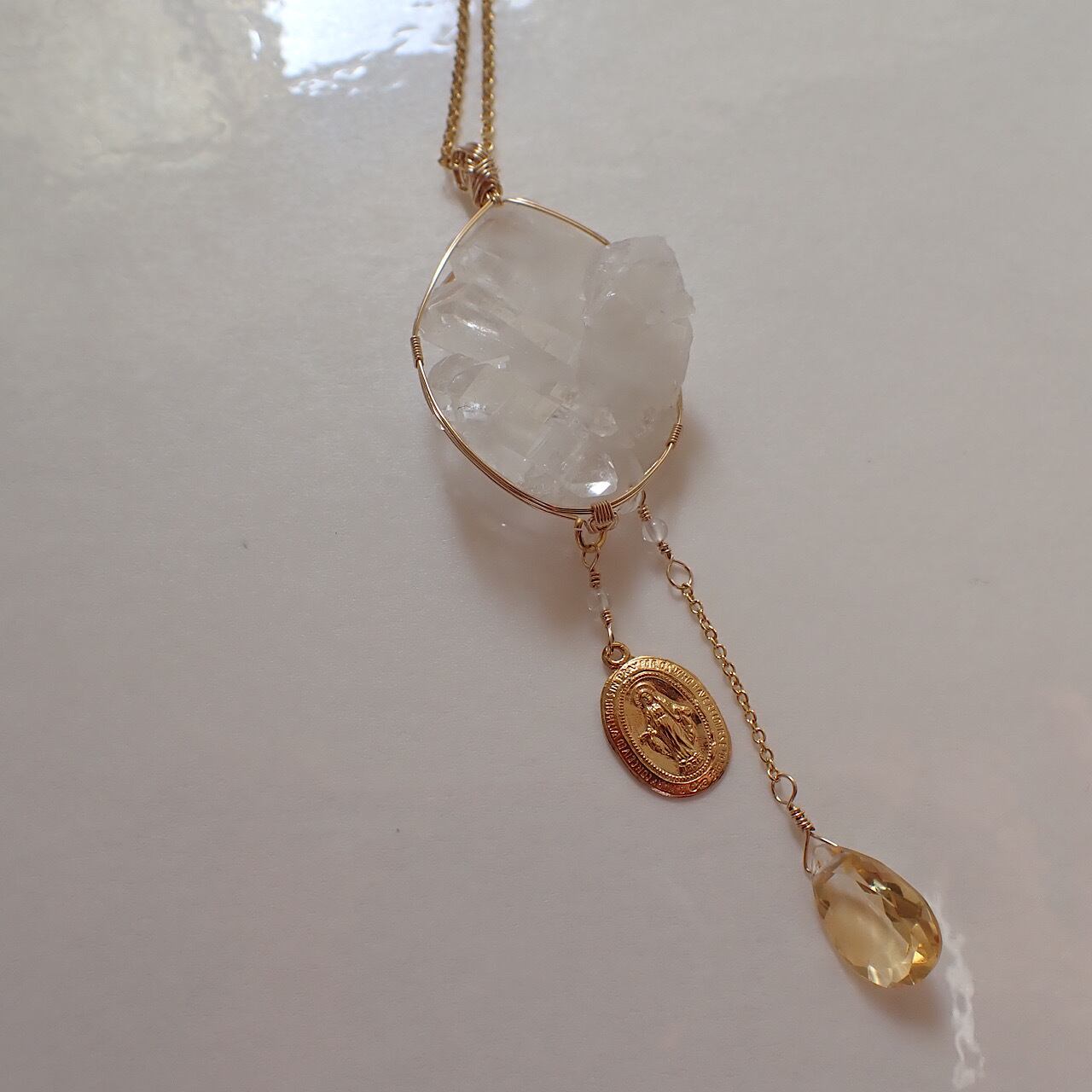 ファーデンクォーツ、穴あきの小さなシトリン、14kgfのメダイの女神巻きペンダントトップです。ファーデンクォーツを巻き終わってからここに黄色を足したくなりました。黄色を足すと今度はチャームを足したくなりました。メダイを足すと優しさと光が増したような気がしてとても素敵なペンダントトップになりました。繋ぎの部分の小さなビーズは水晶です。