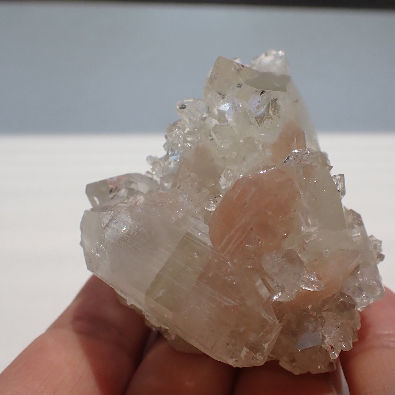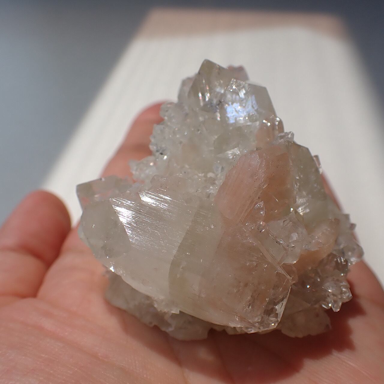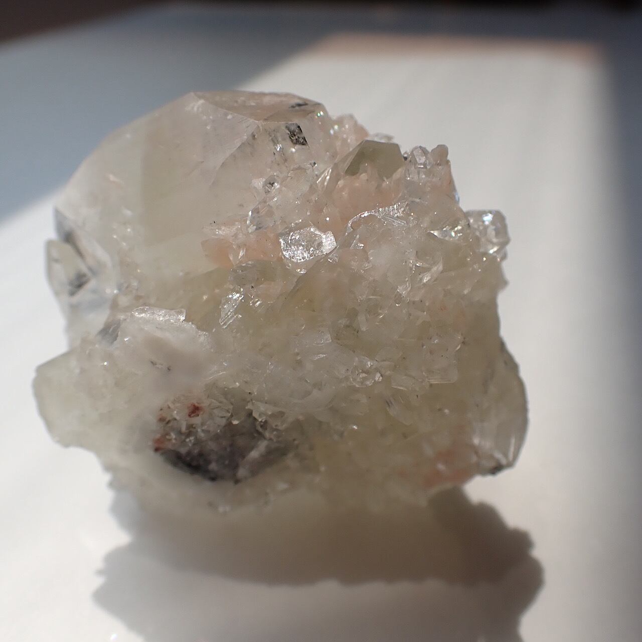 少し黄色がかったアポフィライトで、結晶の一つ一つがとても綺麗です。透明やグリーンのアポフィライトも良いですが、こちらもレアで素敵です。アポフィライトの透明度の高い結晶が放つ光はとても神々しく、サードアイを活性化させてくれます。