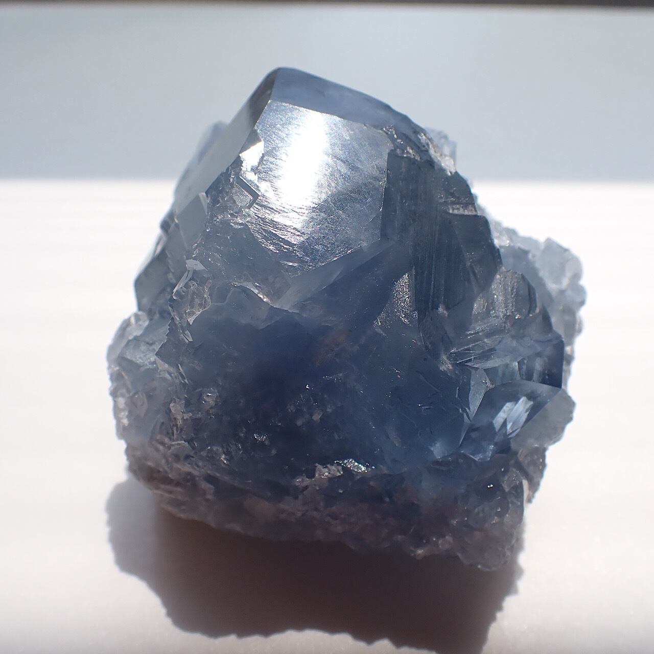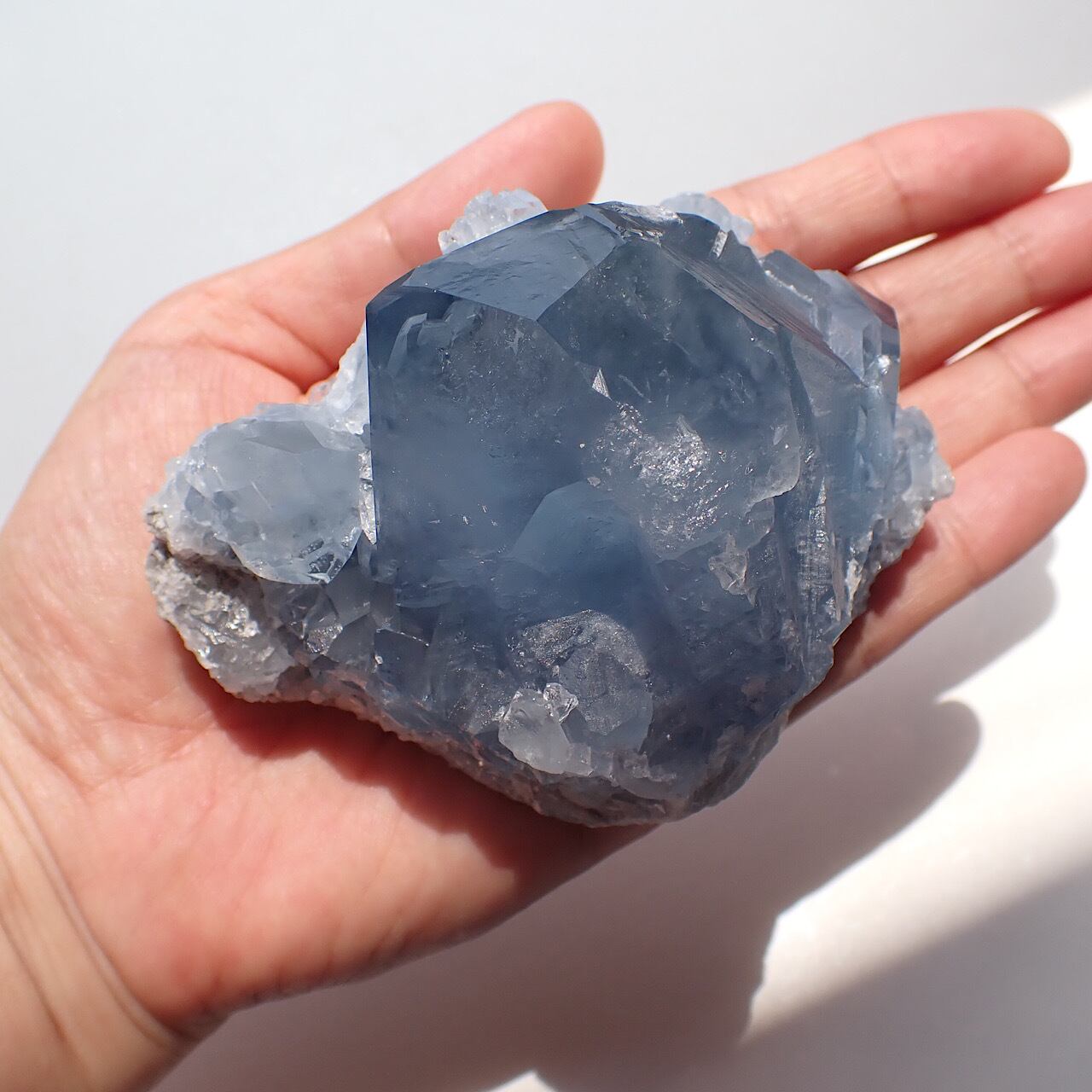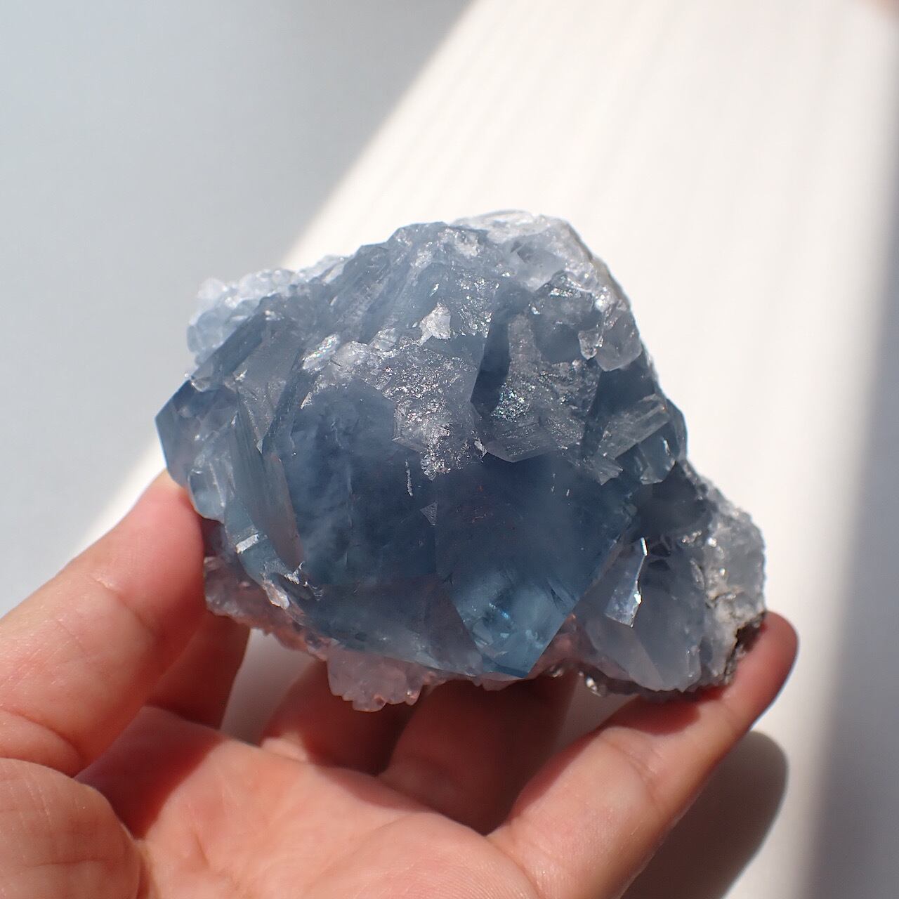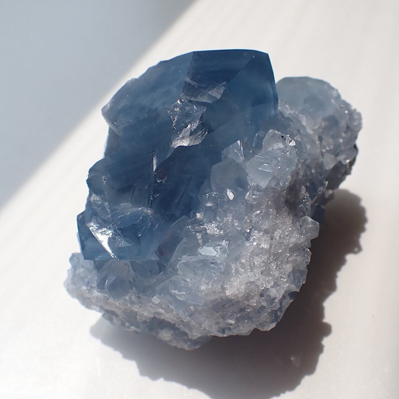 大きな結晶、その青さに圧倒されます。海を見ているような気分になります。ちなみにこの結晶を下にひっくり返すとまた違うセレスタイトの表情がお楽しみ頂けます。とてもおススメです。