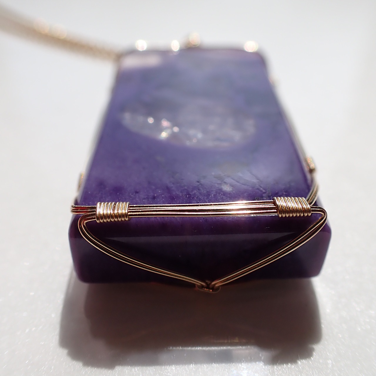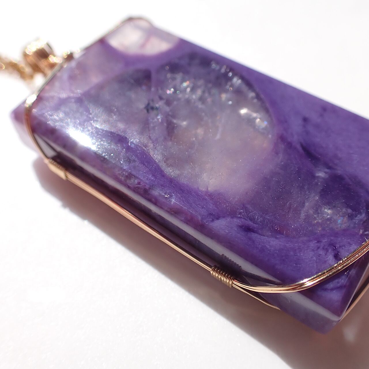 世界三大ヒーリングストーンのひとつ、大きめサイズのチャロアイトで、形と模様も独特かもしれません。真ん中の虹の部分に引き込まれるようで、他にはない魅力を感じます。見つめているとそっと静かに癒してくれそうです☆