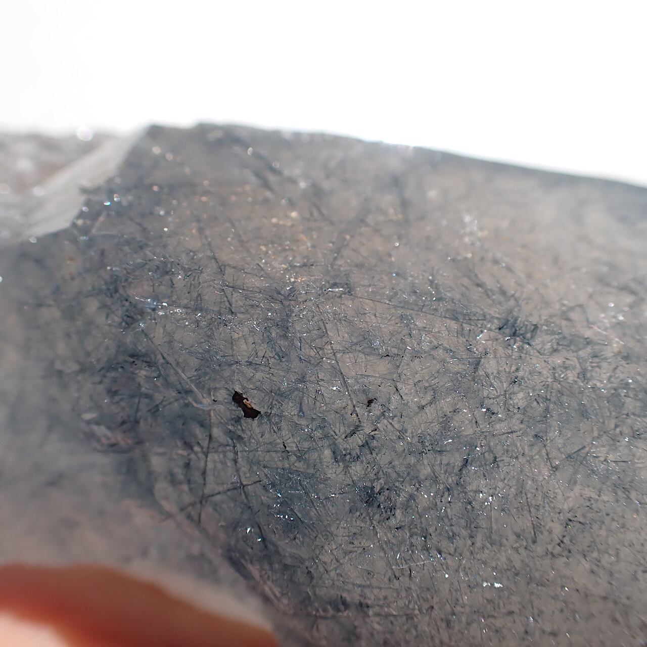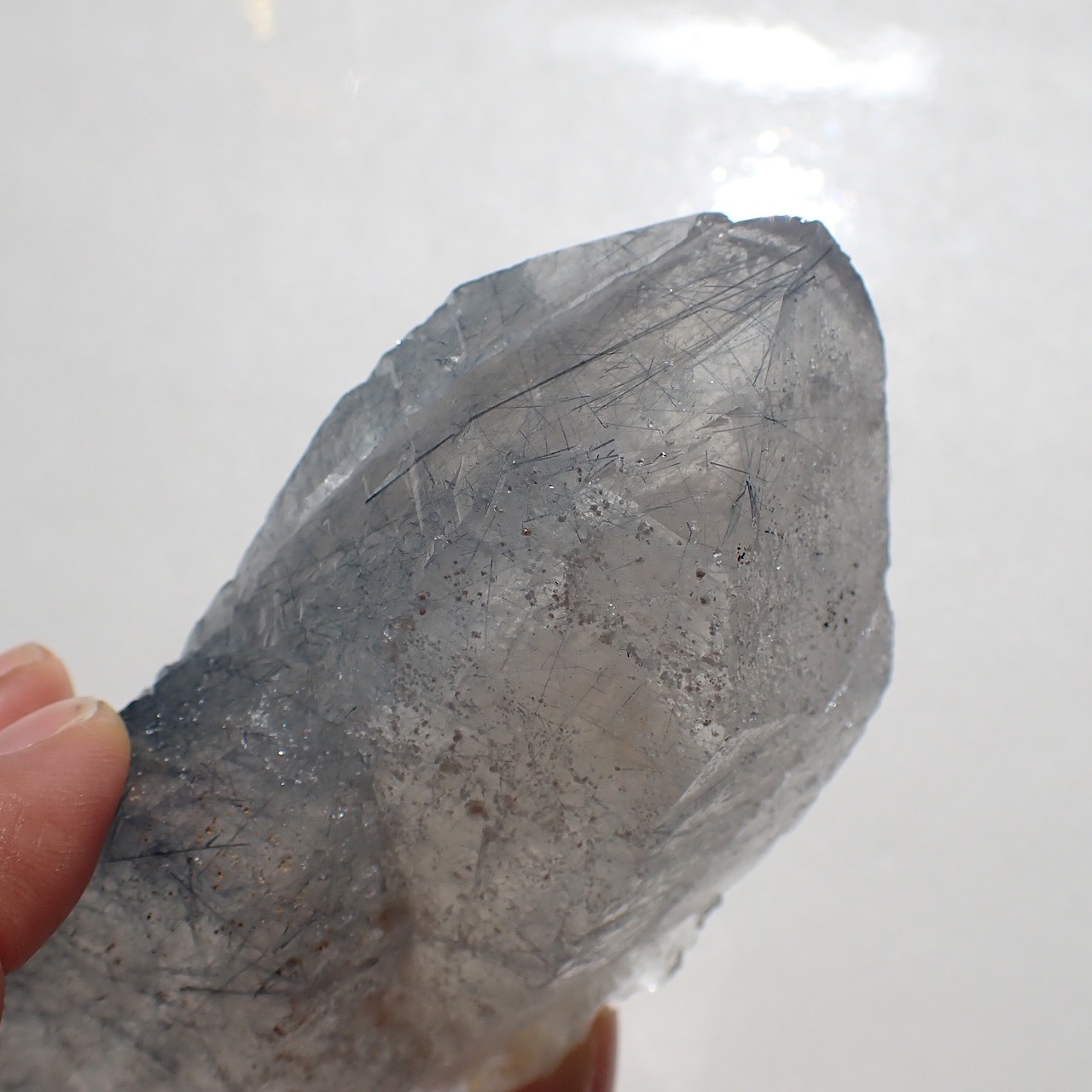 インディゴライト(ブルートルマリン)を内包した水晶です。針状のブルーが全体的に優しい色味を醸し出し、とても綺麗です。形もかわいく、私はいつまでも見ていられます。