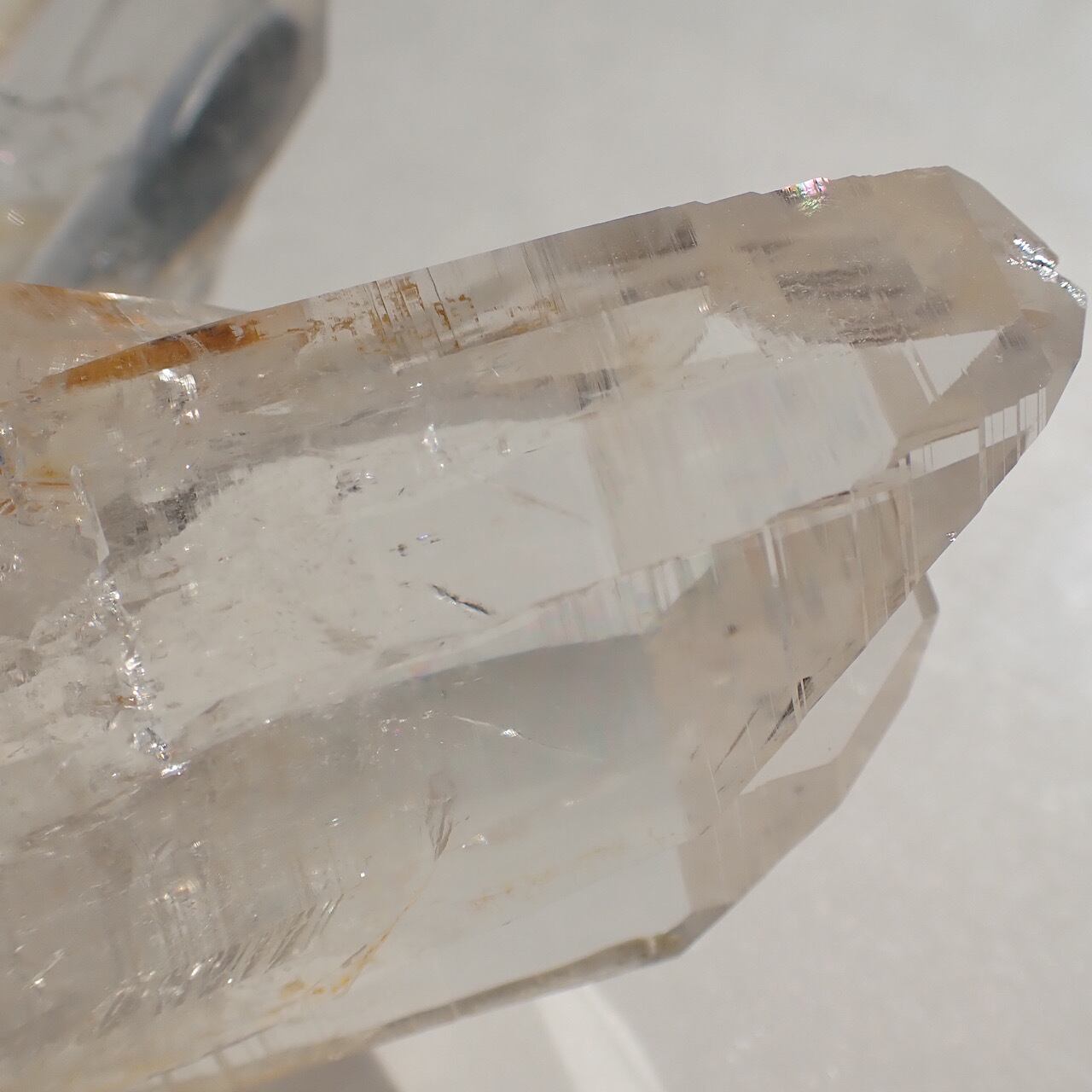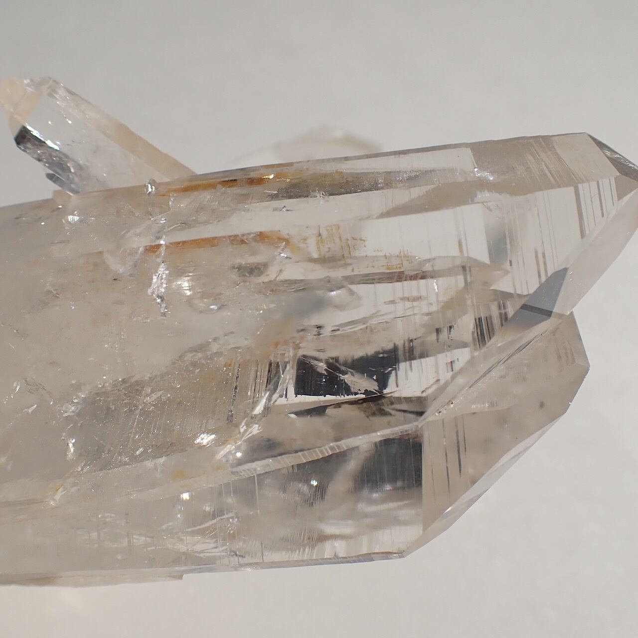 とてもかっこ良いコロンビアのクリスタルです。透明な部分と白い部分があり、小さな結晶がたくさんくっついてプチクラスターのようなところもあります。1番大きなメインの水晶はツインだと思いますが曲がっているように見えて面白いです^_^