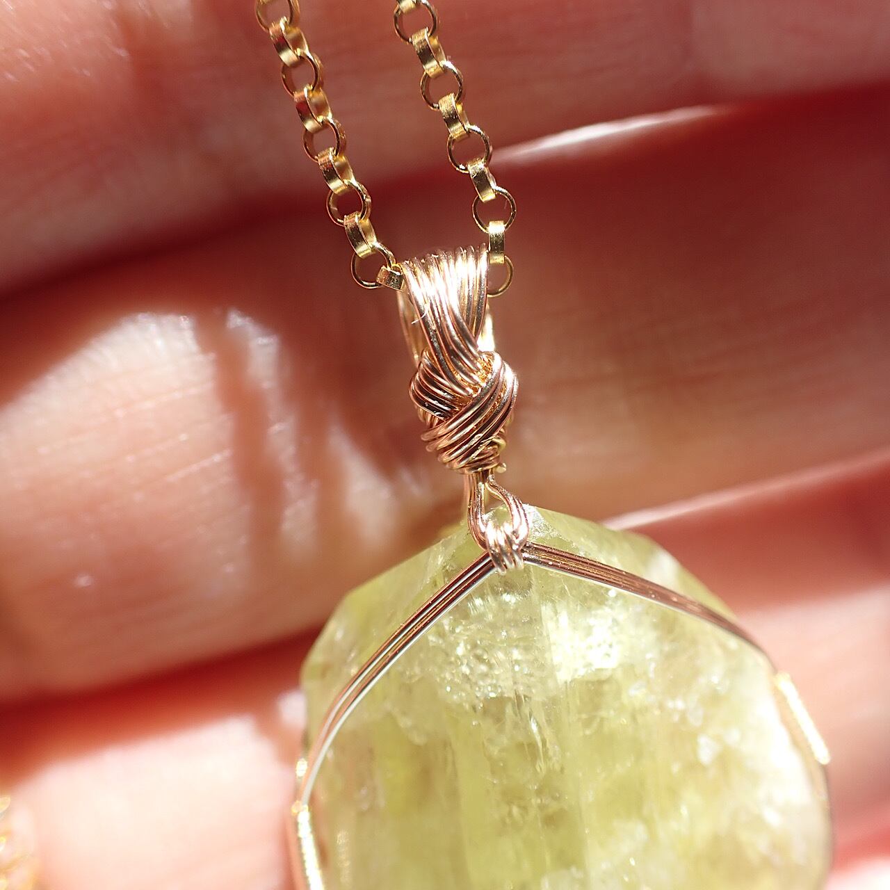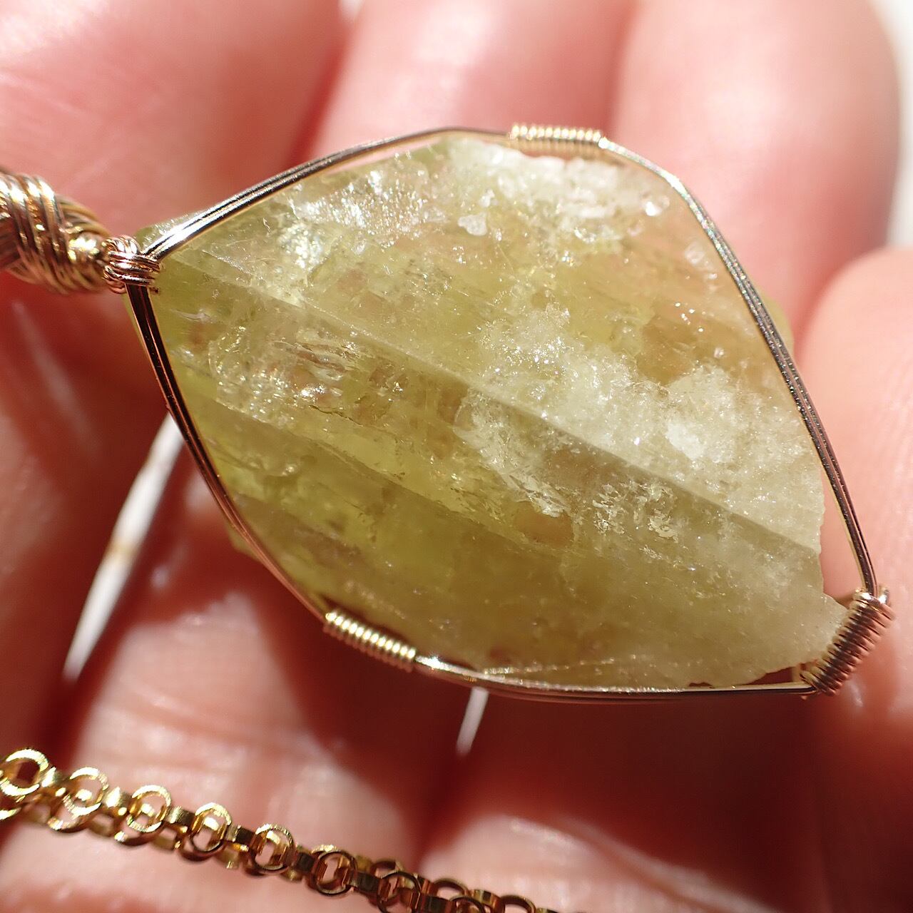 発見されたのが比較的新しいブラジリアナイト原石の女神巻きペンダントトップです。ブラジリアナイトは硬度が低く傷つきやすい石とされています。こちらは結晶にテリツヤがありゴールドグリーンのような、黄色に緑を混ぜたような色をしています。女神のような光と、安定した穏やかに続けるエネルギー、堅実なサポート、忍耐力のようなイメージが出てきます。とても美しい石です。