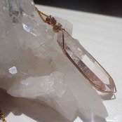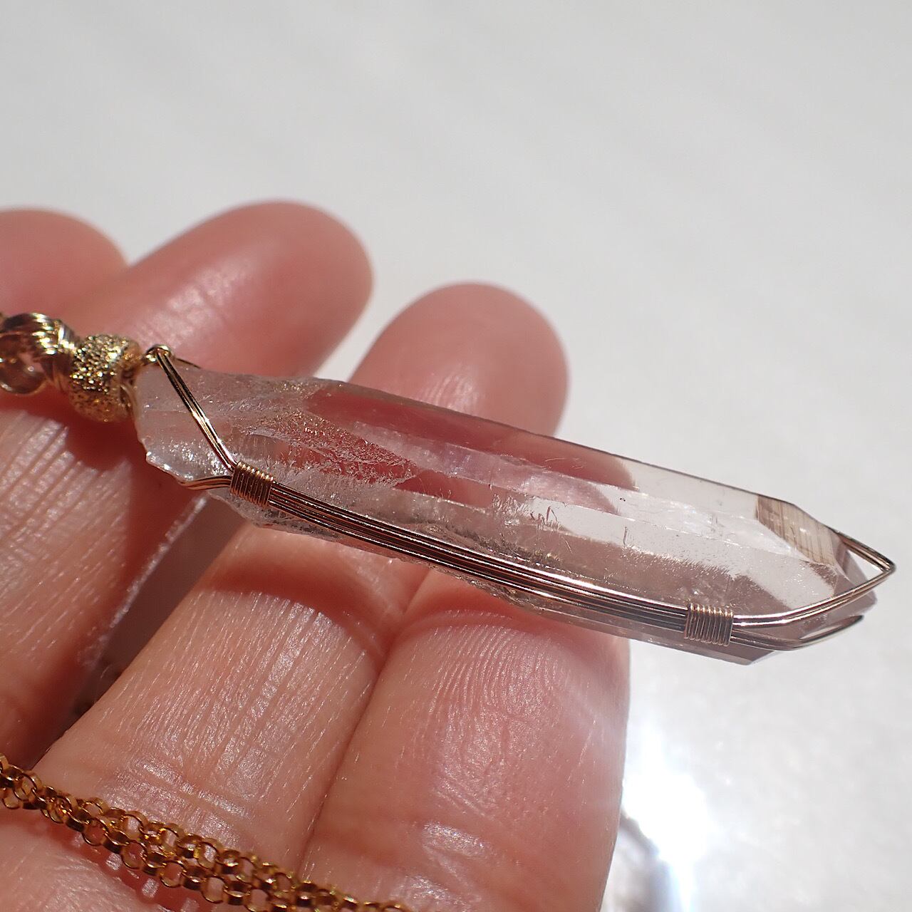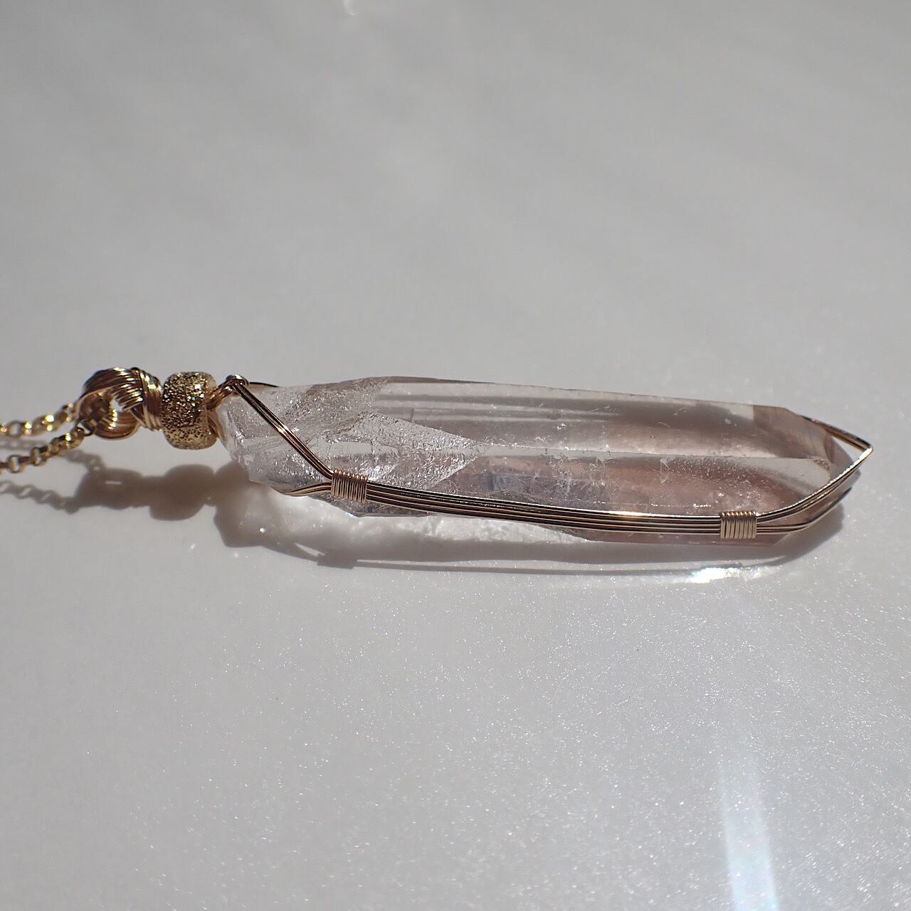 ブラジル・ゼッカデソーザのポイント水晶です。地中で付着したと思われる薄いピンク色と佇まいに惹かれて女神巻きにしました。