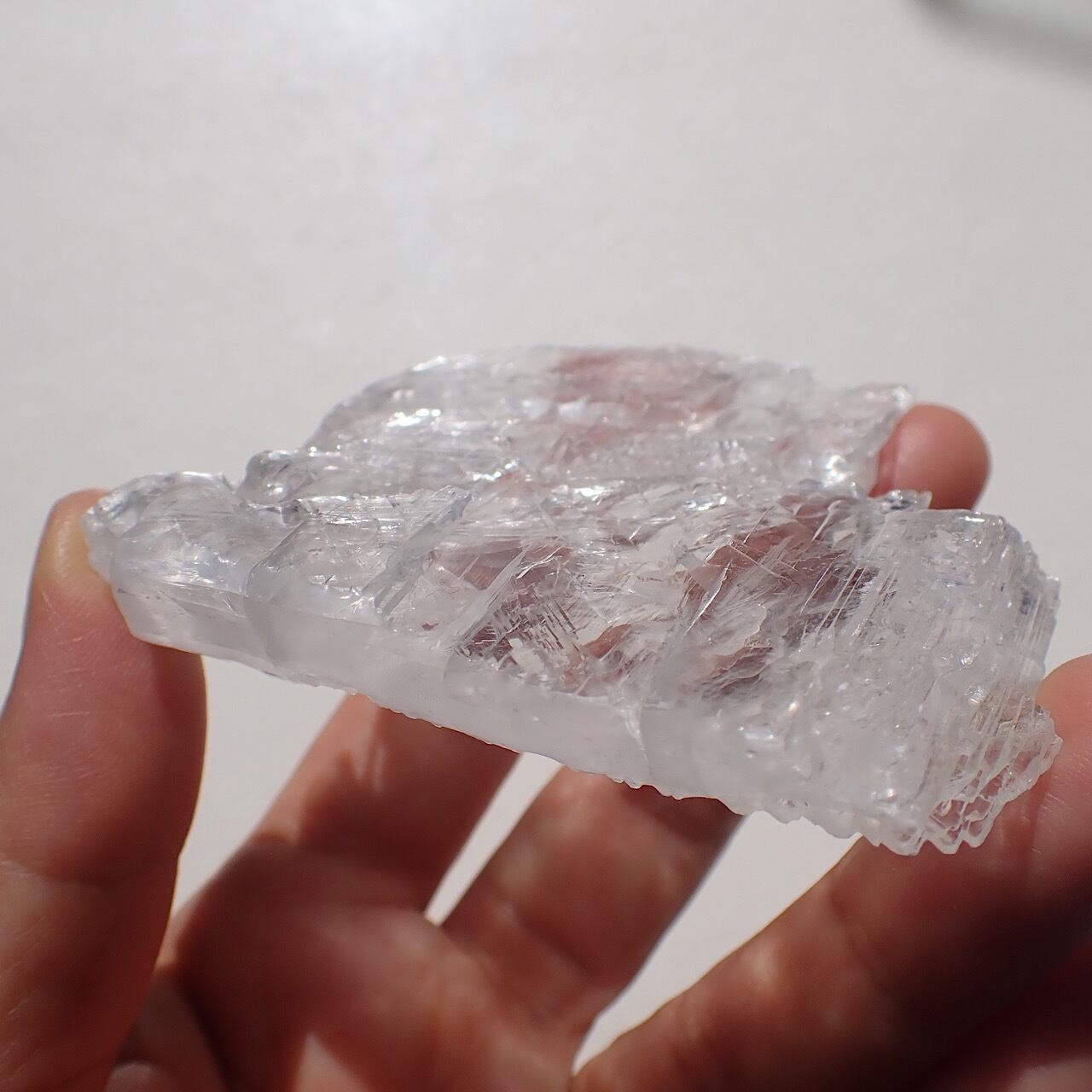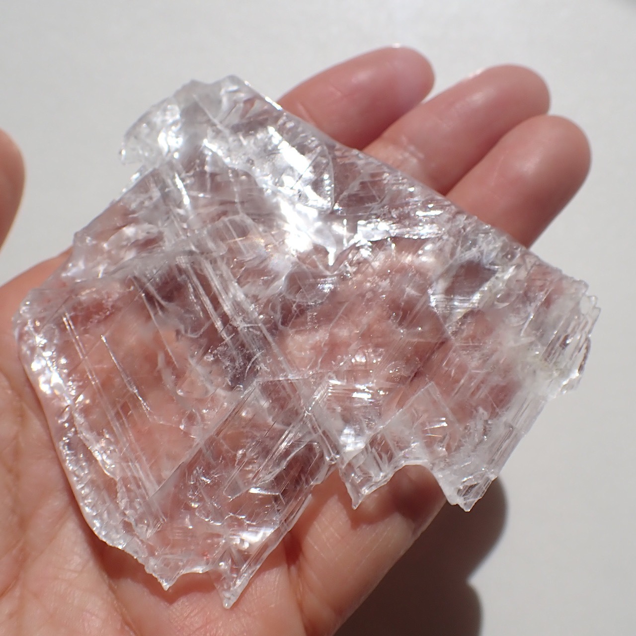今では採掘が禁止されているメキシコ・ナイカ鉱山のセレナイトです。小さめの手のひらサイズです。表面は平ではないですが、セレナイト特有のシラーの美しさは出ていてとても癒されます。