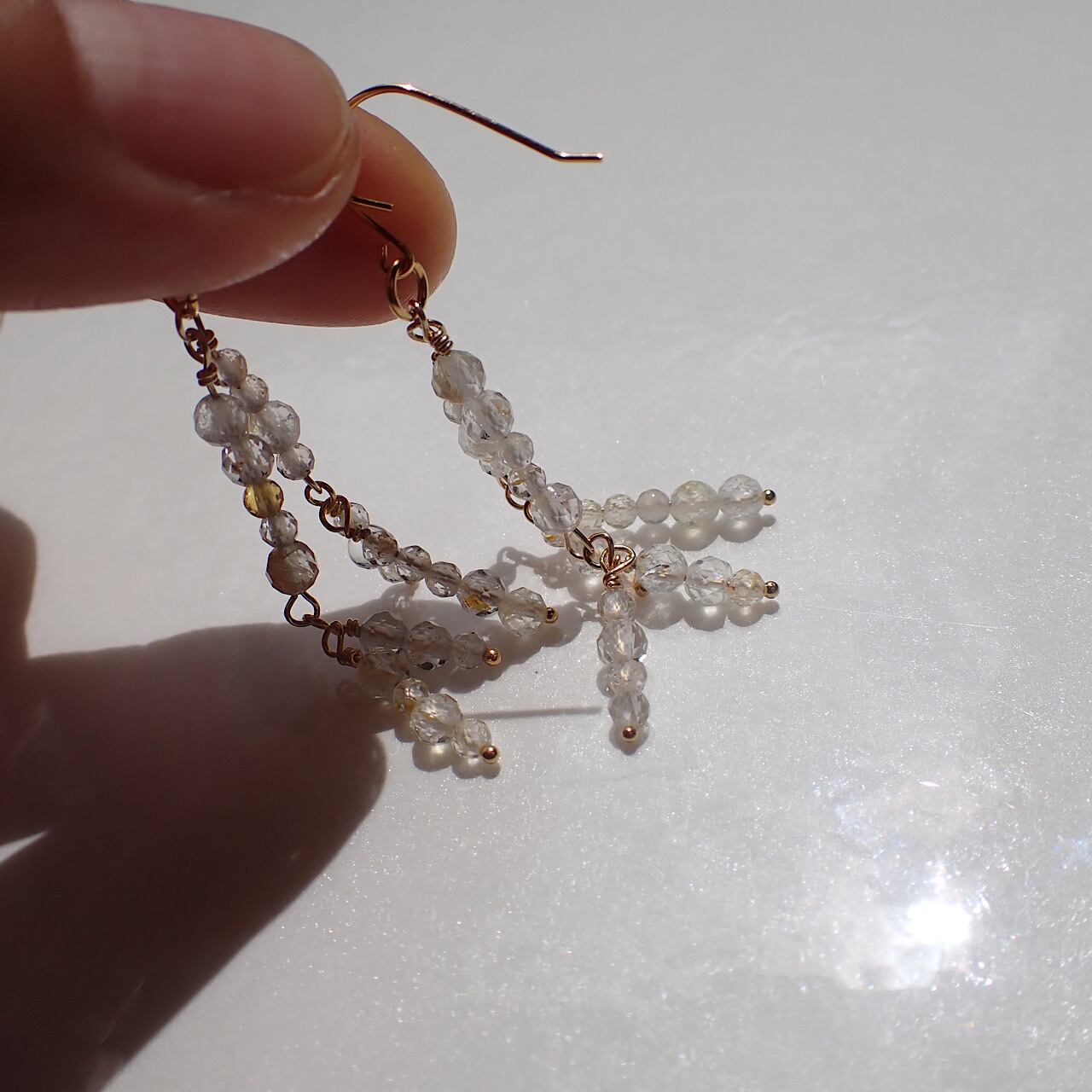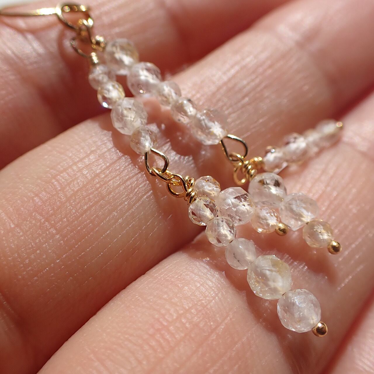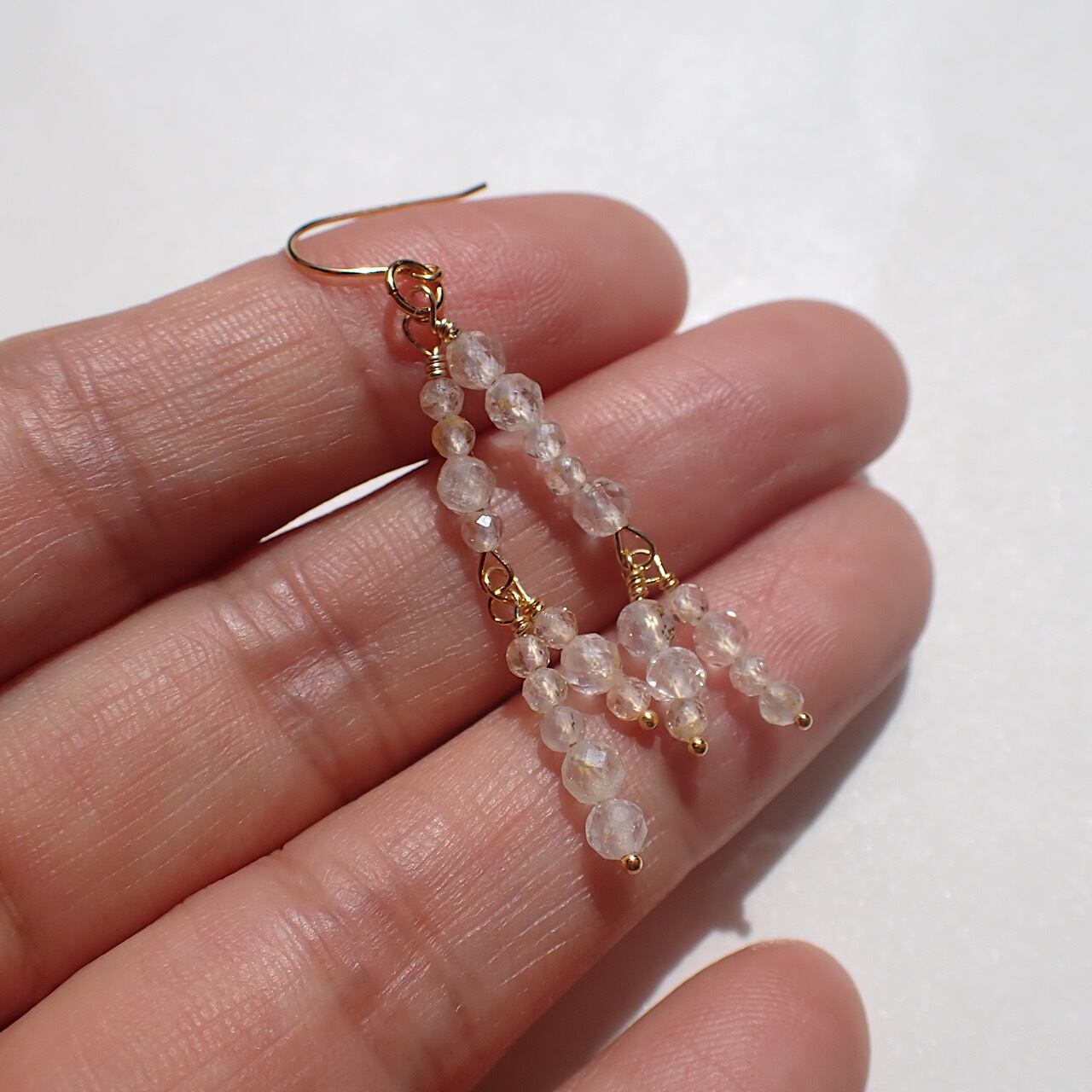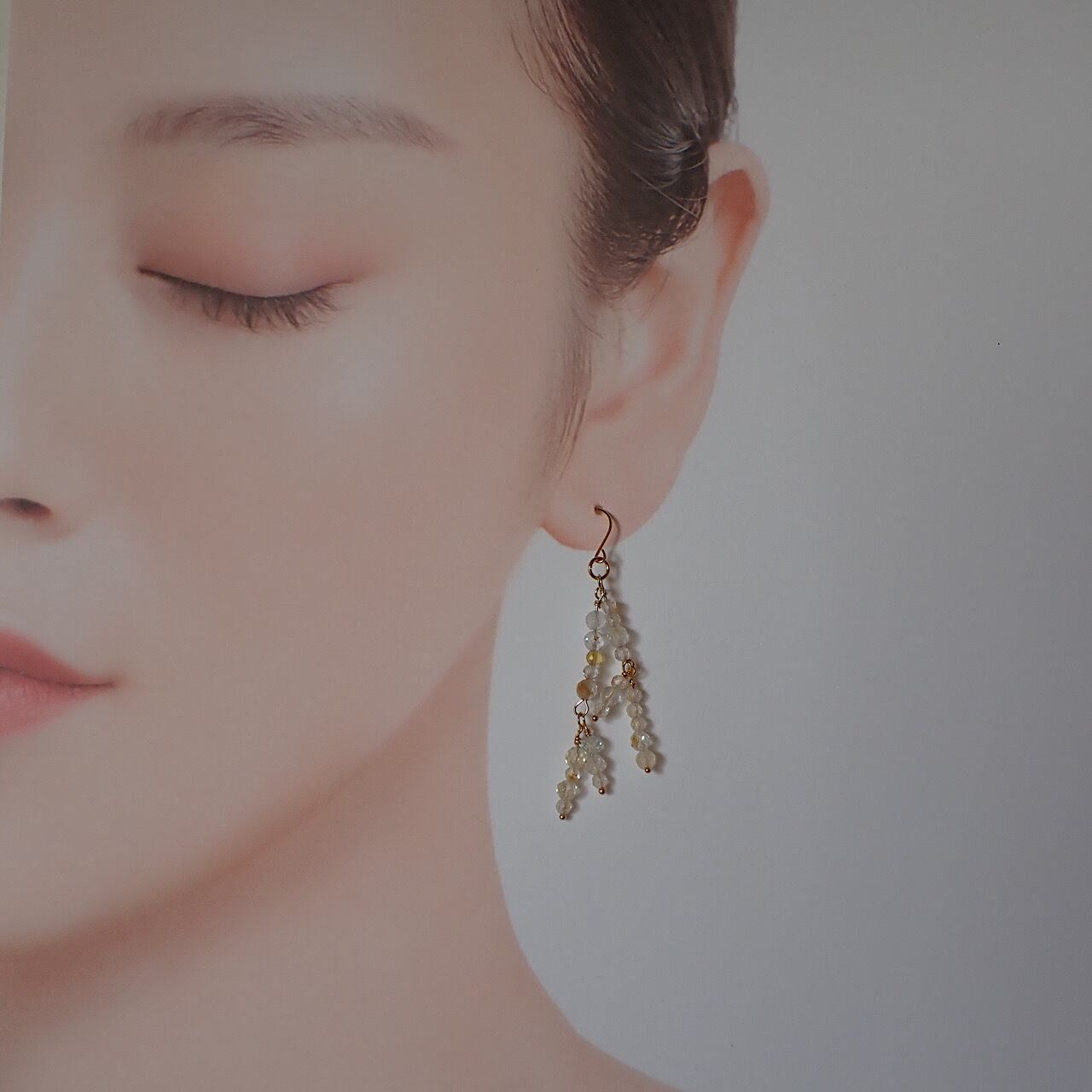 少し色のついた粒やホワイトなどランダムに入っています。シンプルですが石の細かなカットが繊細で耳元で揺れるのがとても綺麗です☆