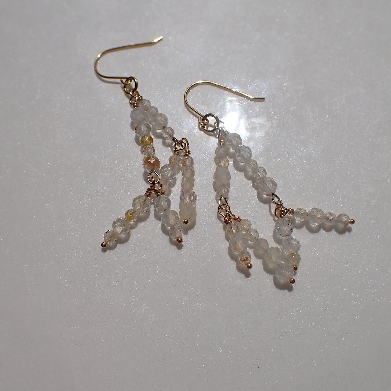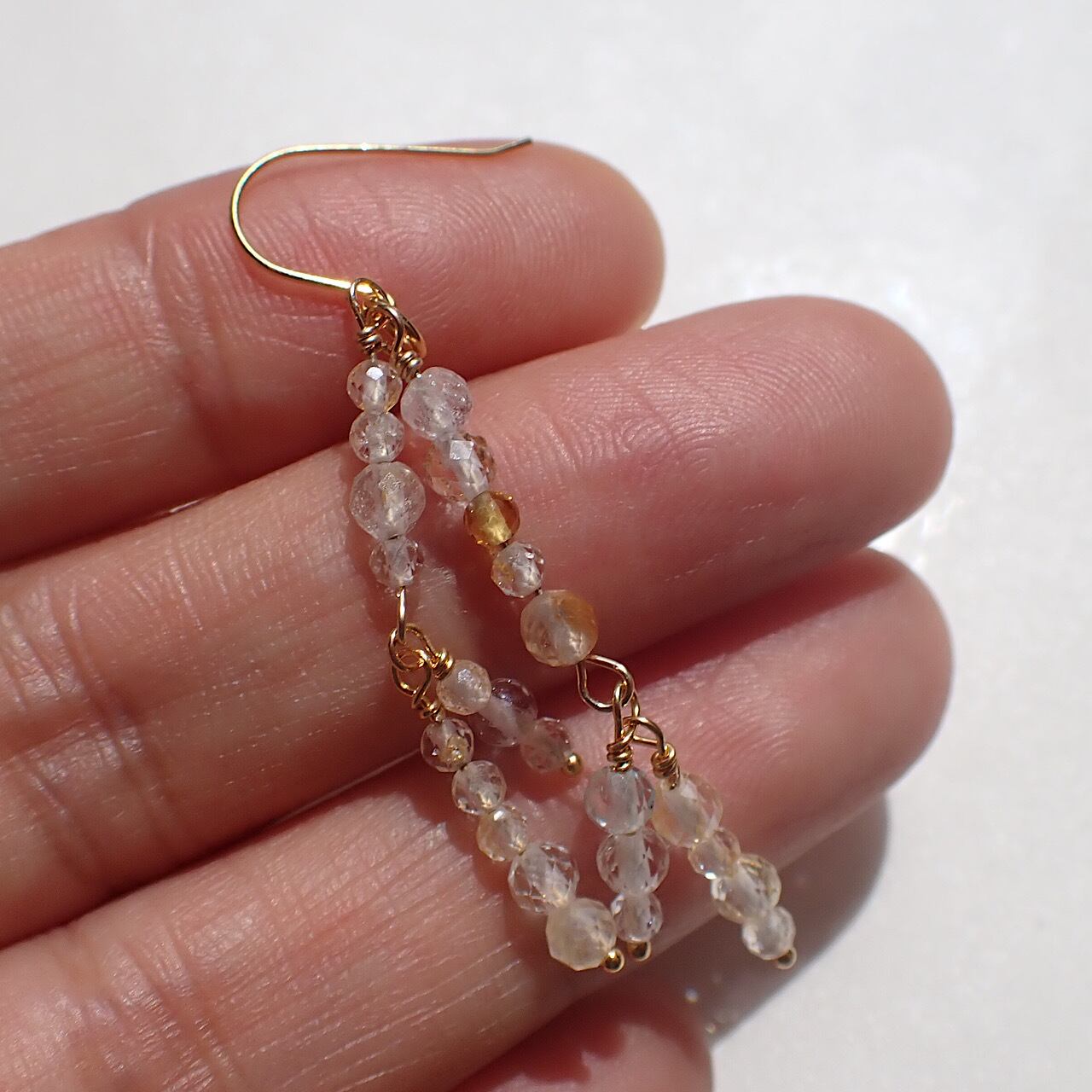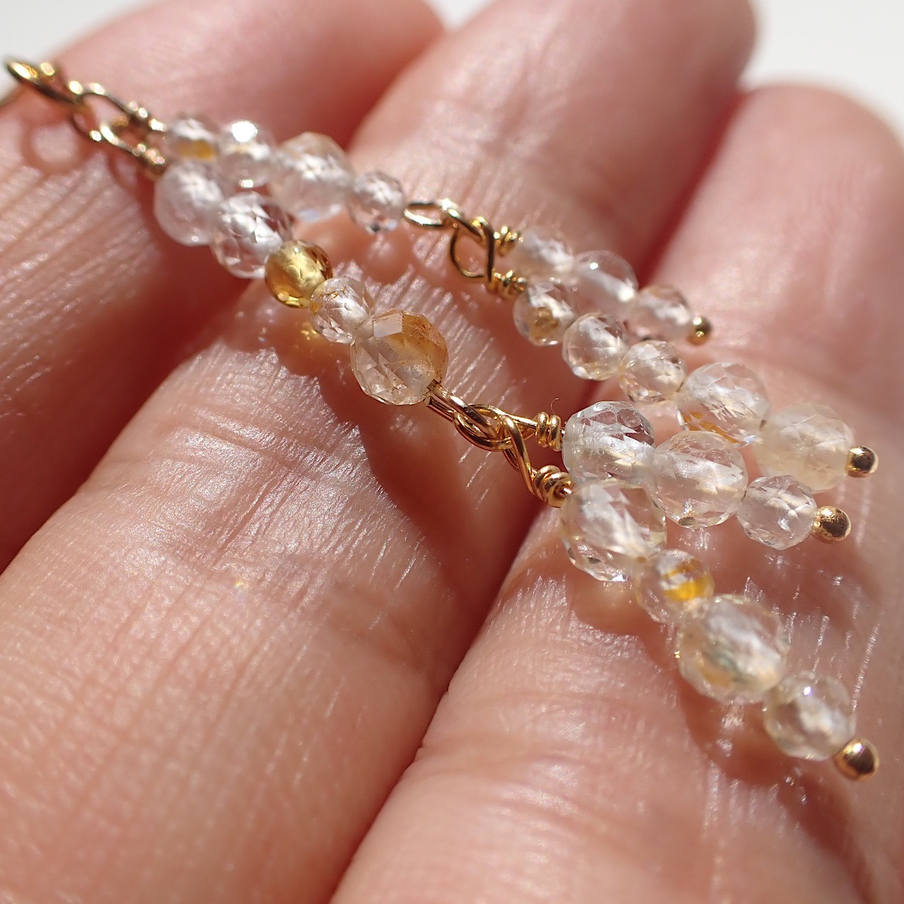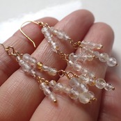 少し色のついた粒やホワイトなどランダムに入っています。シンプルですが石の細かなカットが繊細で耳元で揺れるのがとても綺麗です☆