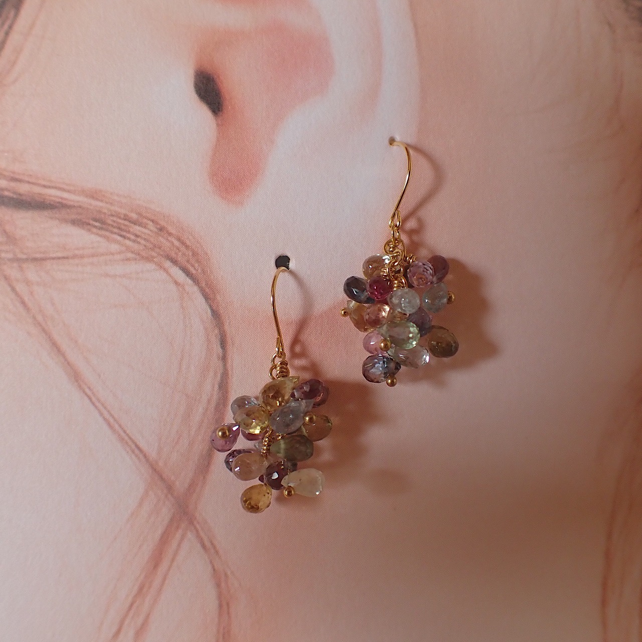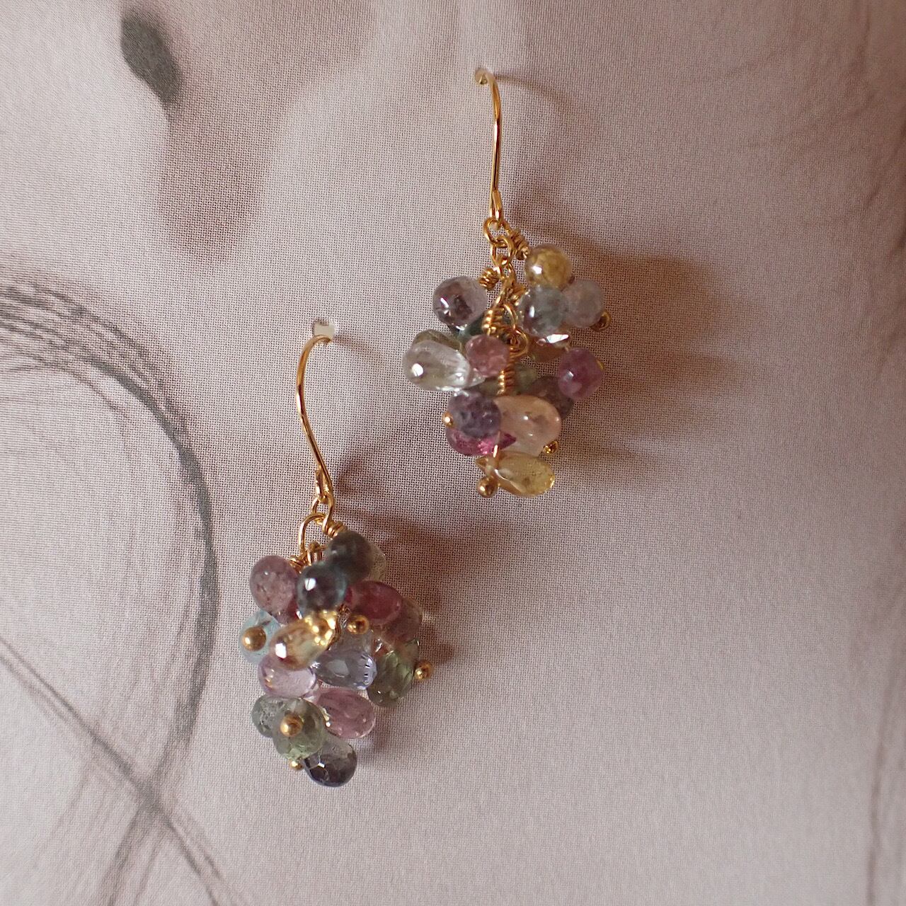 様々なカラーのサファイア、ブリオレットカットの小さな宝石ビーズを沢山使用してピアスを作りました。ピンクサファイアのピアスよりほんの少し粒が大きいかもしれません。