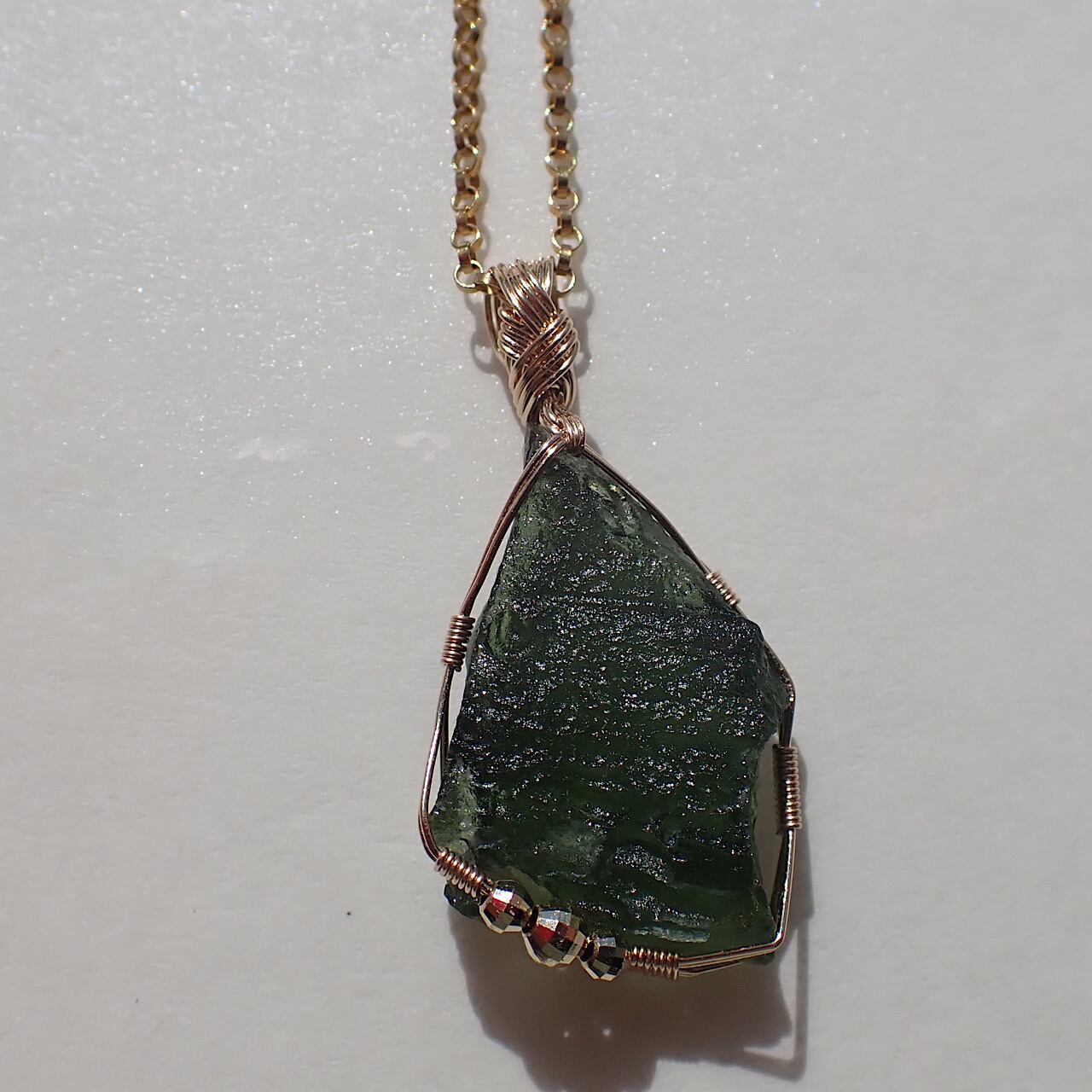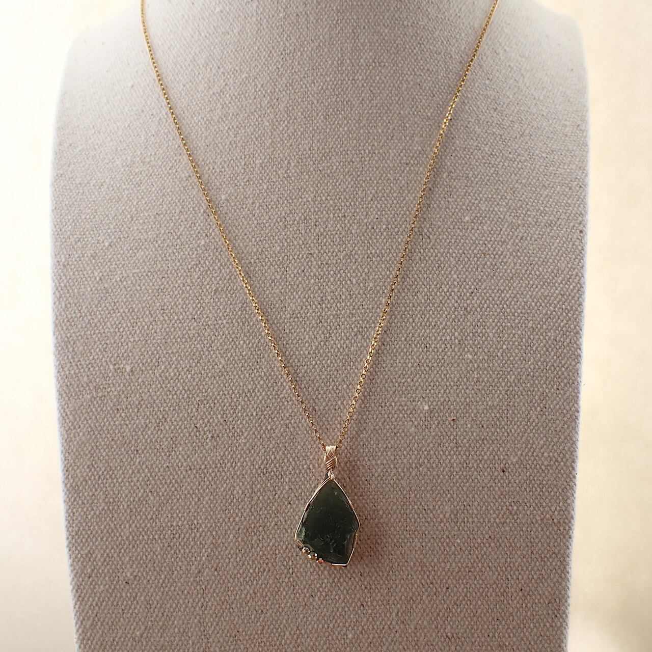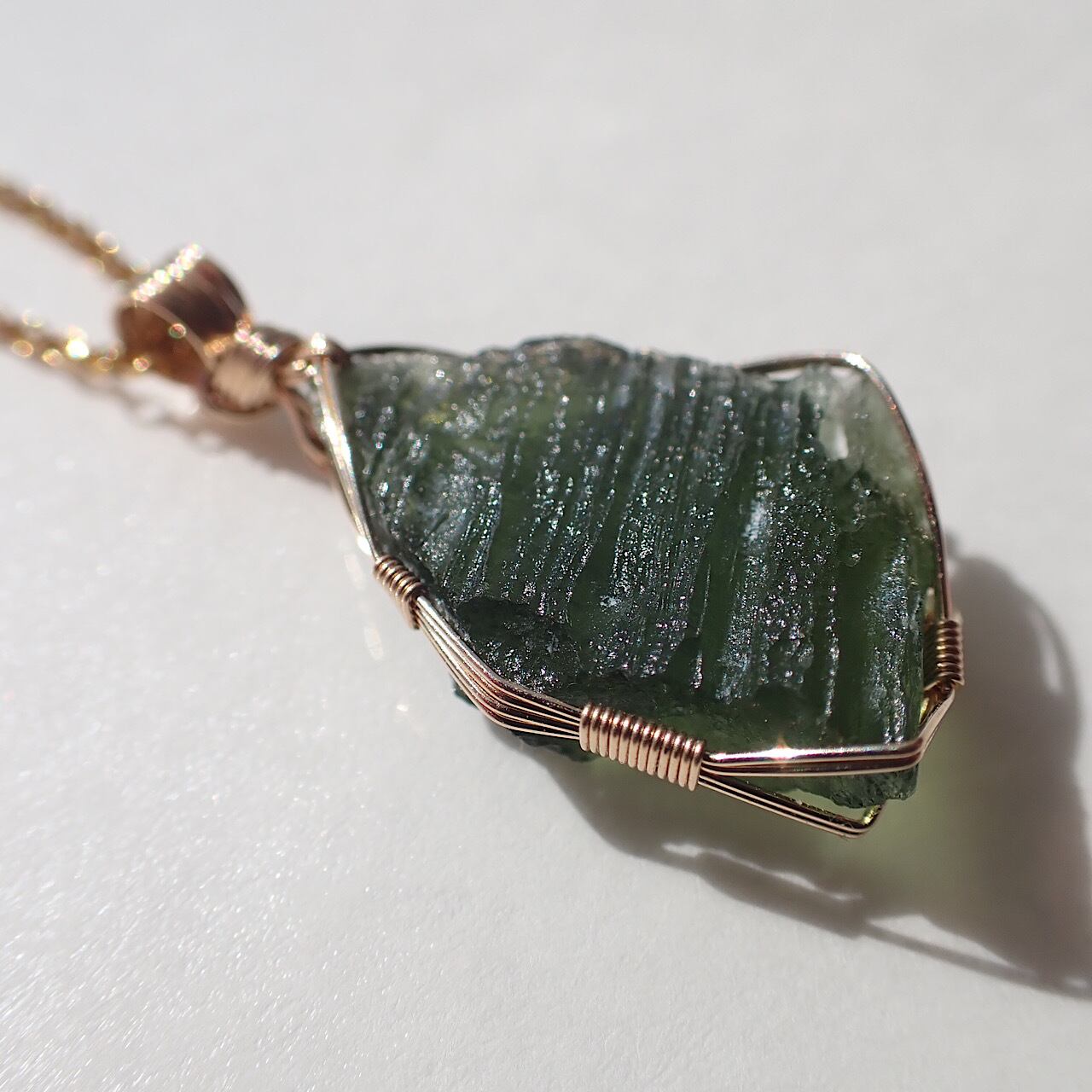 透き通ったとても綺麗なモルダバイト原石です。10Kビーズを3粒使いましたが裏面の模様や色も魅力的でどちらを前にしても着けて頂けると思います。