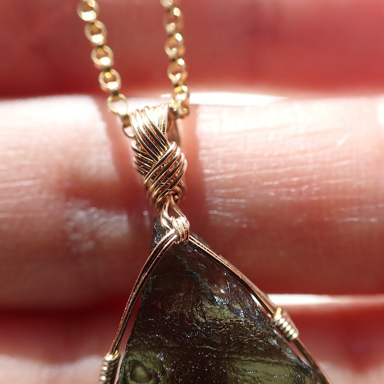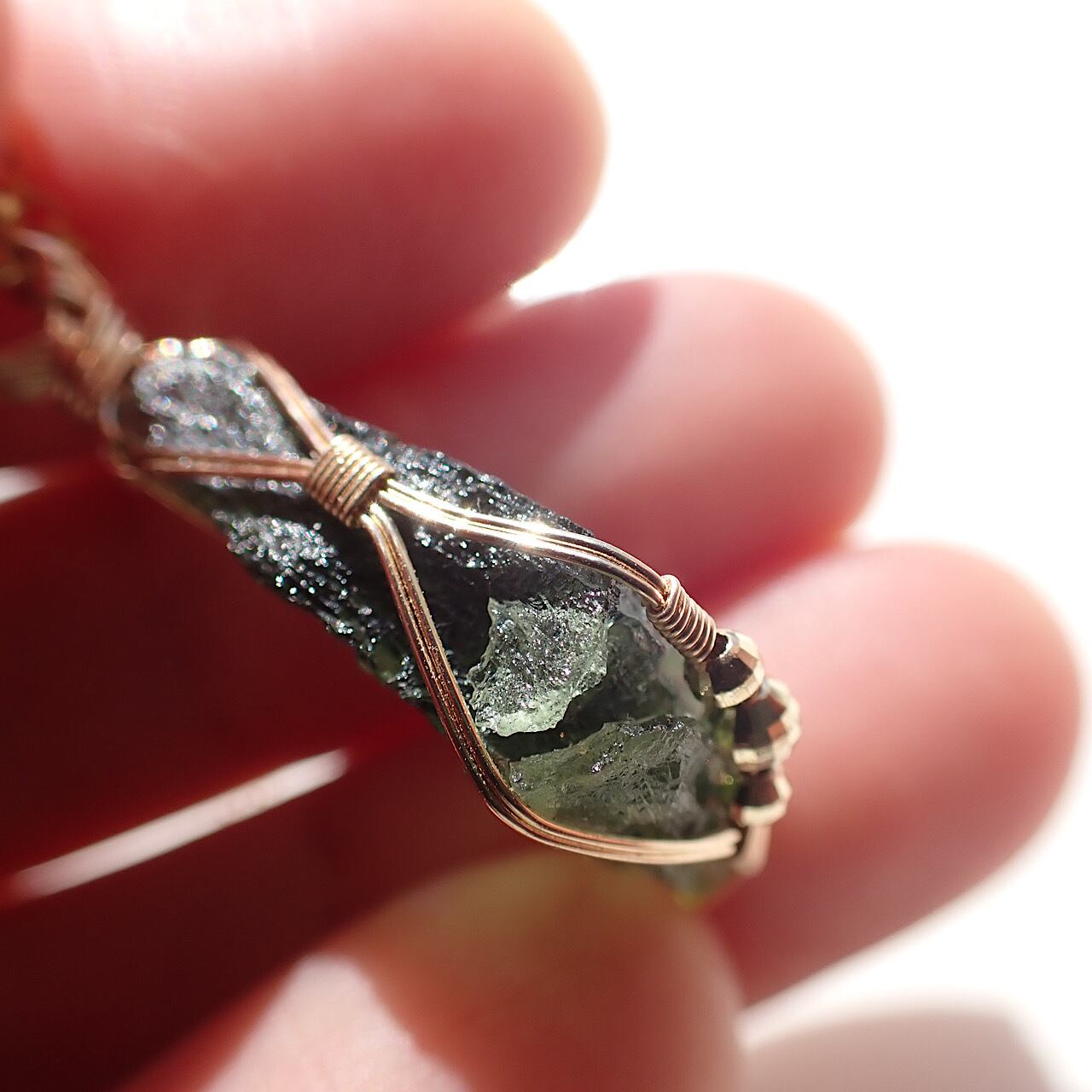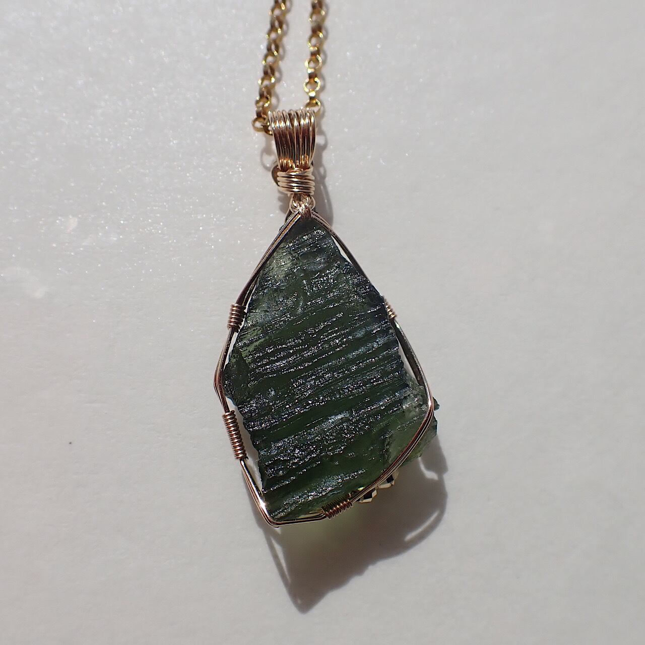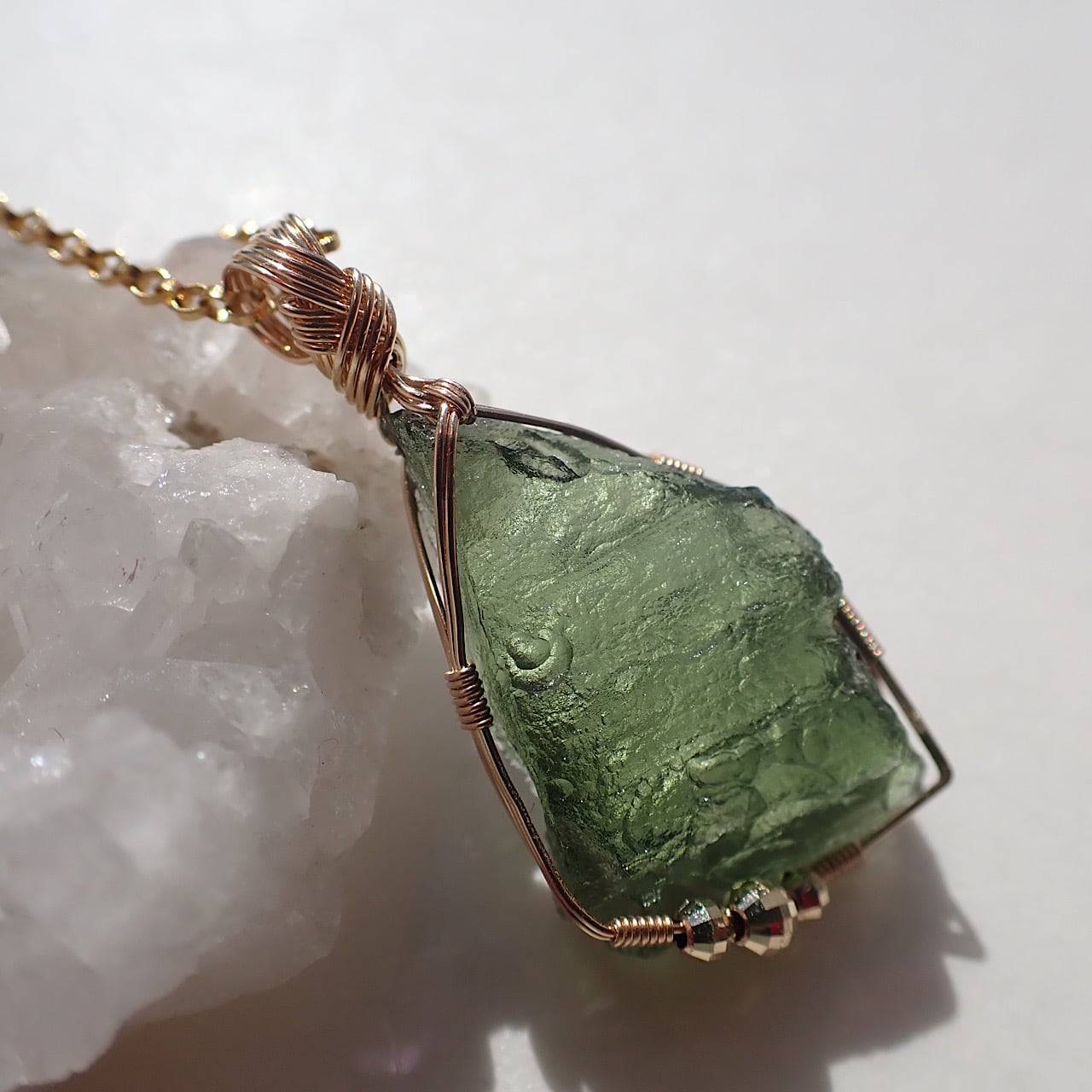 透き通ったとても綺麗なモルダバイト原石です。10Kビーズを3粒使いましたが裏面の模様や色も魅力的でどちらを前にしても着けて頂けると思います。