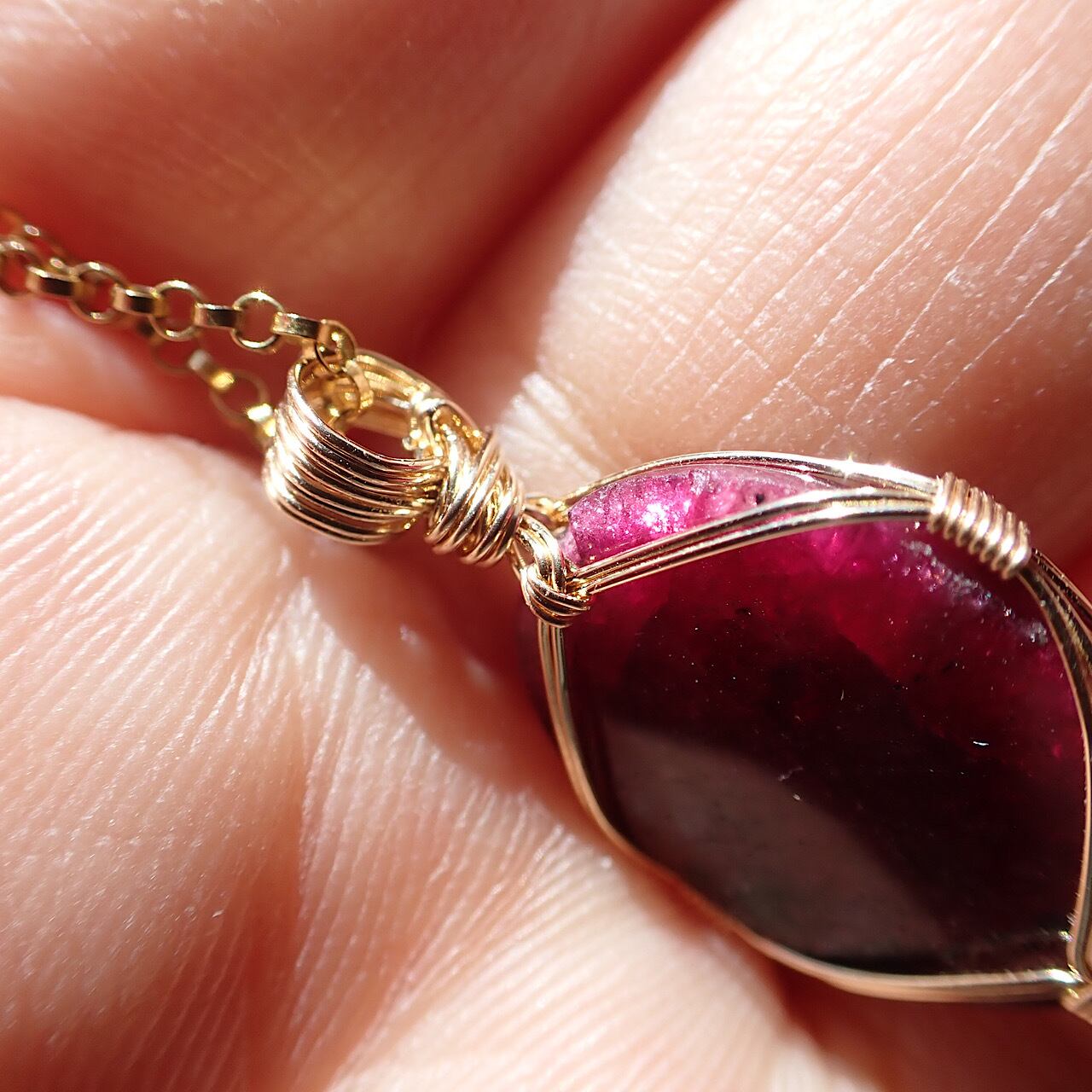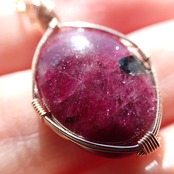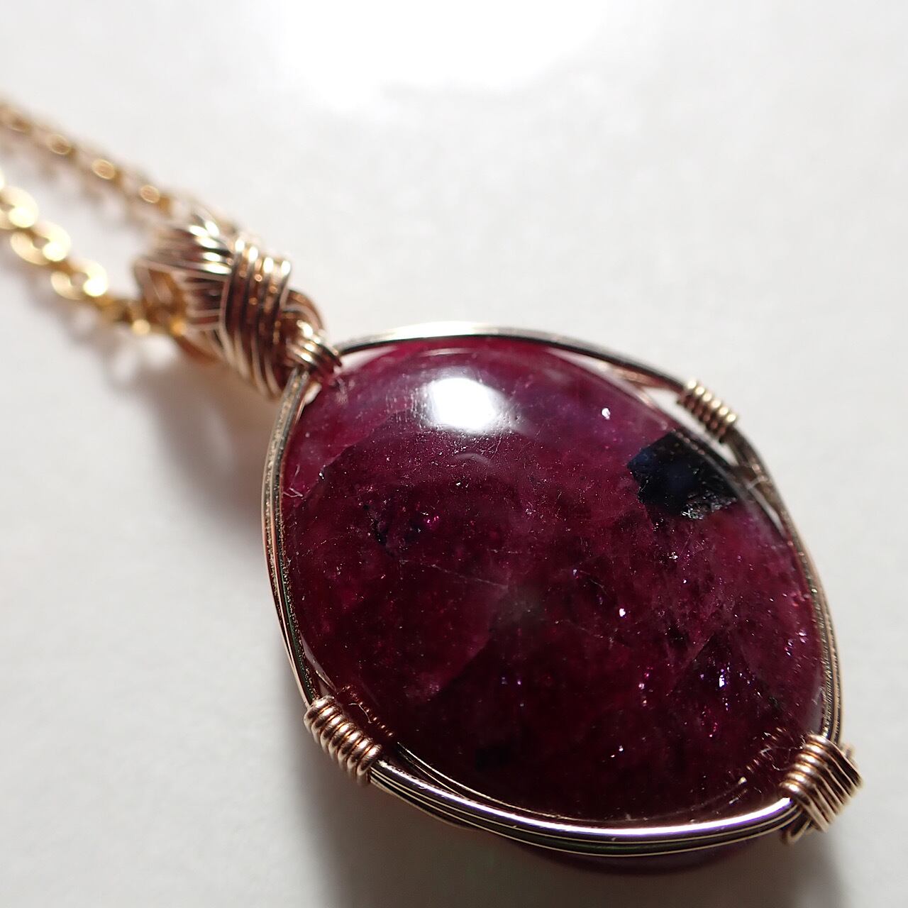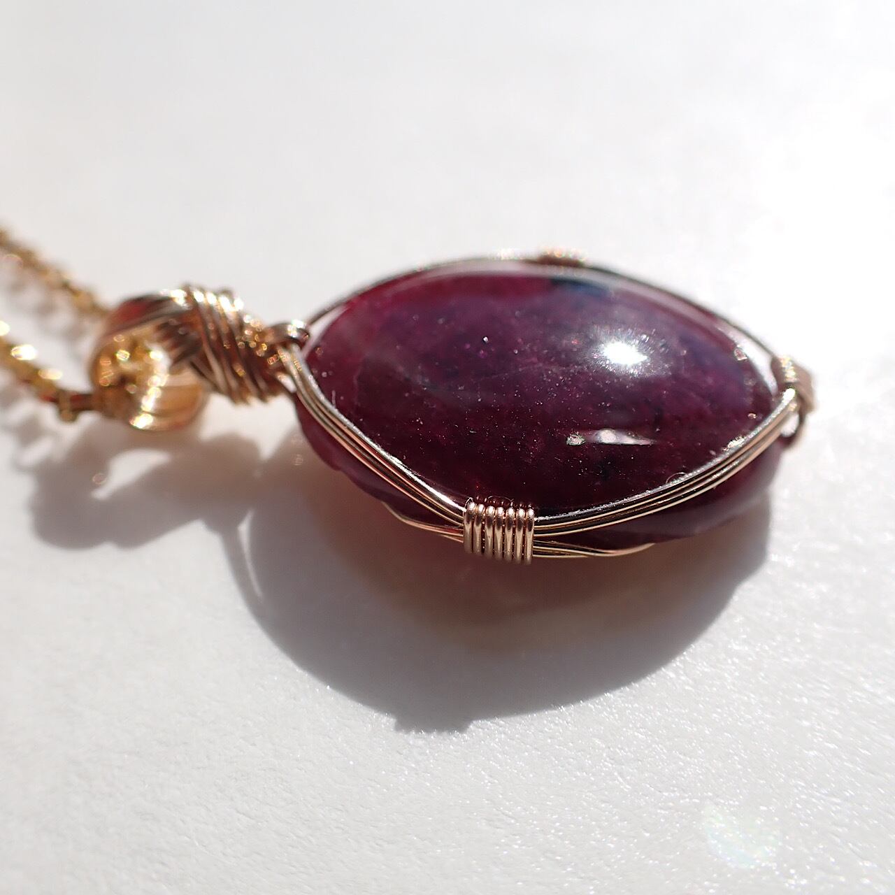 ユーディアライトの女神巻きペンダントトップです。ワインレッドのような深い色味がとても魅力的です。黒い部分はエジリンですが鉱物の混ざり方によって同じユーディアライトでも受ける印象(エネルギー)が異なるような感じがします。こちらのユーディアライトからは安心感、信頼感、とても大きなものの中に包まれているような静かで穏やかな月のような印象を受けます。海のように深いとても美しい石だと思います。