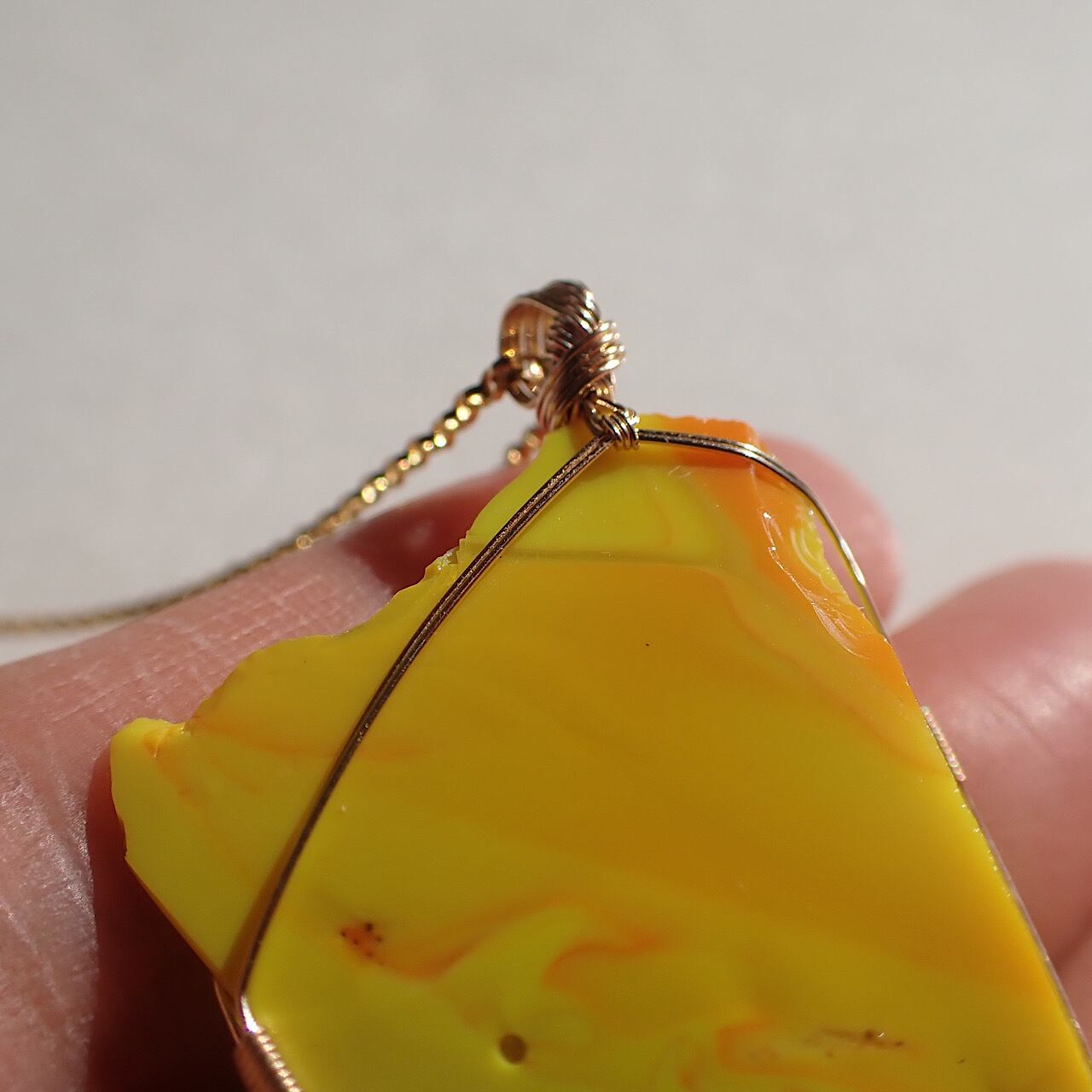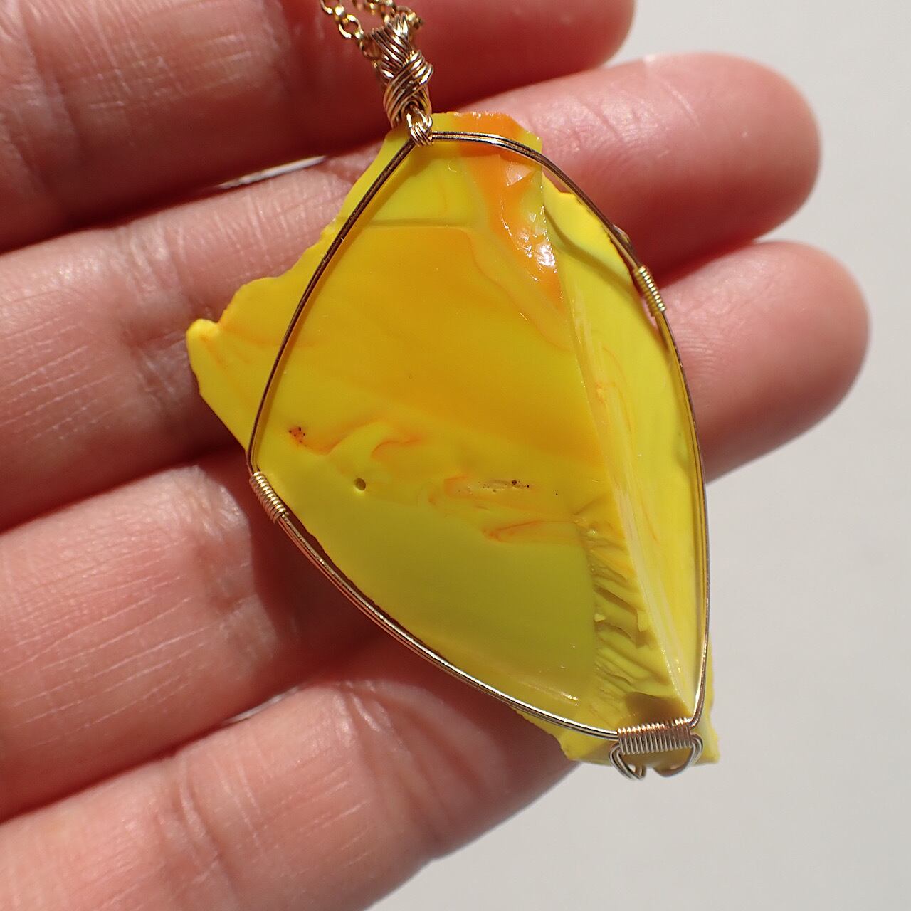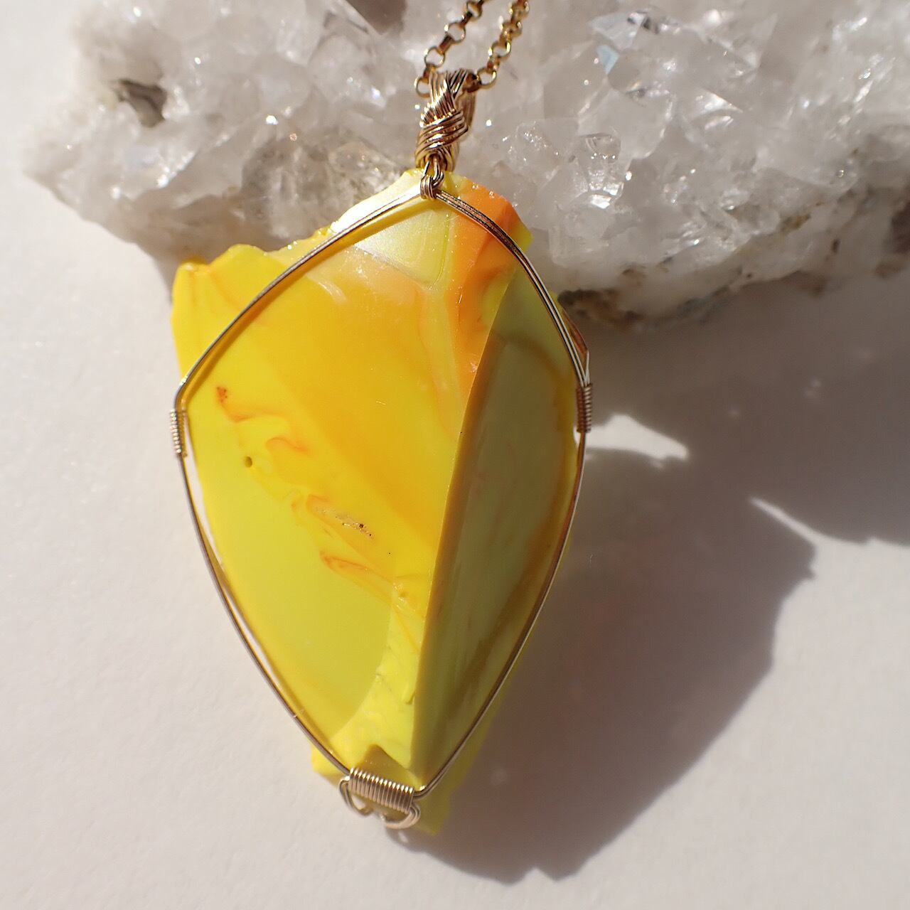 シエラネバダ産のサンフレアというアンダラクリスタルです。かなりレアなカラーだと思います。透明感はないですが綺麗で、今まで巻いた記憶のないタイプのアンダラクリスタルですが今回とても魅力を感じて女神巻きジュエリーにしました。