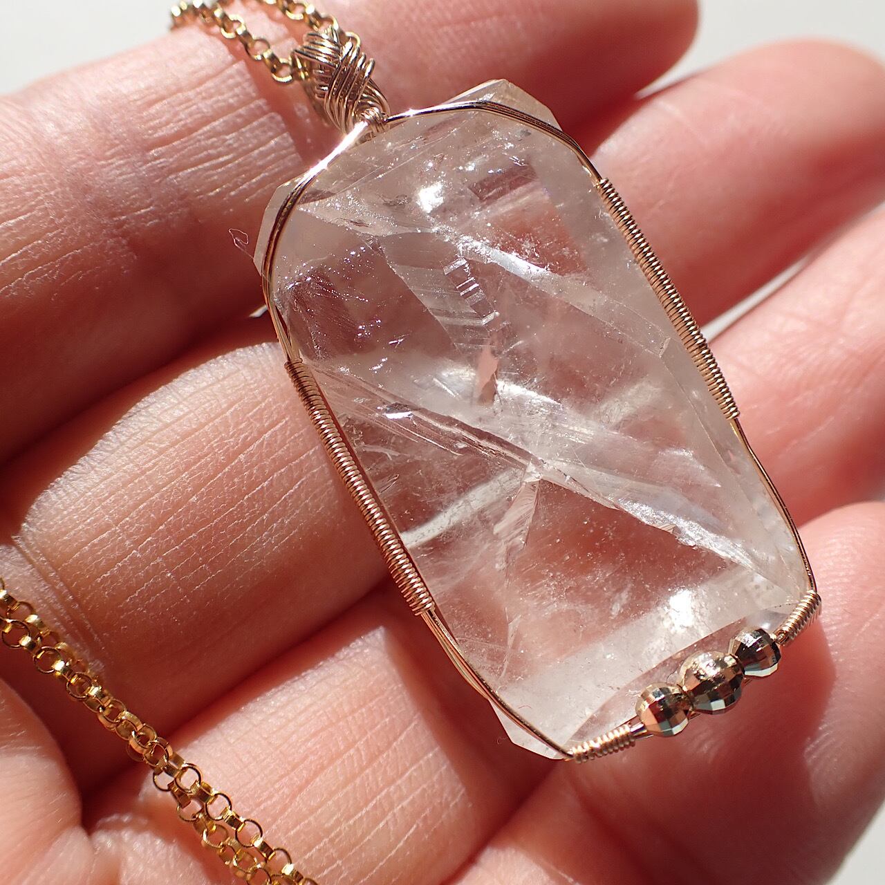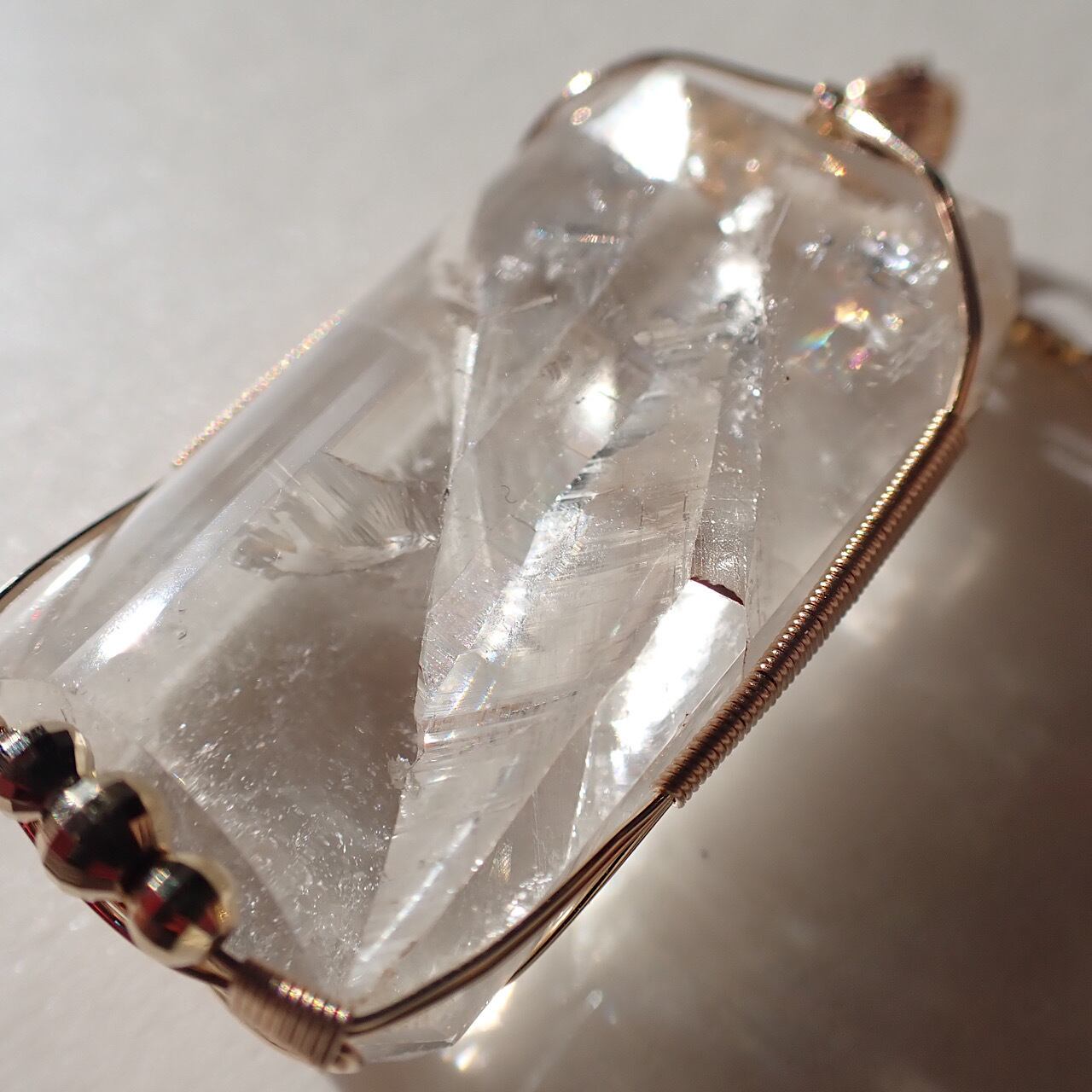 大きめスクエアのクオーツインクオーツの女神巻きジュエリーです。10Kビーズを使用しています。このルースは中のクリスタルがミカエルの剣のイメージと重なり白いもやのような部分が羽のようで想像力を掻き立てられます。本当に力強くて見ているうちにこちら側にも強い光が伝わってくるような感覚になります。世界の安寧に想いを馳せたくなるような愛の深いクリスタルかもしれません。様々なインスピレーションを与えてくれそうな唯一無二のルースです☆