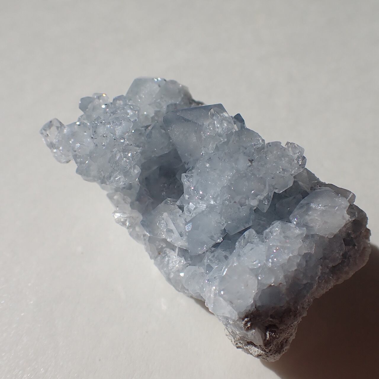 マダガスカルの小さなセレスタイト原石です。小さな玉のような結晶の集まりと、小さめのポイントがある水色のセレスタイトです。