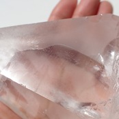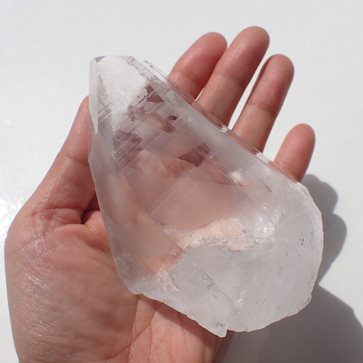 ブラジル・ディアマンティーナ産の大きなクリスタルです。表面がうっすら白い部分があるので透明の部分と模様を創り出しているような原石です。長さはないですが大きな迫力ある単結晶です。また自然にできた模様が水や氷、みずみずしさを感じさせてくれ、女神のような神々しさです。安定したエネルギーを持つ水晶ですが、こちらは特にそれを感じます。深く呼吸をするように整えるのが得意なのかもしれません。痛みのあるところに当ててみるのもオススメな水晶です。