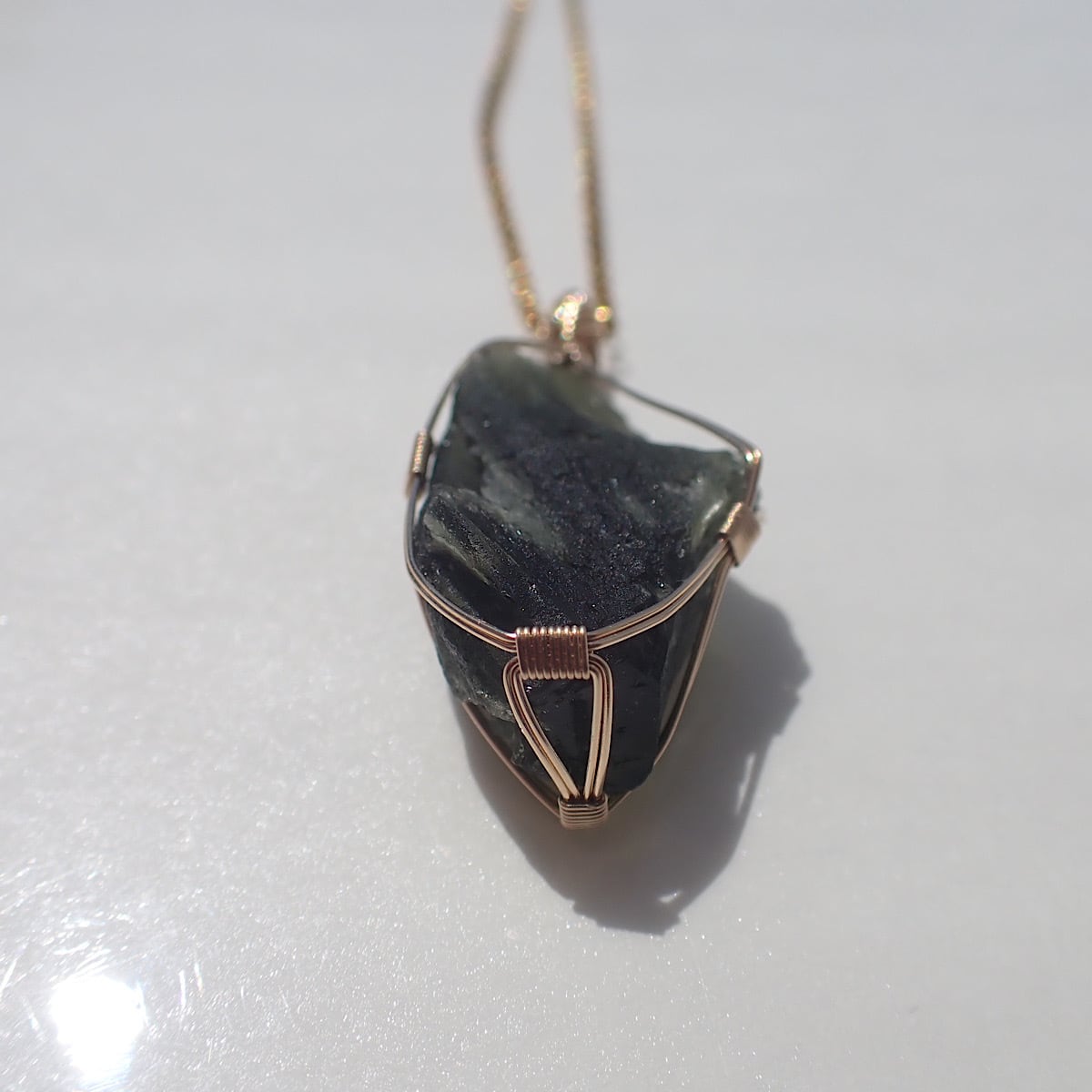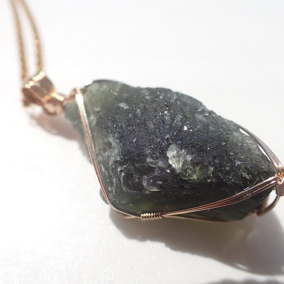 モルダバイト原石の女神巻きジュエリーです。最近巻いたモルダバイトの中では比較的大きいと思います。宇宙の渦の中にいるように宇宙エネルギーを届けてくれると思います。モルダバイトを巻く時は宇宙からその感覚を受け取って巻き始める事も多いですが、このモルダバイトもその感覚は強かったです。必要な方に届きますように☆
