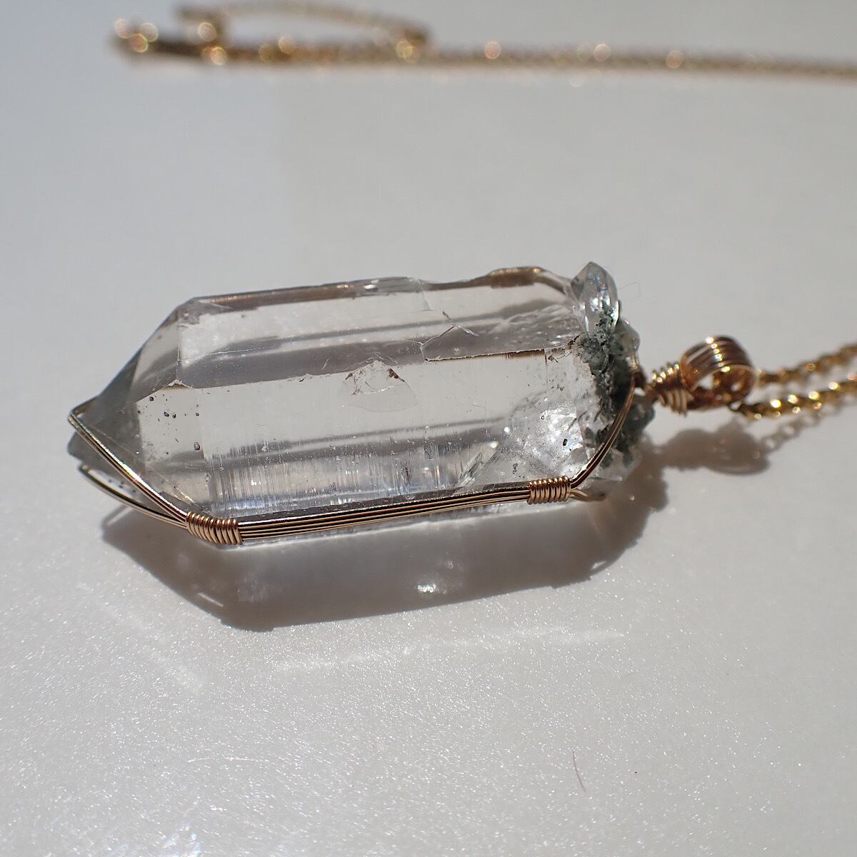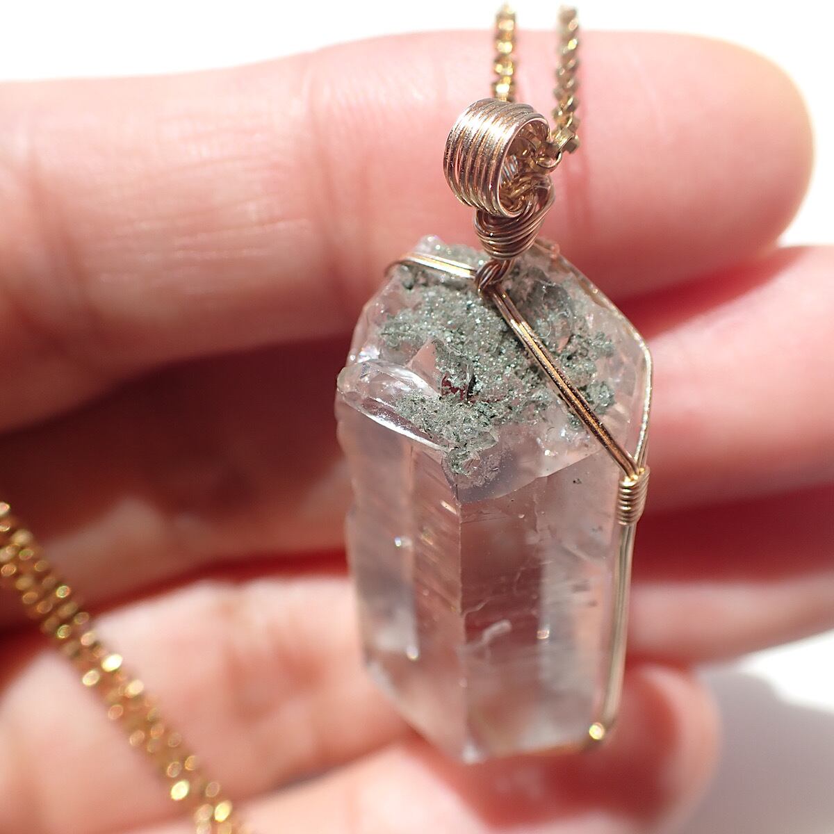 ヒマラヤ、マニハール水晶の原石ポイントの女神巻きジュエリーです。上部についたクローライトもマニハール水晶らしくてとても素敵です。