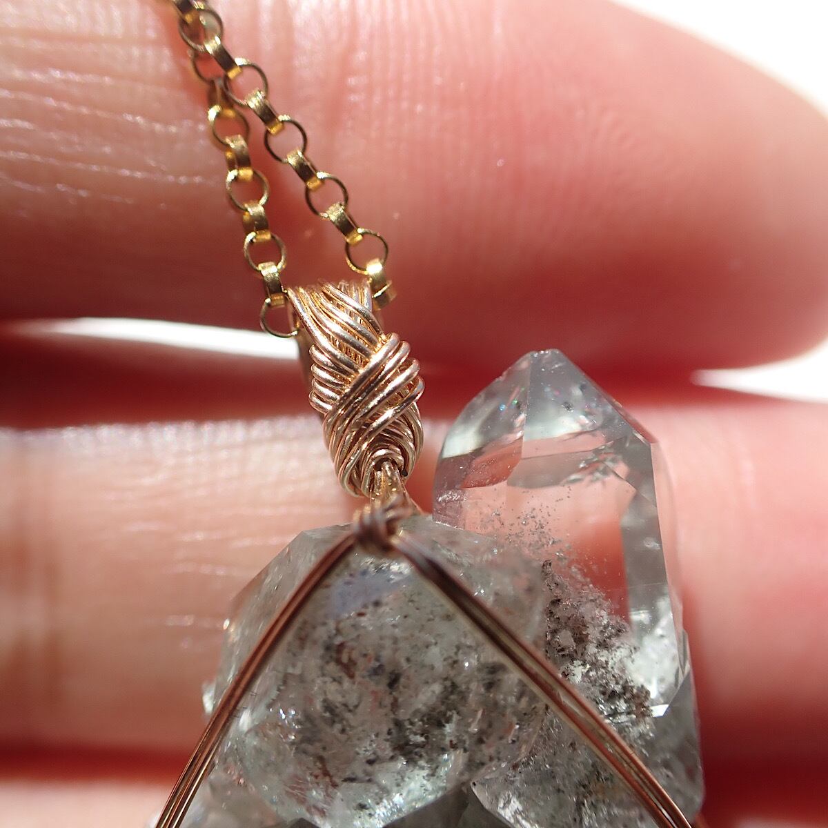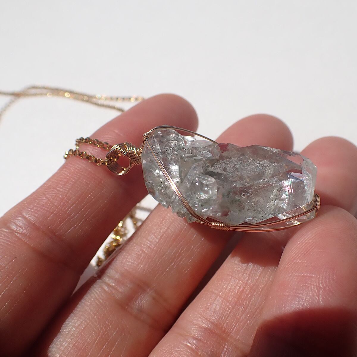 ヒマラヤ・マニハール水晶クラスターの女神巻きジュエリーです。小さな結晶が重なりその隙間に内包物があります。下部には虹も出ている小さなクラスターのユニークなペンダントトップです。