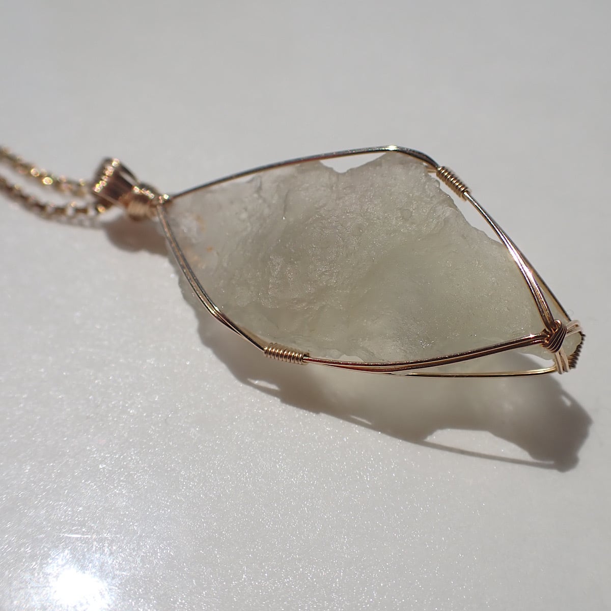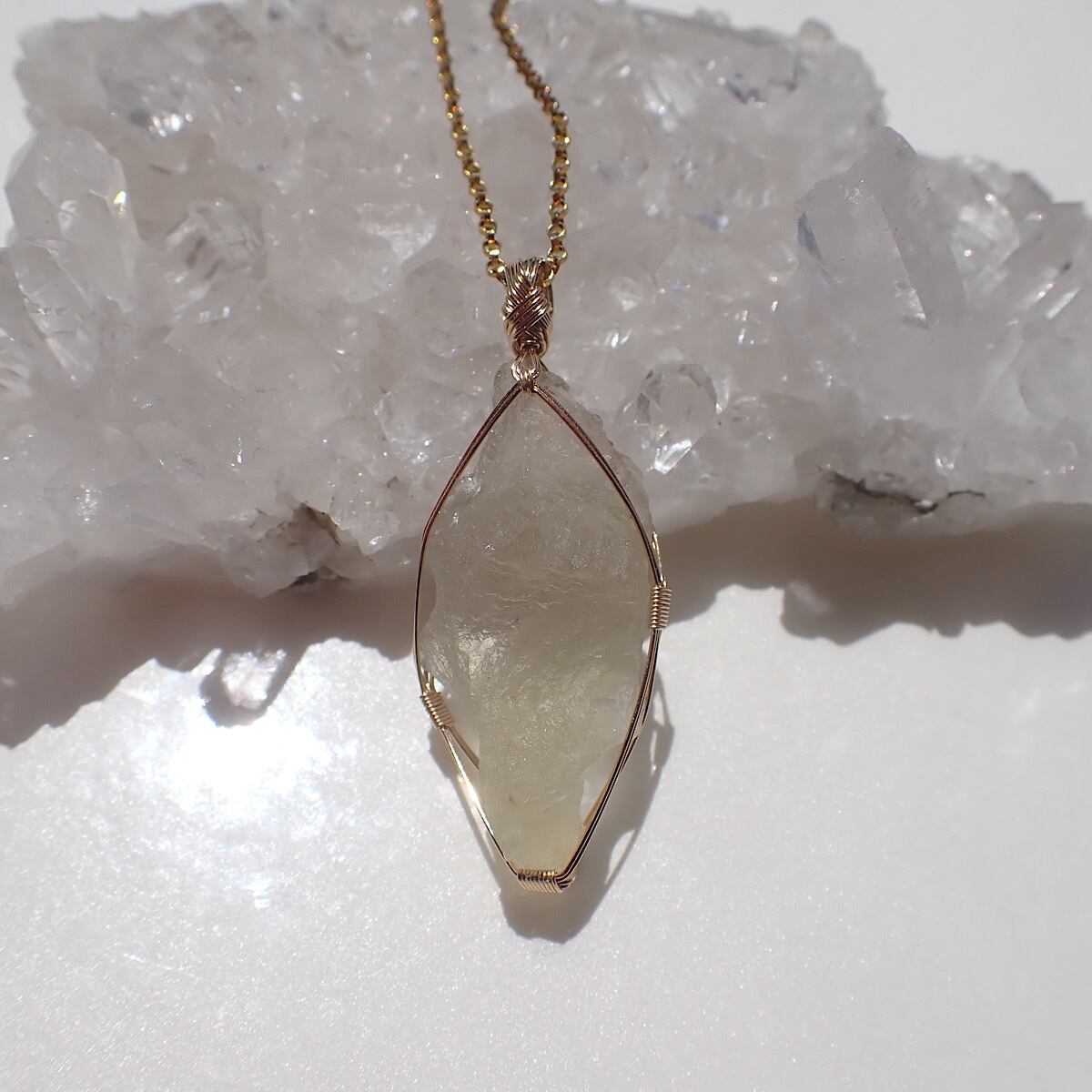 色の薄いリビアングラス原石です。白に近いイエローのリビアンもかわいいです。形もインパクトガラスらしい不思議な感じですがペンダントトップとして着けた時にとても収まりが良いです。