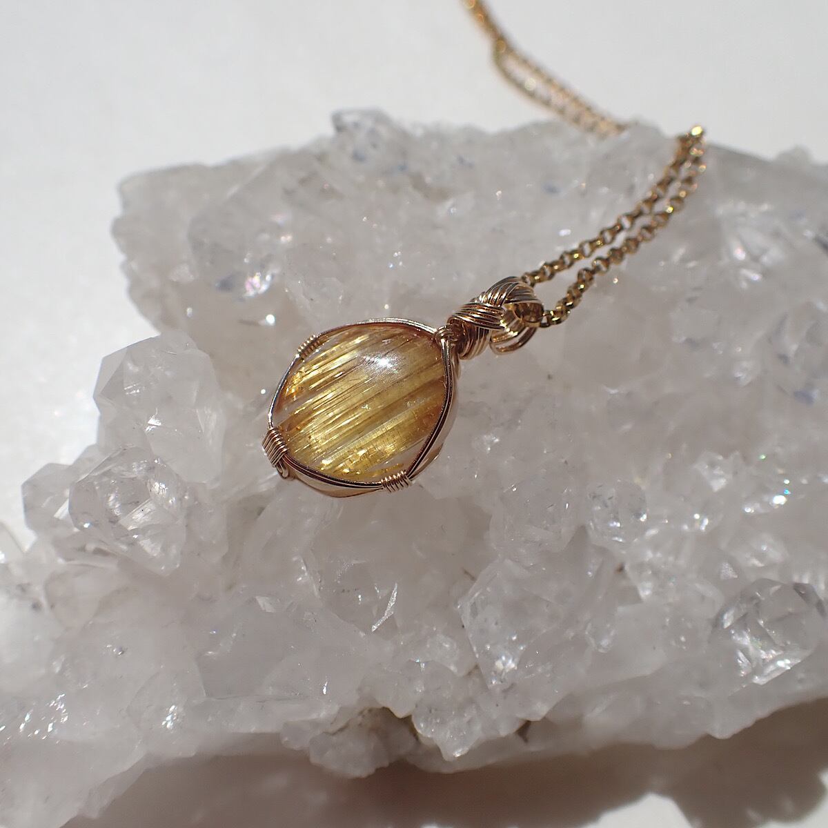 沢山の金針、またその光がとても強く、遠くから見るとゴールドのペンダントに見えます。小さな水晶にみっちりとルチルが入ったとっても美しいルースです。素敵です☆