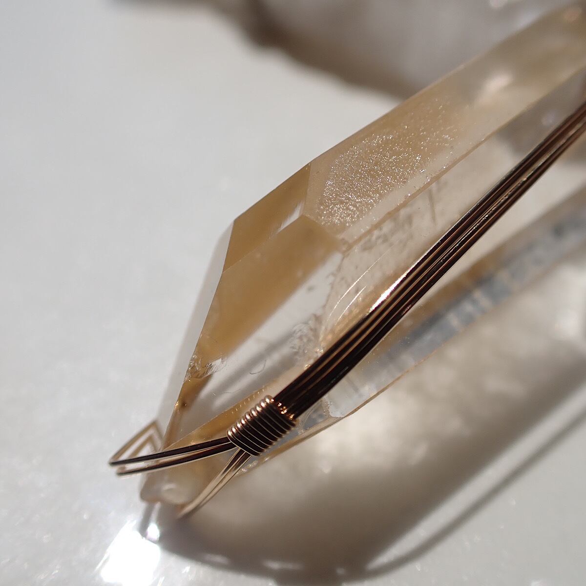 ブラジル・ゼッカデソーザのゴールデンレムリアンクリスタルです。レムリアンとなっていますがリッジは深くありません。ただタイムリンクとイシス(少しワイヤーがかぶっています)が隣り合って見られます。オレンジとイエローの間のような色も独特でかわいいですが透明の部分はとてもクリアです。