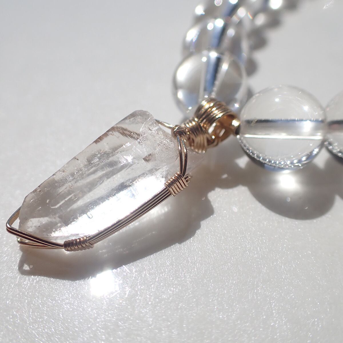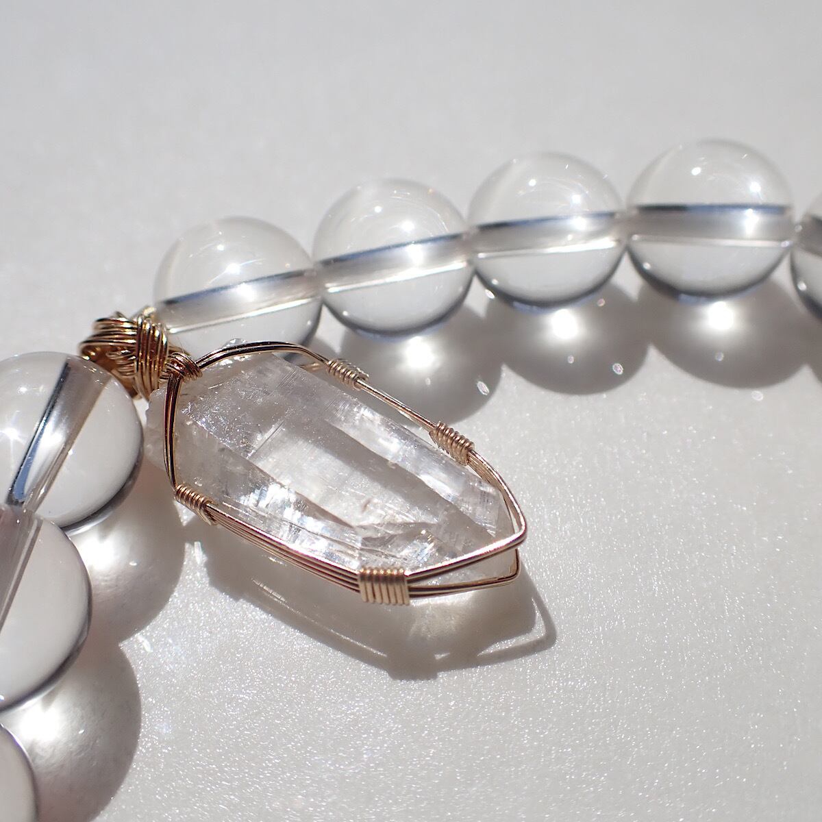 女神巻きペンダントトップが一つ入ったブレスレットです。丸玉はとても美しい高品質ブラジル産の8mmの水晶を使用しています。女神巻きに使用しているのは小さめの乙女鉱山(山梨県)の国産水晶です。簡単に装着でき、エネルギーを感じやすいゴムのブレスレットなので使いやすく、女神巻きジュエリーの美しさ、神々しさが際立つのではないでしょうか。